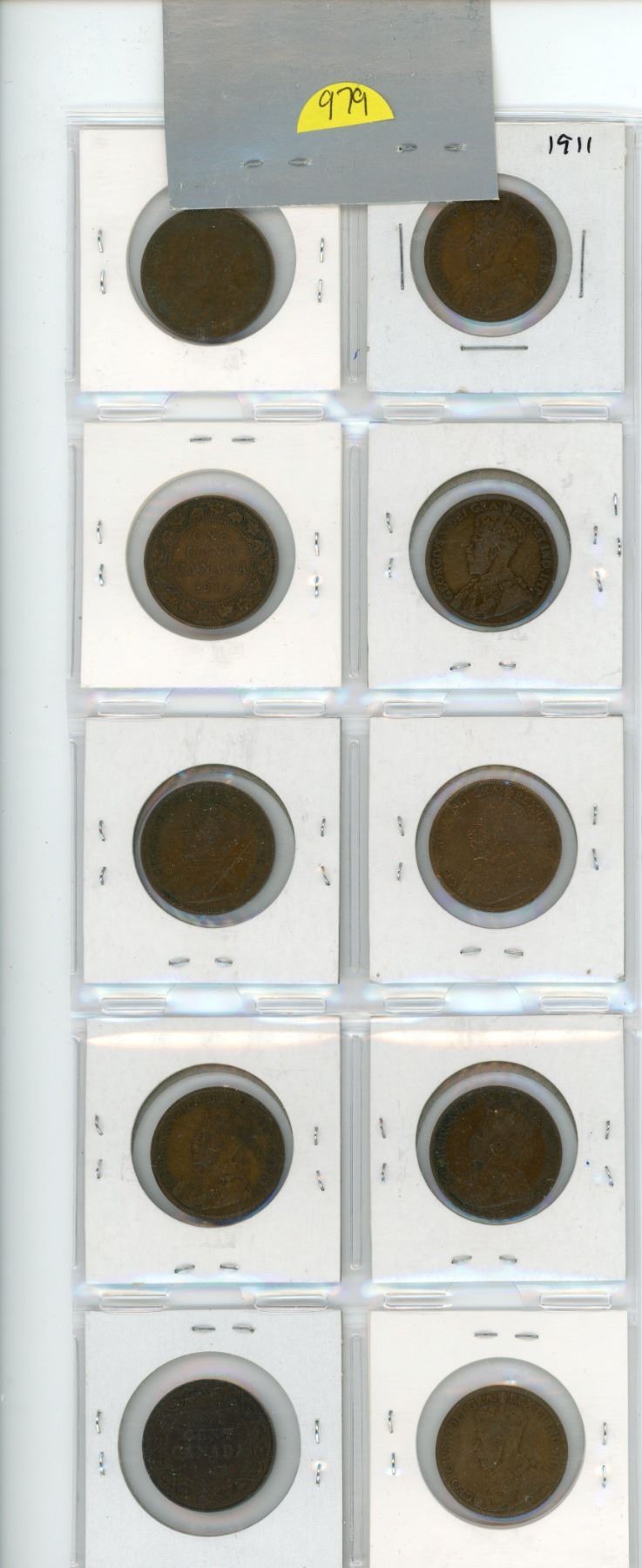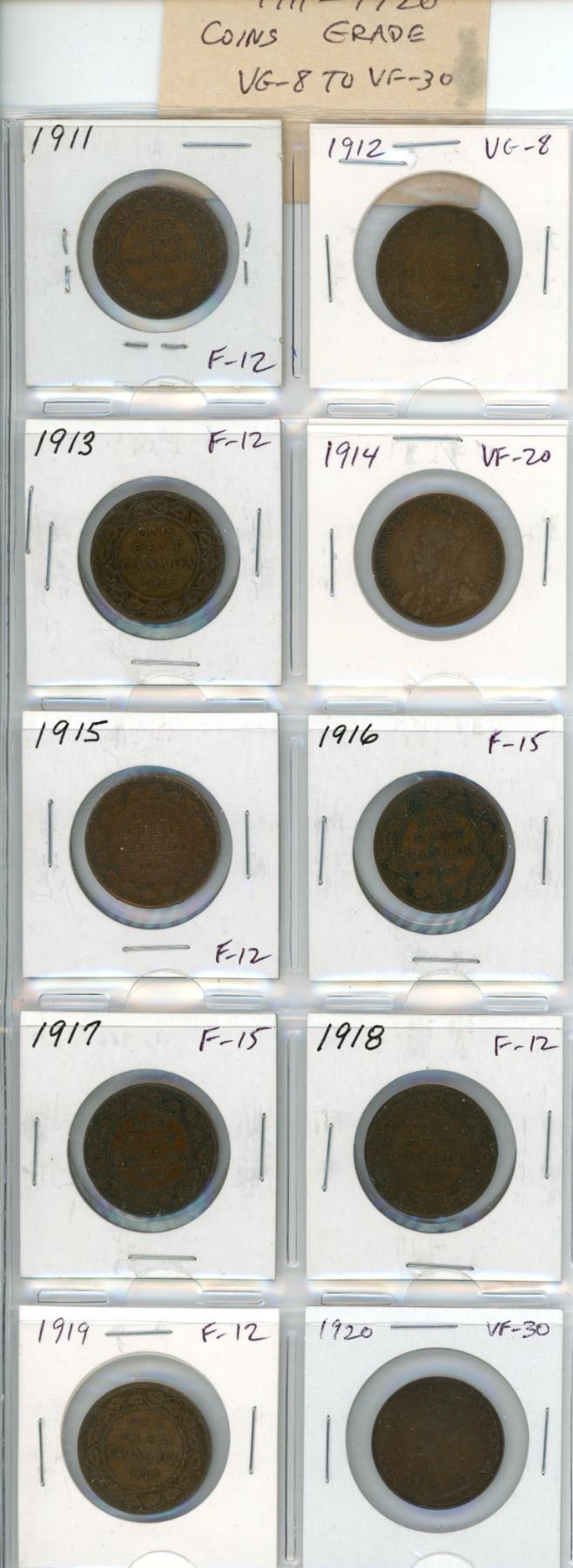 Complete Set of 10 Canadian George V Large Cents 1911 to 1920. Includes scarce 1915. Coins grade Very Good to Very Fine. A nice selection.