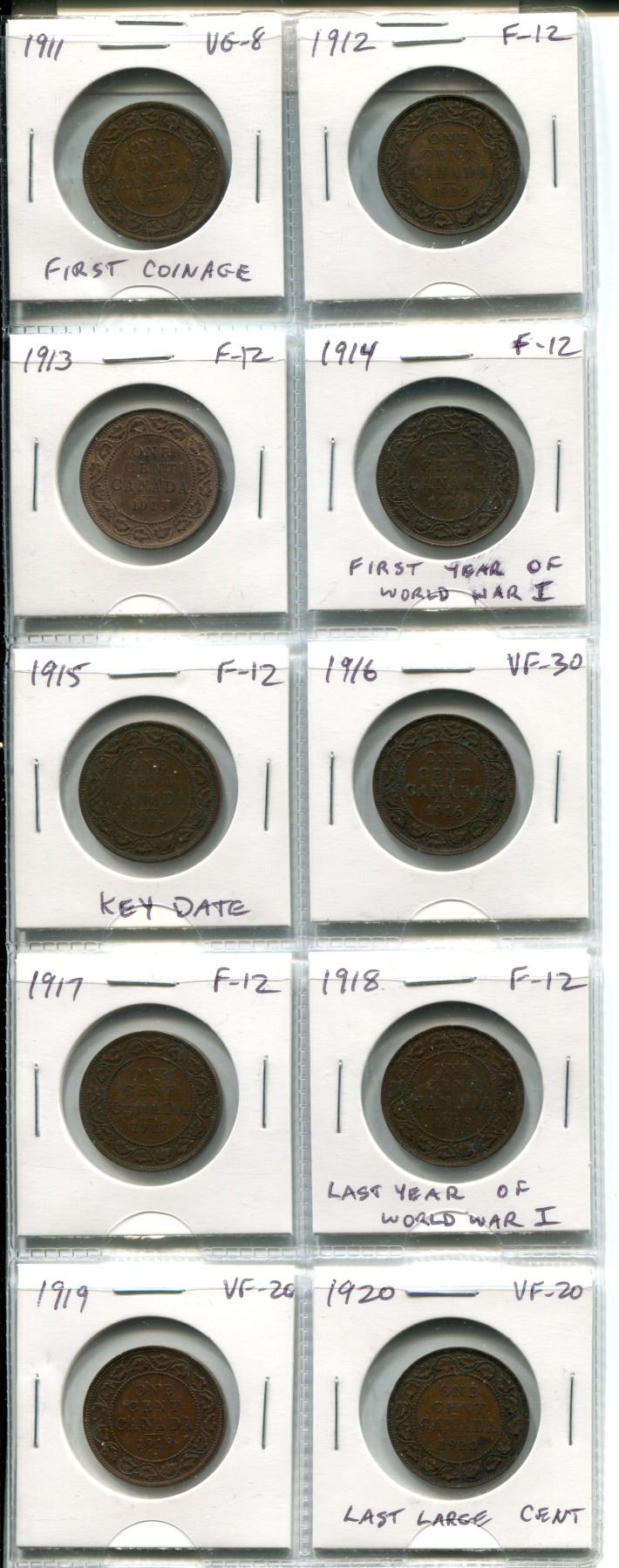 Complete Set of 10 Canadian George V Large Cents. Includes 1911, 1912, 1913, 1914, 1915, 1916, 1917