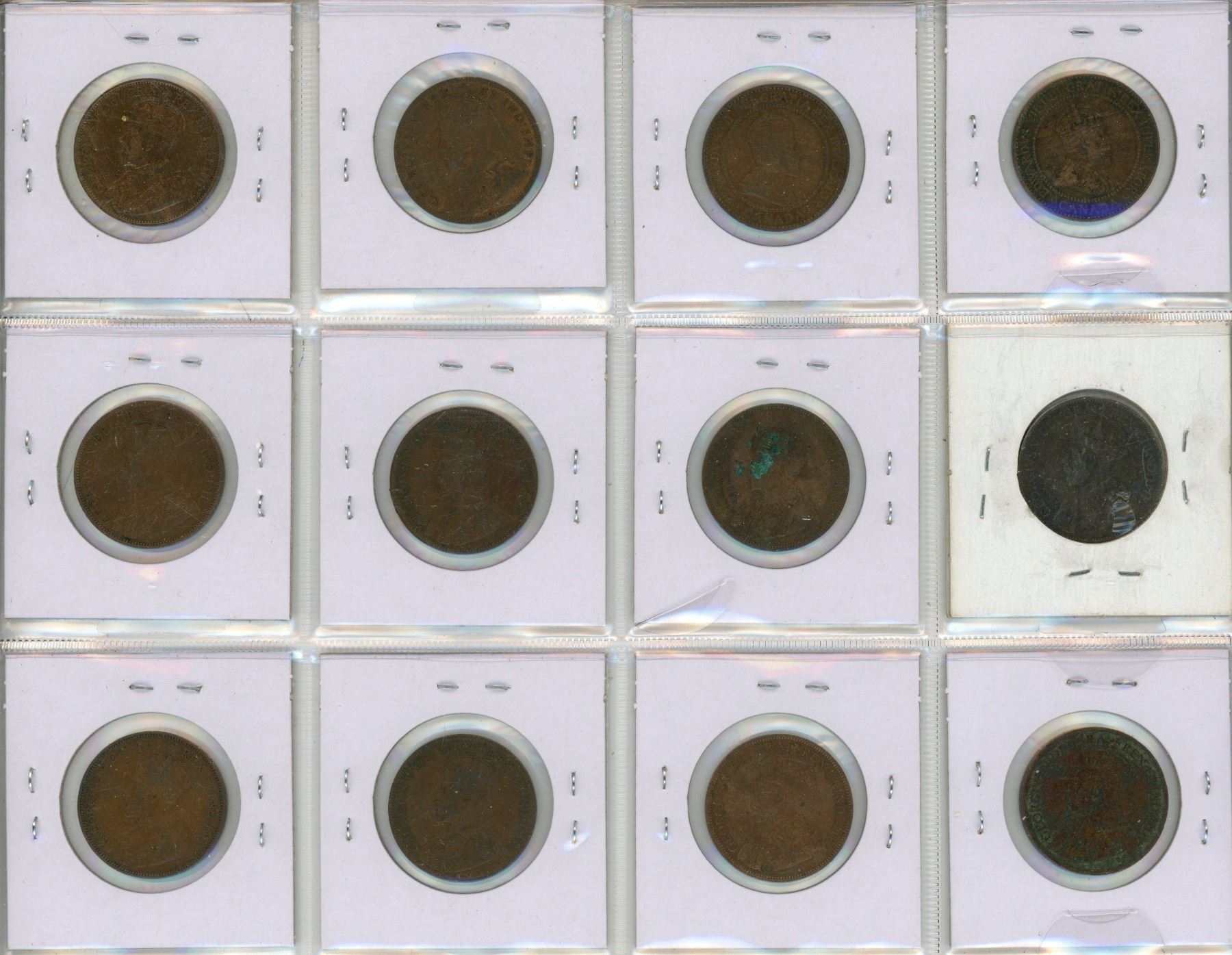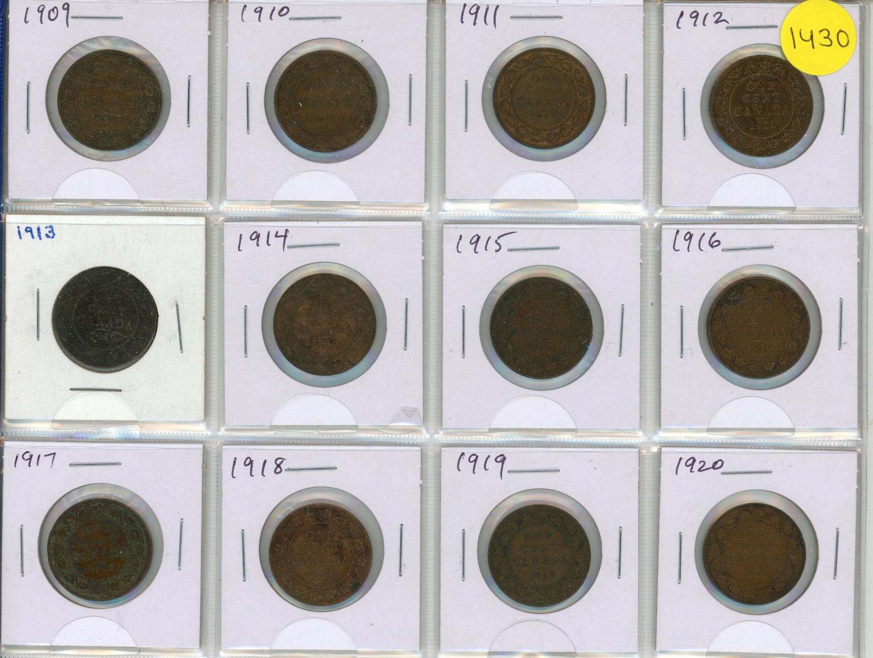 Complete Set of 12 Canadian Large Cents from 1909 to 1920.