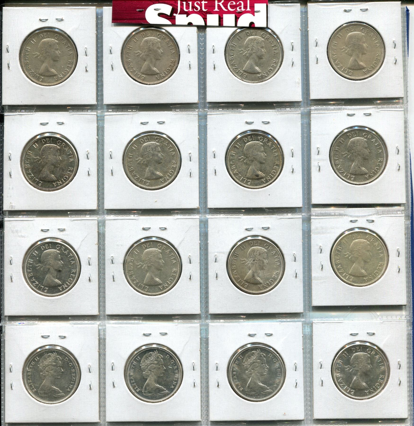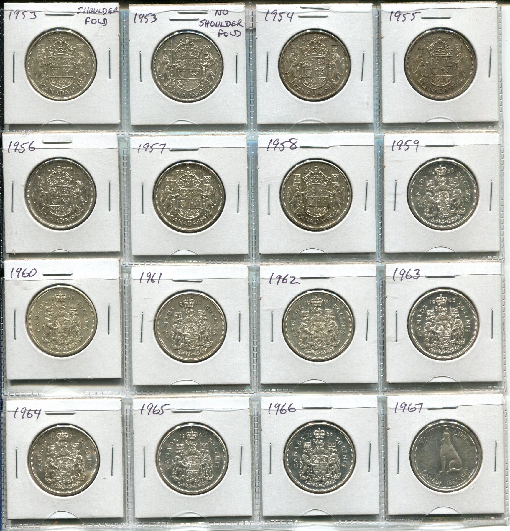Complete Set of 16 Canadian Queen Elizabeth Silver 50 Cents 1953 – 1967. Includes both 1953 SF & NSF. Coins grade EF-40 to BU.