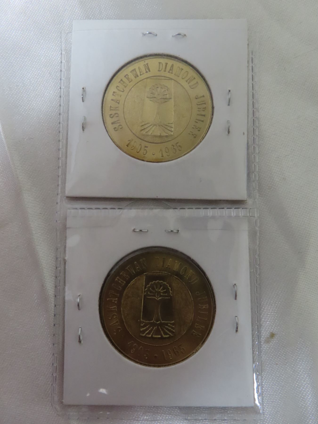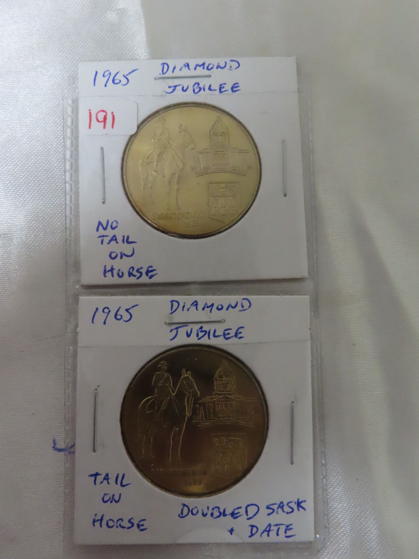 Complete Set of 2 1965 Saskatchewan Diamond Jubilee medal varieties. Includes no tail on horse & Scarce tail on horse with Doubled SASKATCHEWAN & date.