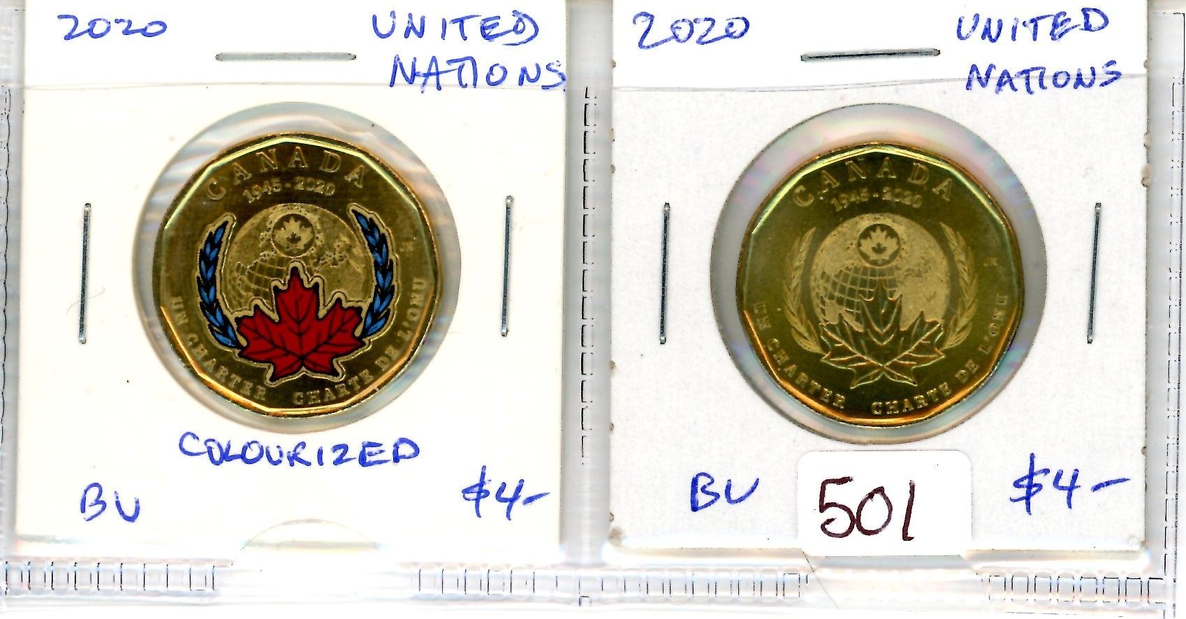 Complete Set of 2 2020 United Nations Loonies. Includes Colourized & Regular. BU from original rolls.