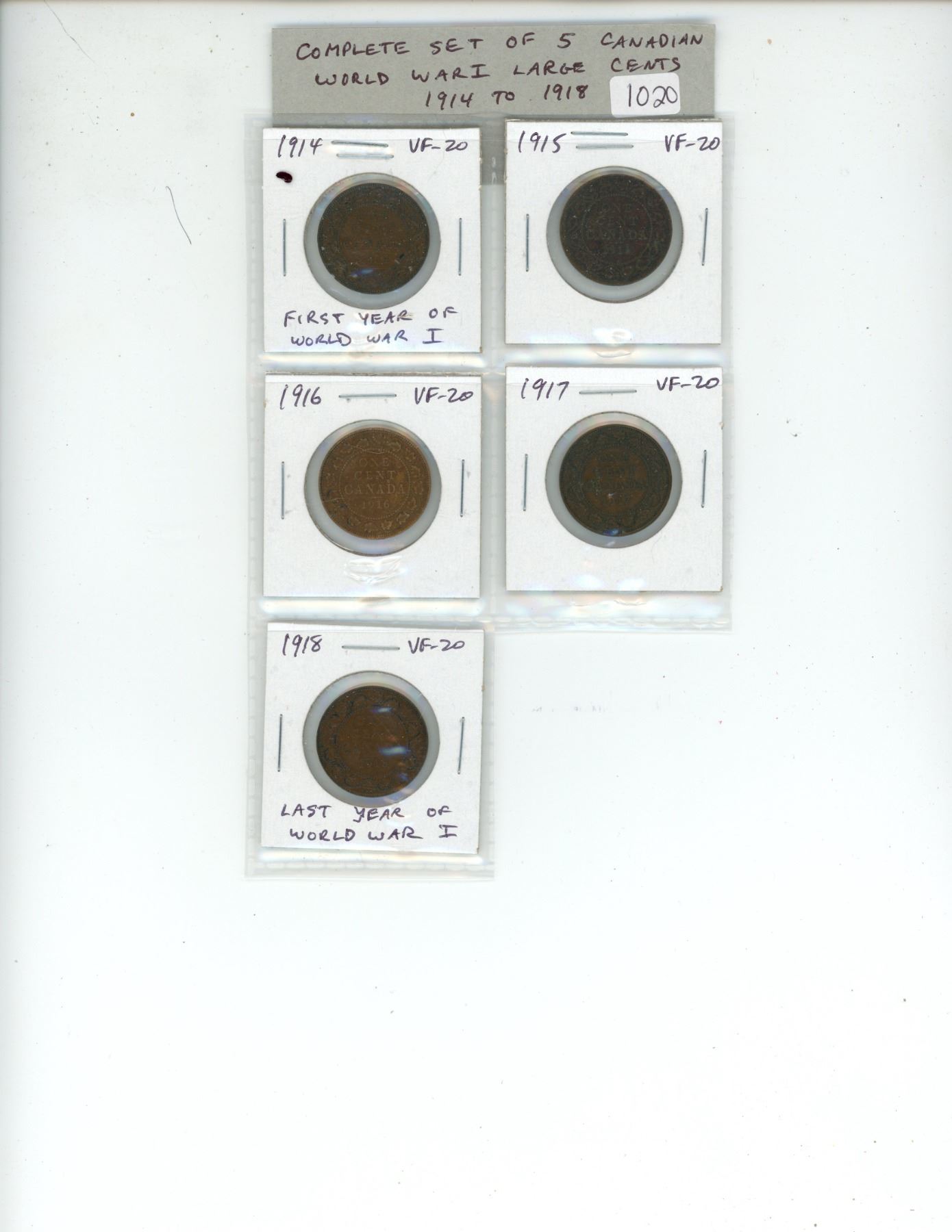 Complete Set of 5 Canadian World War I Large Cents. Includes 1914, 1915, 1916, 1917 & 1918. Coins gr