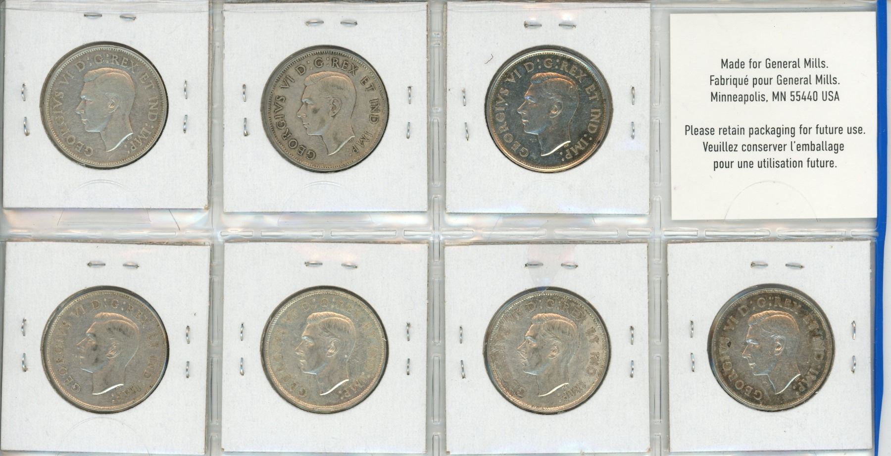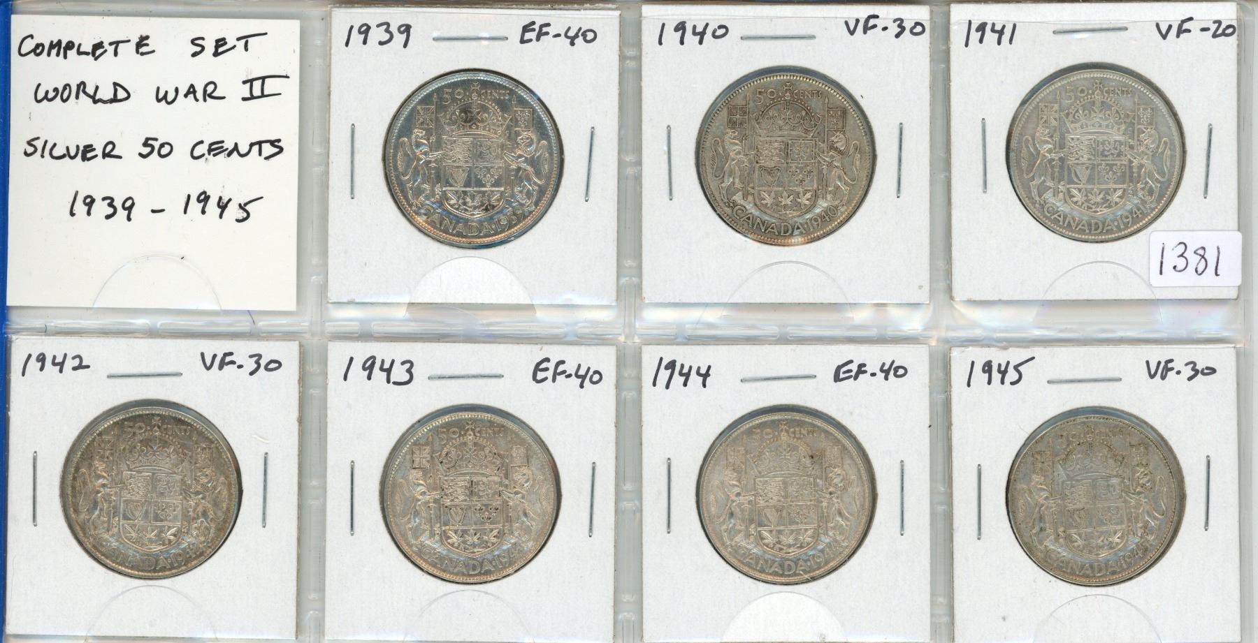 Complete Set of 7 Canadian World War II Silver 50 Cents 1939 – 1945. Coins grade VF-20 to EF-40. A nice lot.