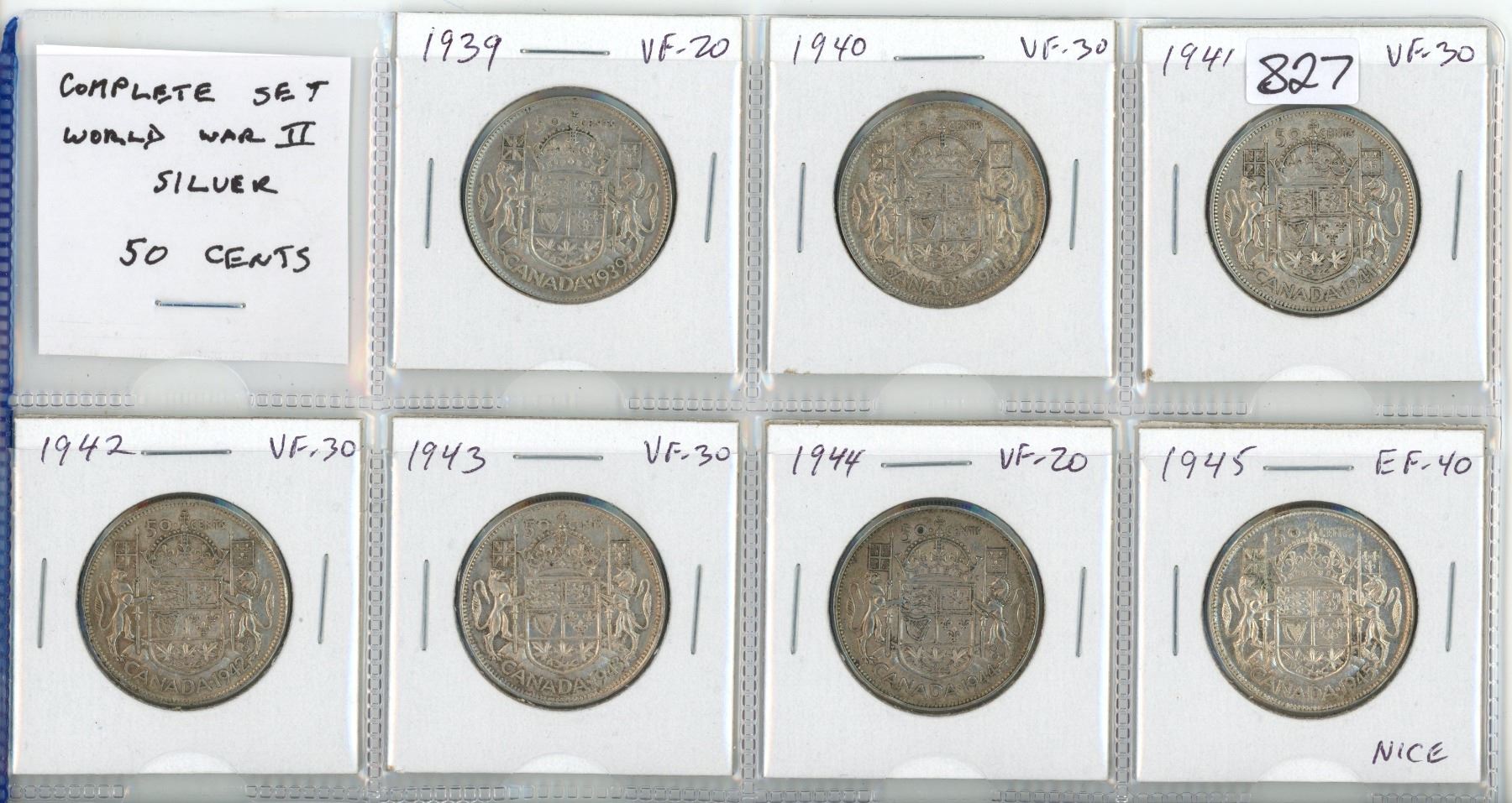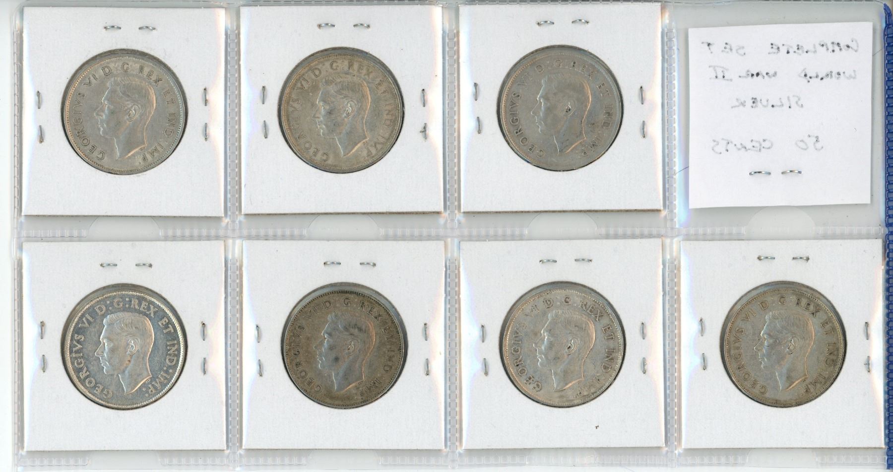 Complete Set of 7 Canadian World War II Silver 50 Cents. Includes 1939, 1940, 1941, 1942, 1943, 1944