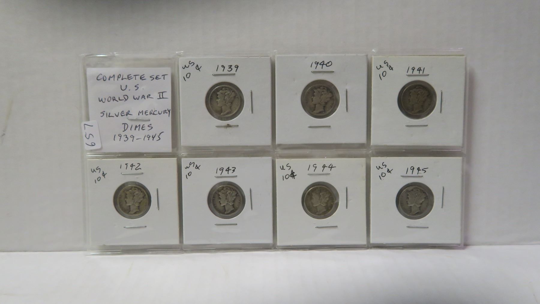 Complete Set of 7 U.S. World War II Silver Mercury Dimes. Includes 1939, 1940, 1941, 1942, 1943, 1944 & 1945.