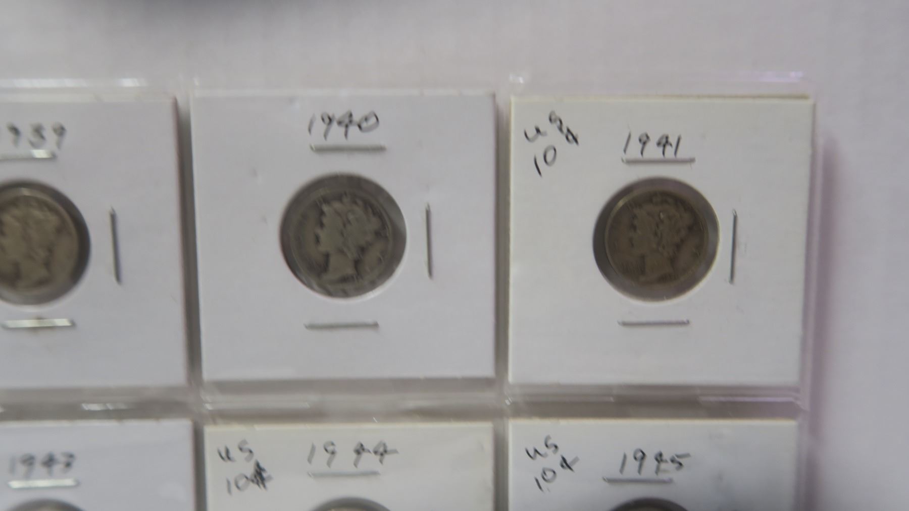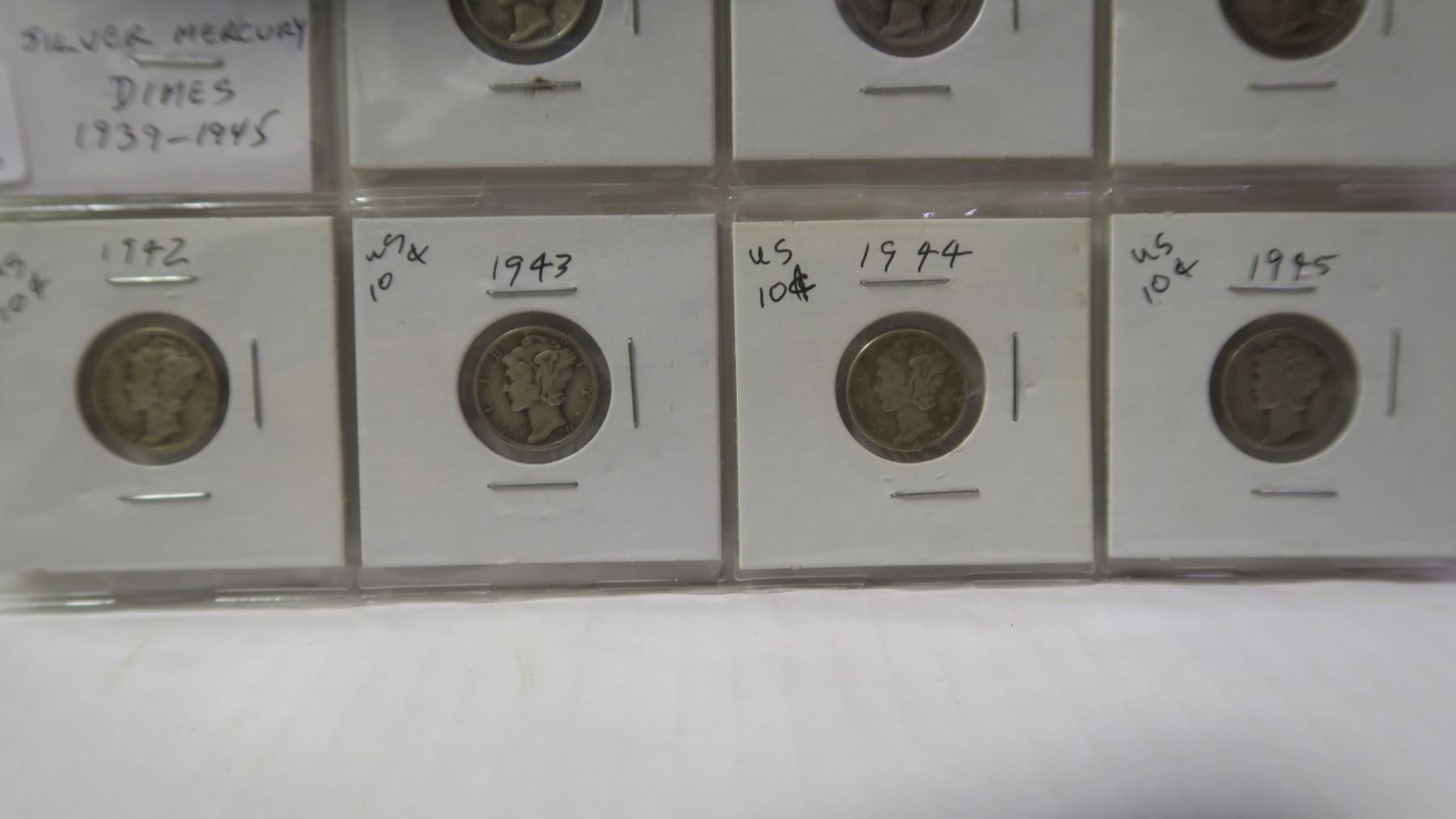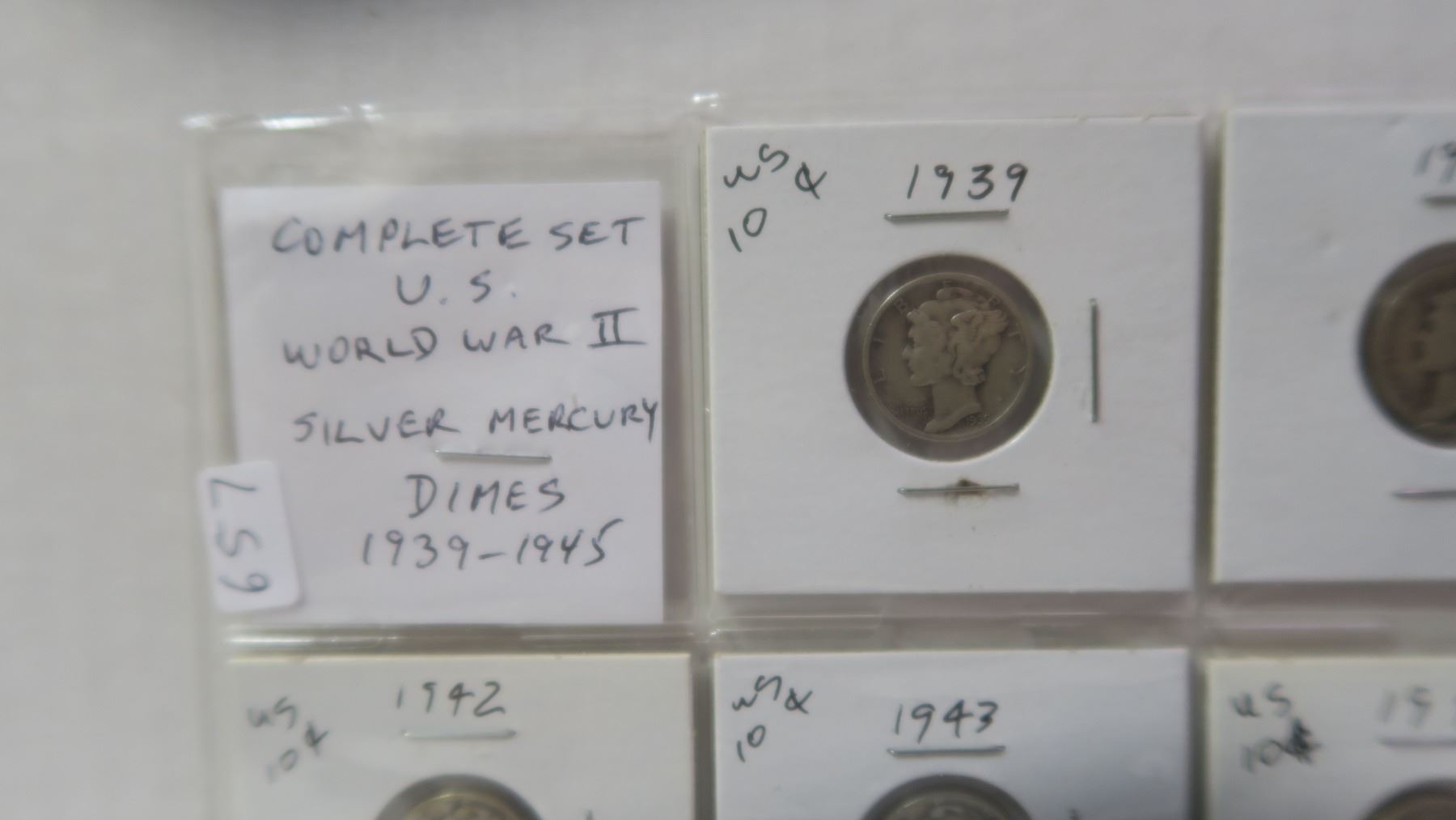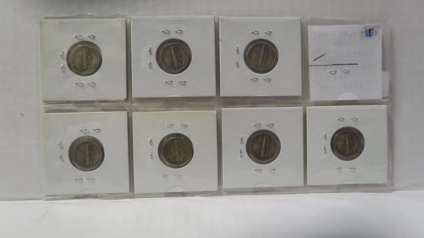 Complete Set of 7 U.S. World War II Silver Mercury Dimes. Includes 1939, 1940, 1941, 1942, 1943, 194