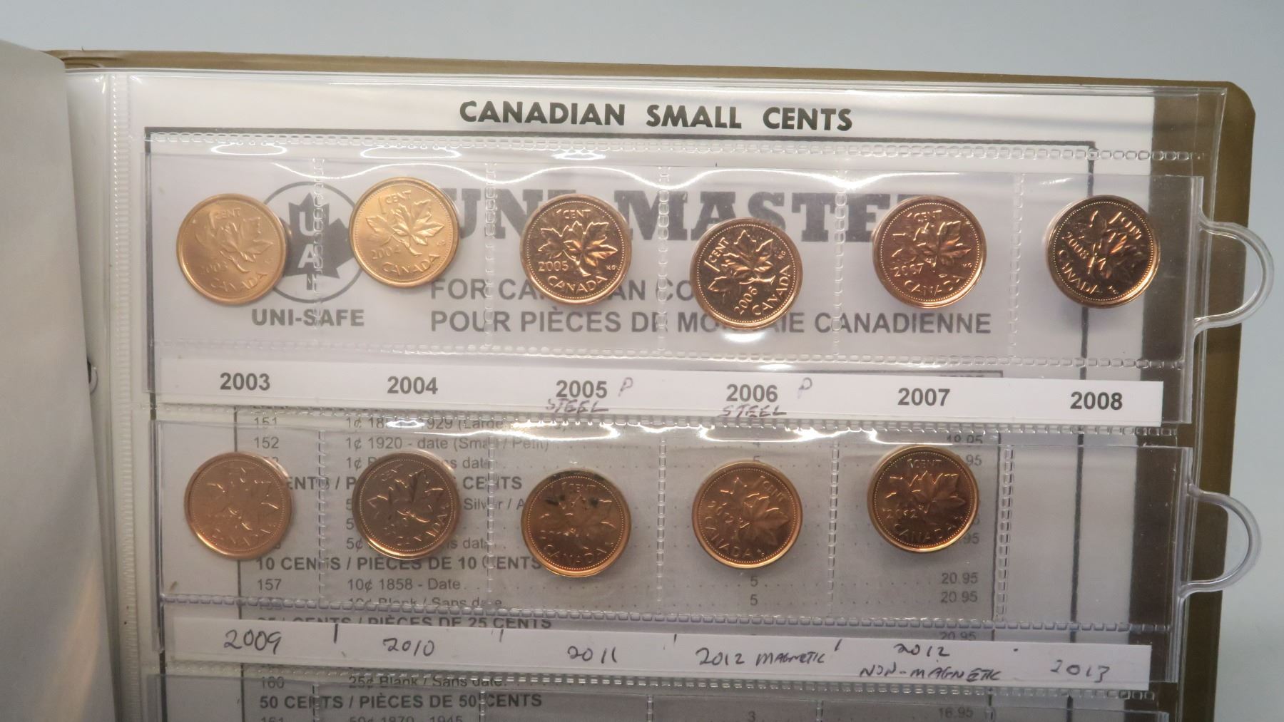 Complete Set of Canadian Small Cents 1920 – 2012. Includes Key Dates 1922, 1923, 1924, 1925 & 1926. Coins grade F-12 to Brilliant Uncirculated plus several Proof Like coins. Housed in a Uni-Safe album. A nice collection.
