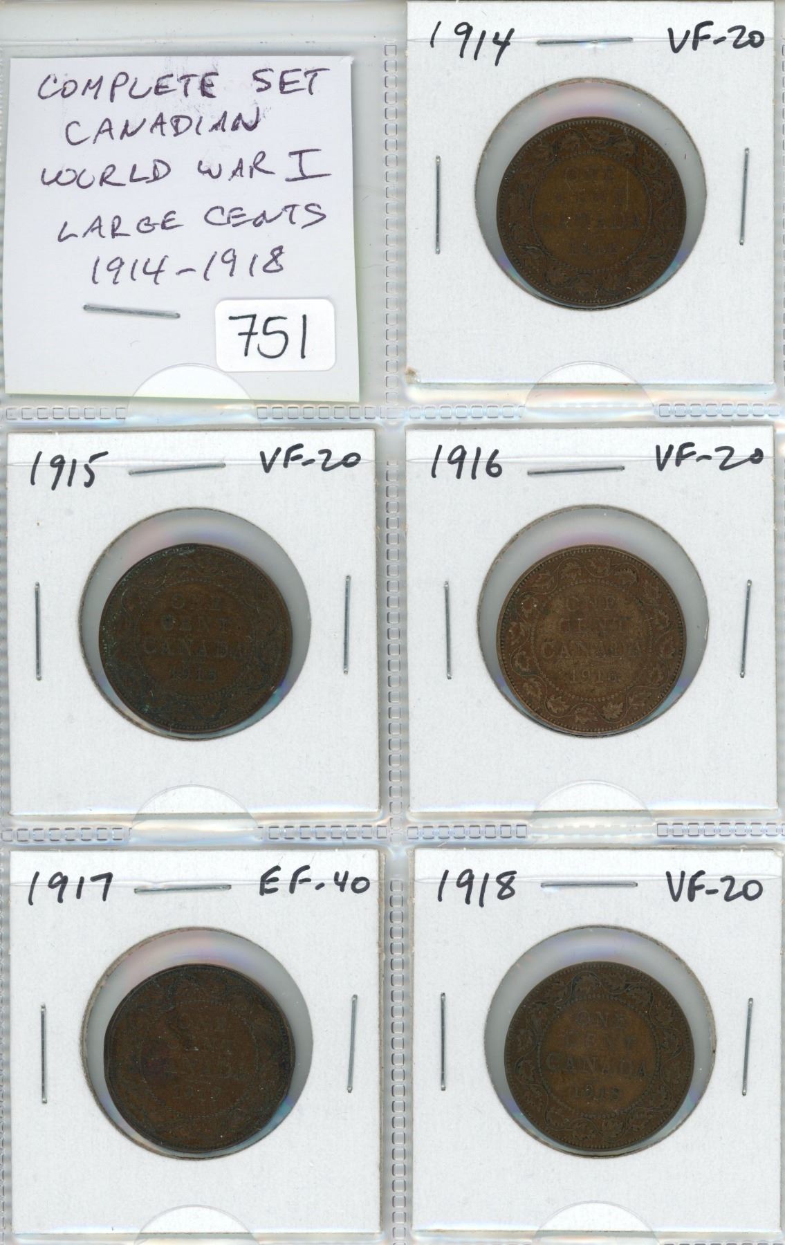 Complete Set of Canadian World War I Large Cents 1914 – 1918. Coins grade VF-20 to EF-40. A nice selection.