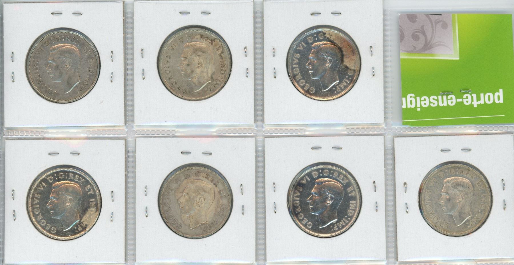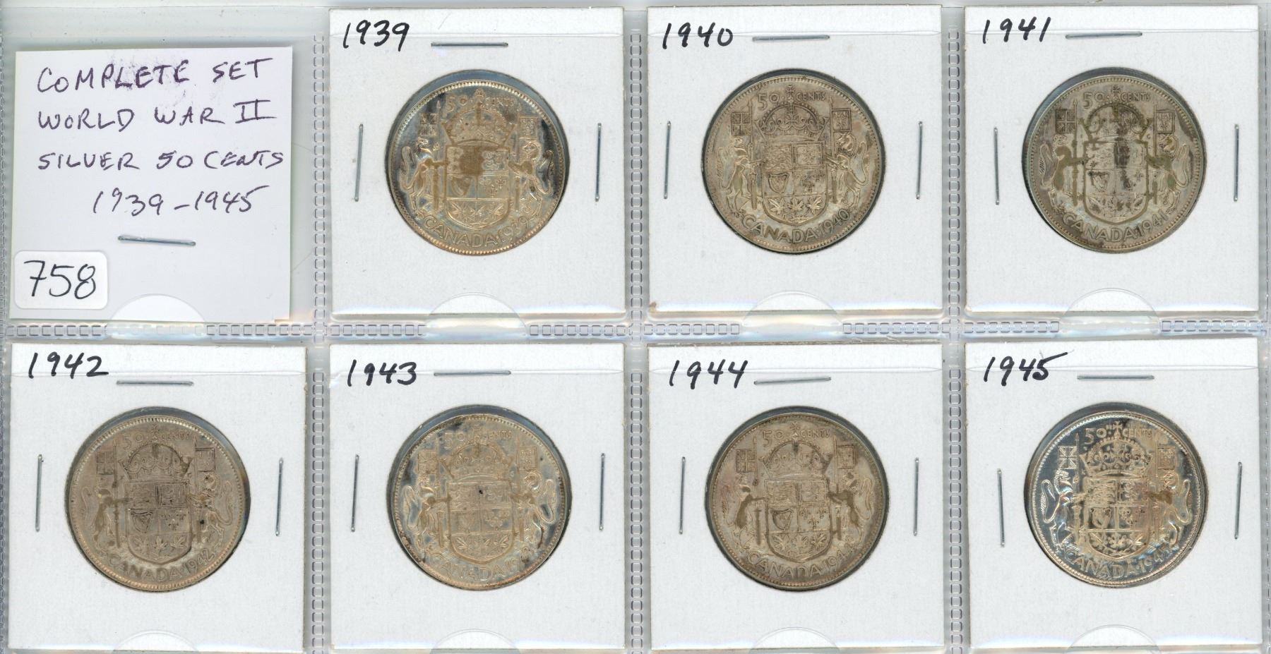 Complete Set of Canadian World War II Silver 50 Cents. Includes 1939, 1940, 1941, 1942, 1943, 1944 & 1945. Coins grade VF-20 to EF-40.
