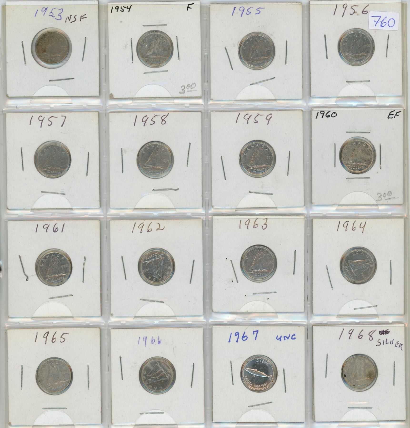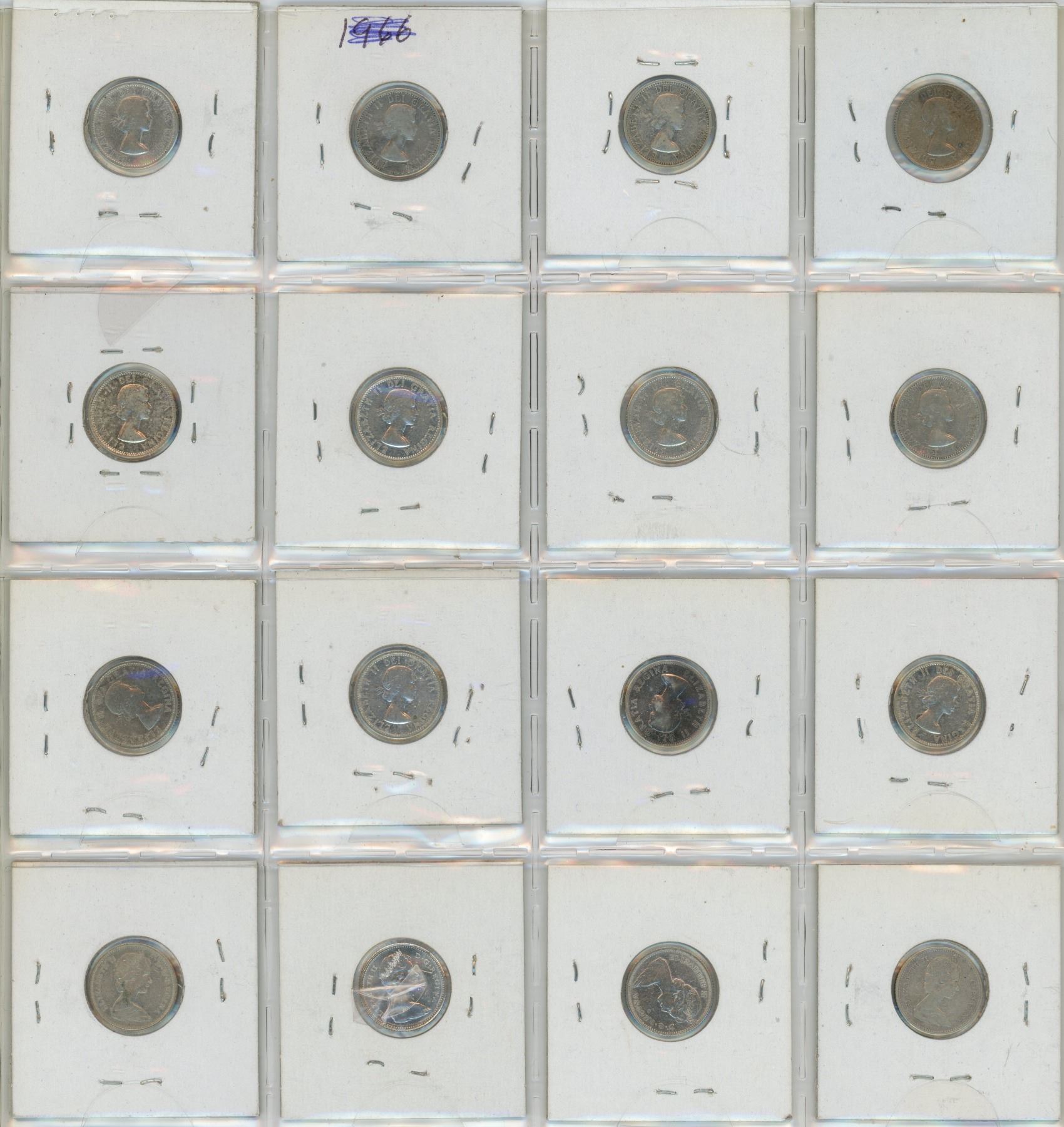 Complete Year Set of Canadian Elizabeth Silver 10 Cents. Includes 1953 NSF, 1954, 1955, 1956, 1957, 1958, 1959, 1960, 1961, 1962, 1963, 1964, 1965, 1966, 1967 & 1968 Silver. Coins grade Fine to Uncirculated. A nice selection.