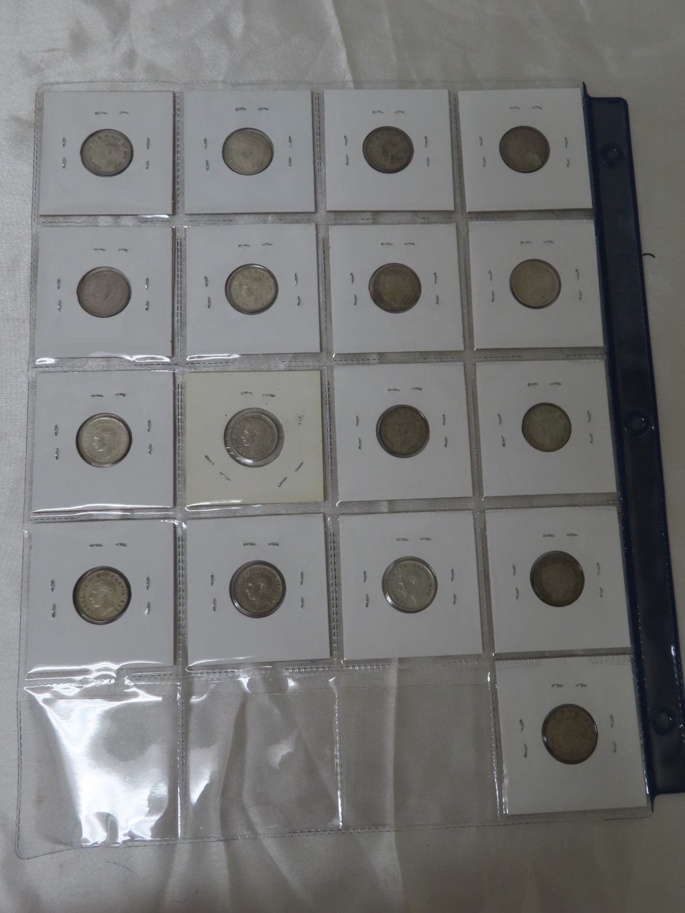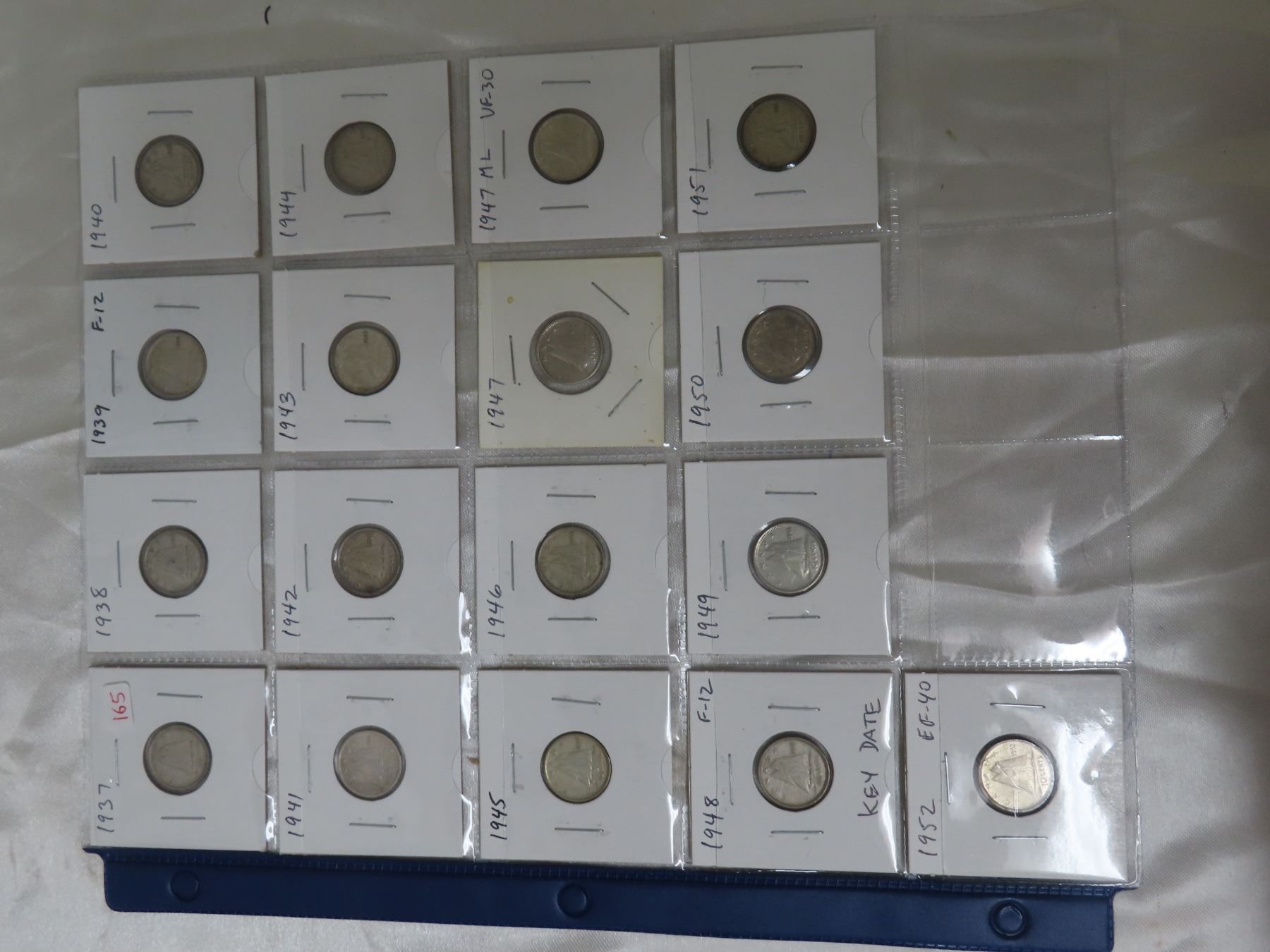 Complete Year Set of Canadian George VI Silver 10 Cents. Dates include 1937, 1938, 1939, 1940, 1941, 1942, 1943, 1944, 1945, 1946, 1947, 1947 Maple Leaf, 1948, 1949, 1950, 1951 & 1952. Coins grade up to EF-40.