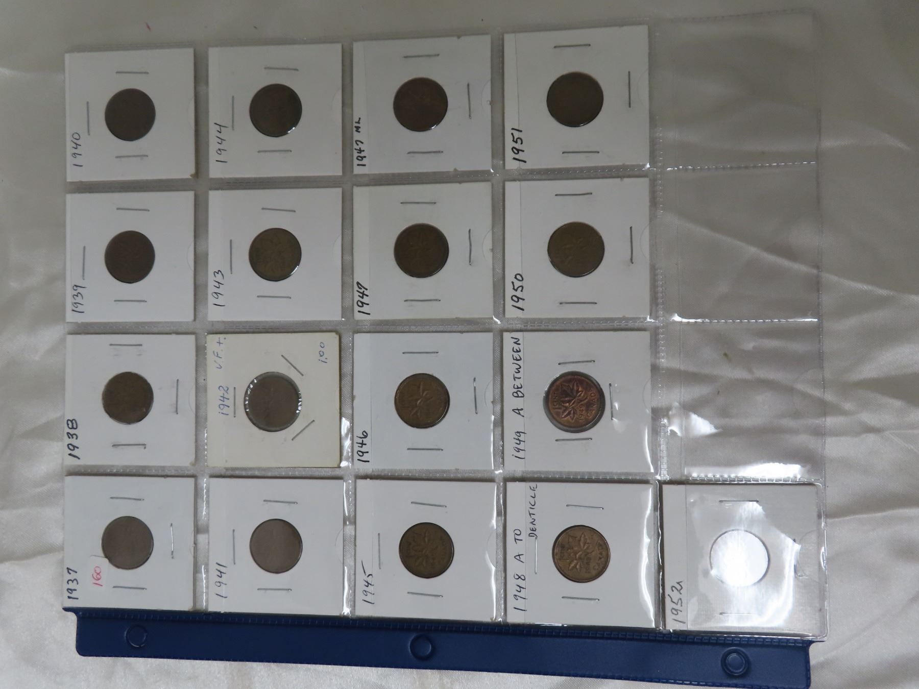 Complete Year Set of Canadian George VI Small Cents. Includes 1937, 1938, 1939, 1940, 1941, 1942, 1943, 1944, 1945, 1946, 1947, 1947 Maple Leaf, 1948 A to Denticle, 1949 A Between Denticles, 1950, 1951 & 1952. Coins grade up to Uncirculated.