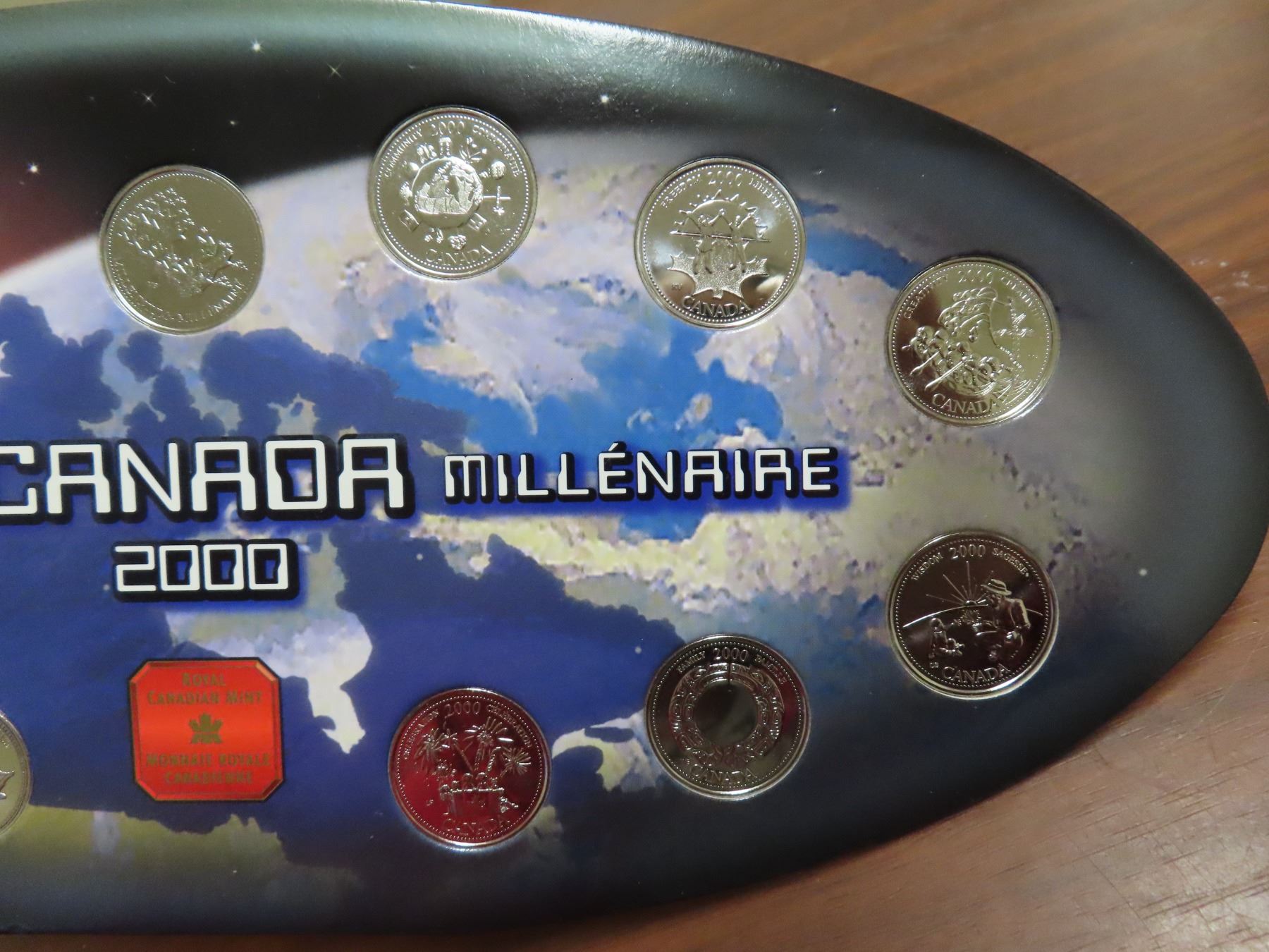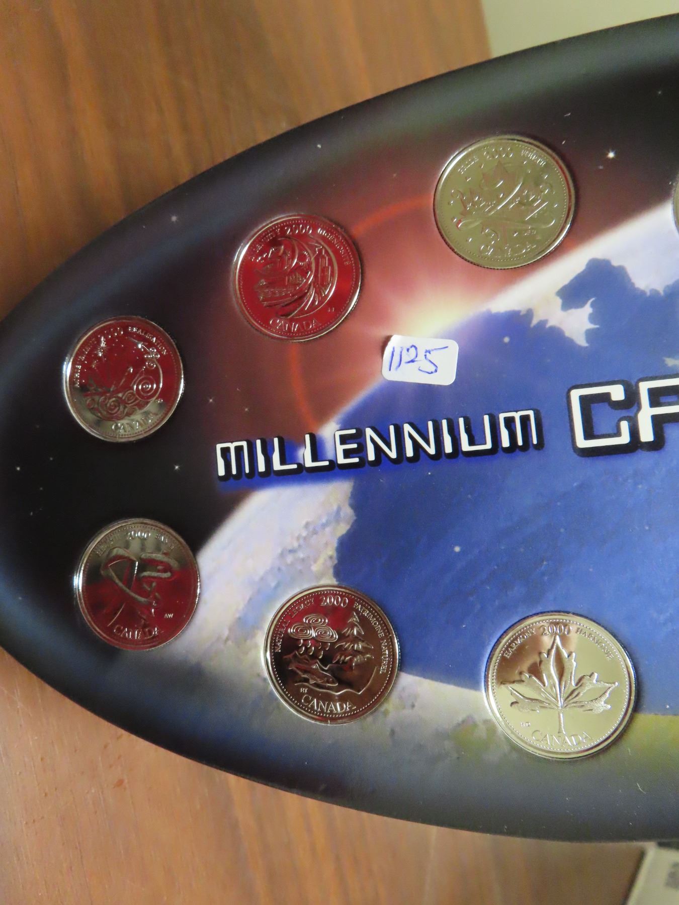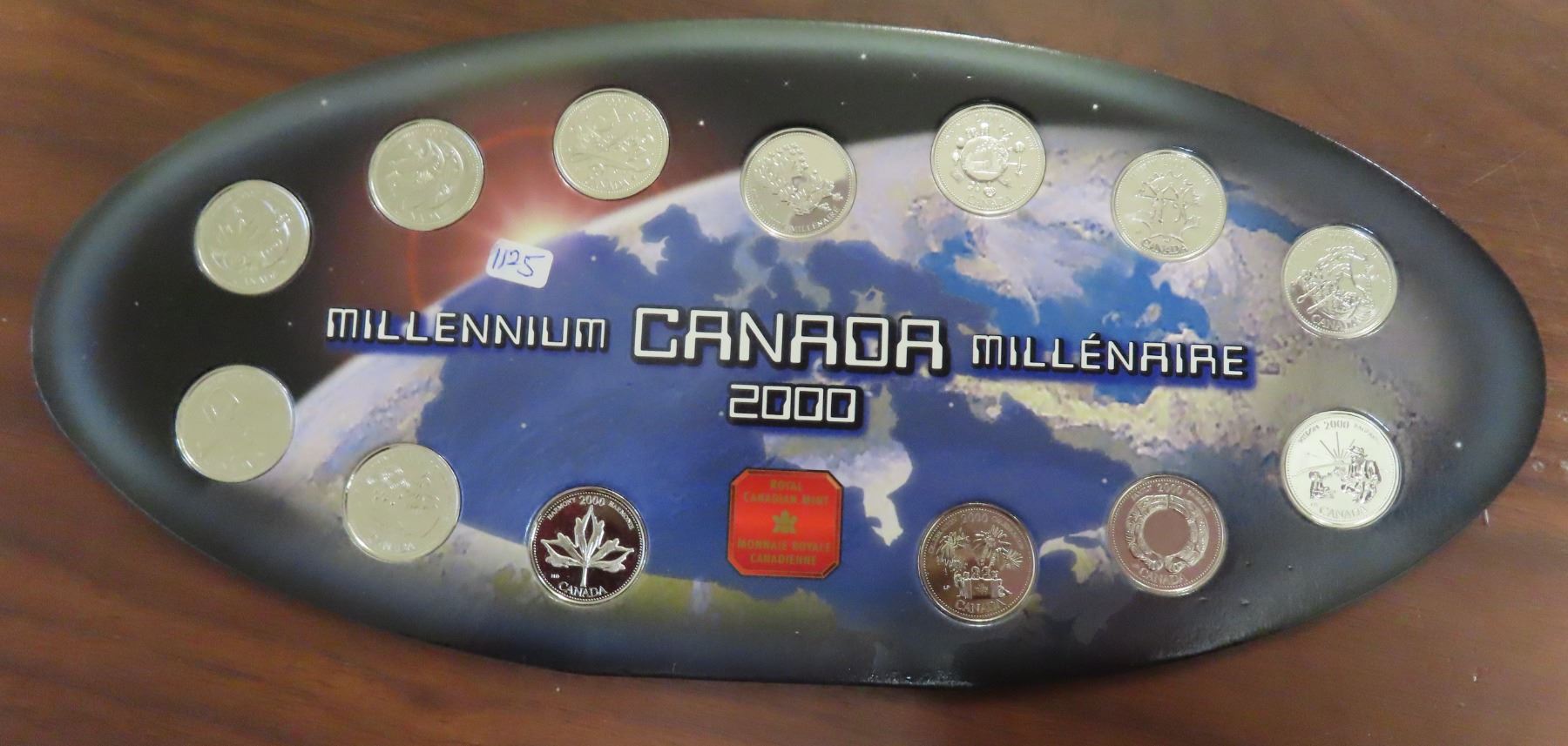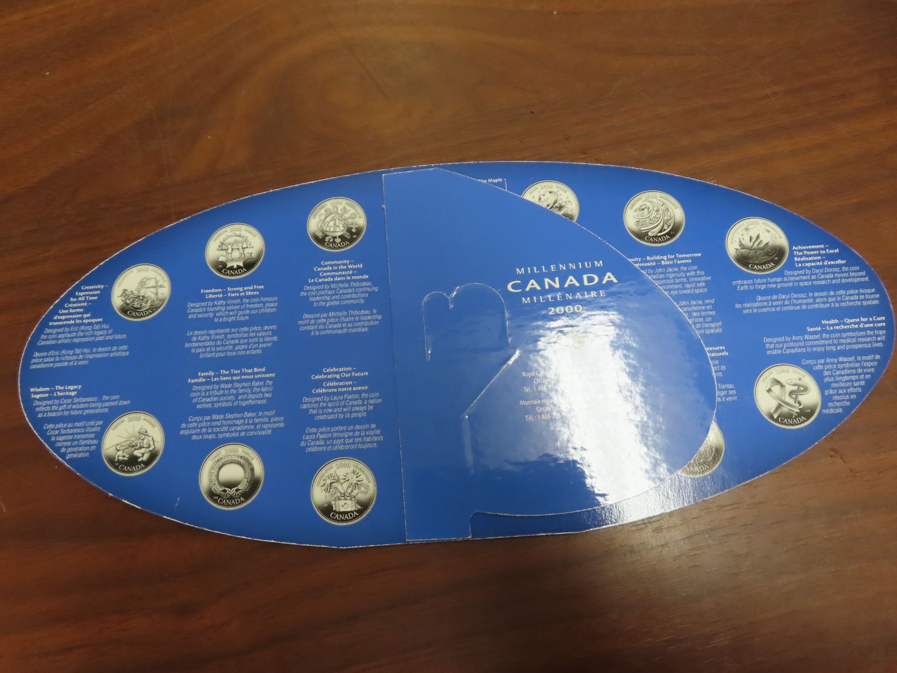 Complete set of 12 Canadian Millennium 25 Cents. Includes Royal Canadian Mint Millennium Medal. Housed in its original Royal Canadian Mint holder with map of Canada.