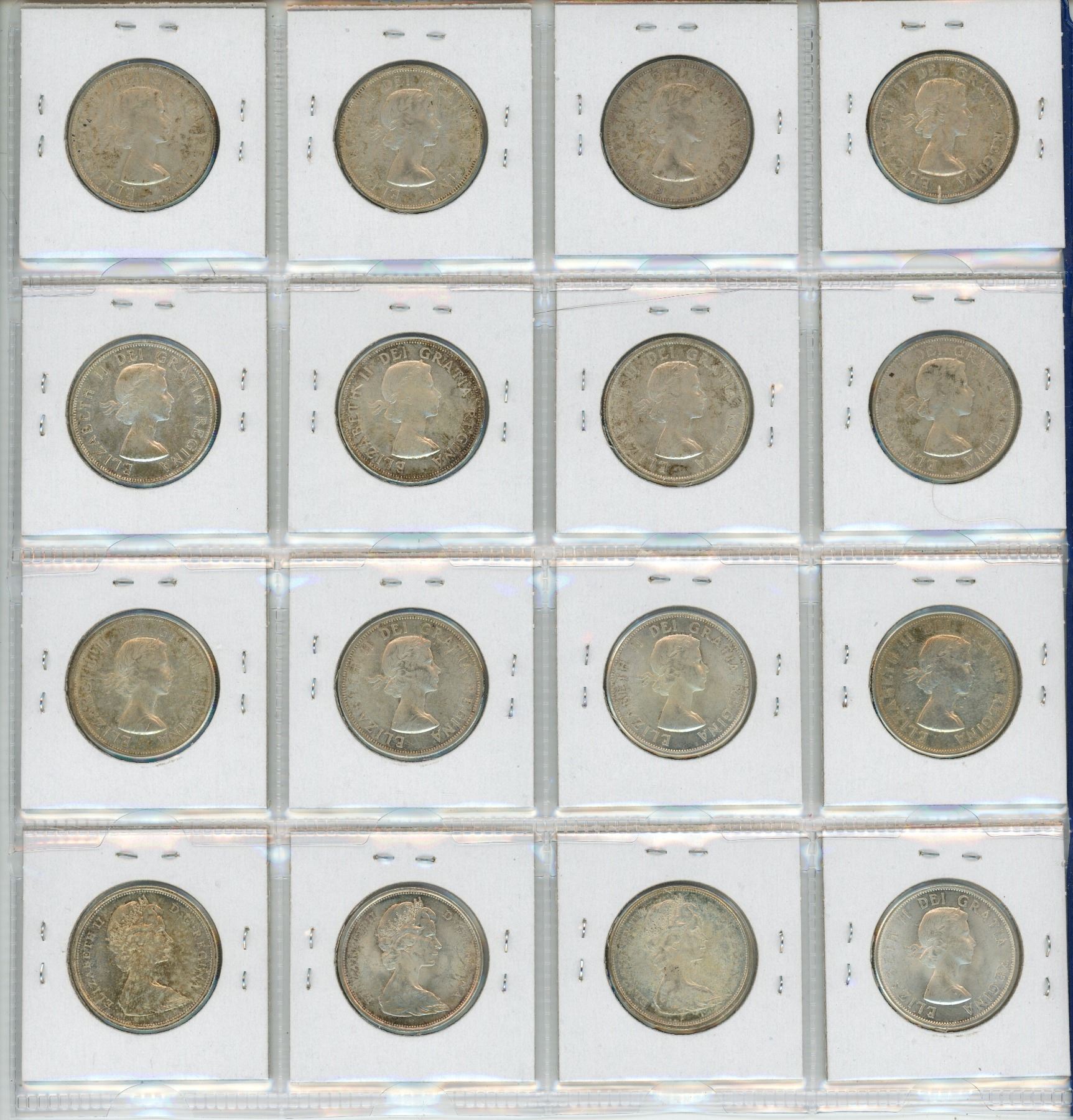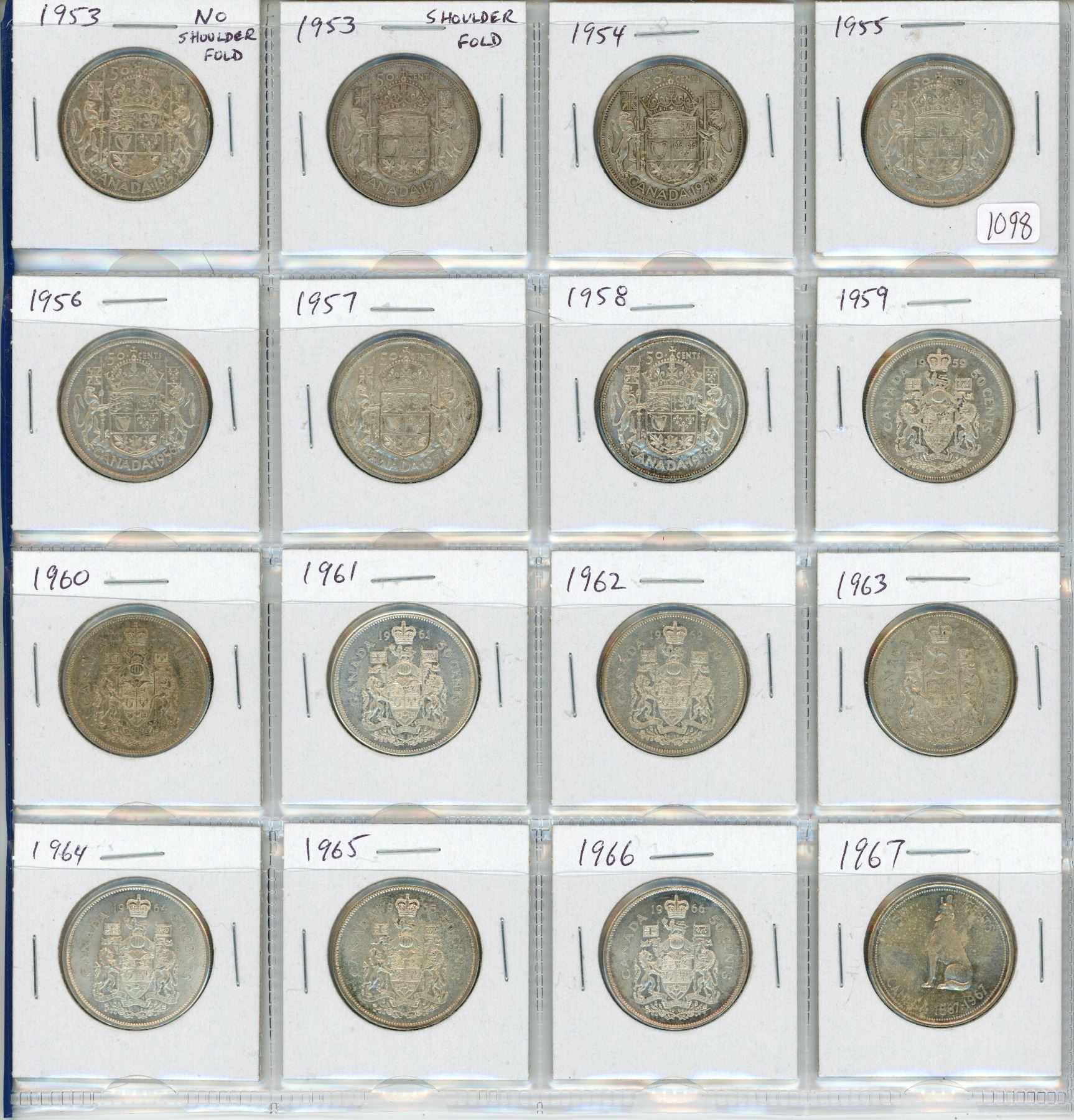 Complete set of 16 Canadian Elizabeth Silver 50 Cents. Includes 1953 No Shoulder Fold, 1953 Shoulder Fold, 1954, 1955, 1956, 1957, 1958, 1959, 1960, 1961, 1962, 1963, 1964, 1965, 1966 & 1967. Coins grade VF-30 to Uncirculated.