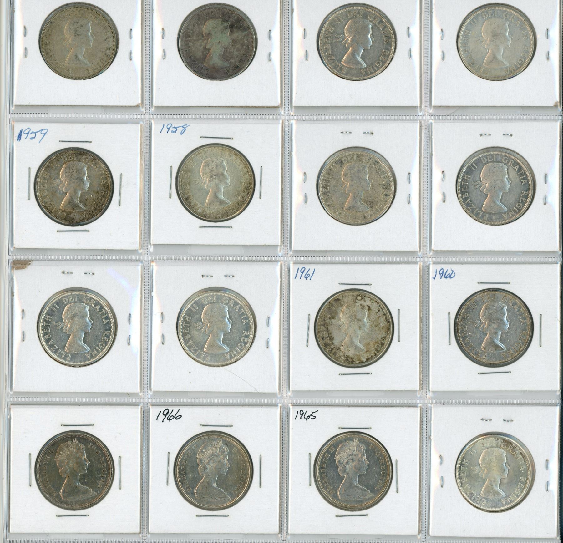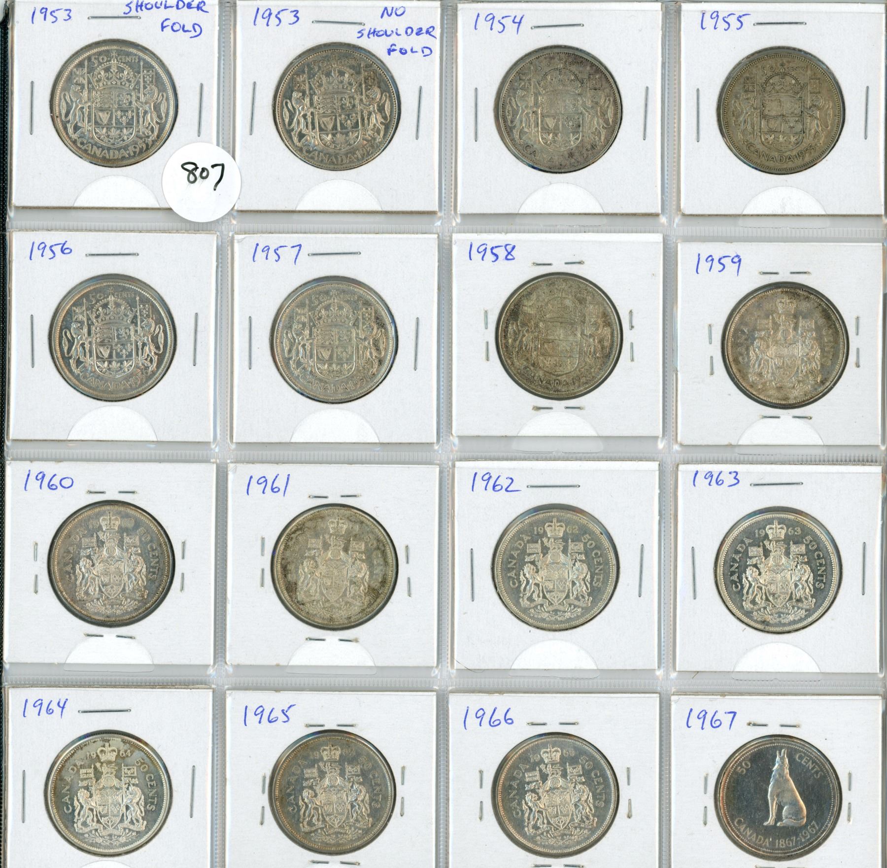 Complete set of 16 Canadian Queen Elizabeth Silver 50 Cents. Includes 1953 Shoulder Fold, 1953 No Shoulder Fold, 1954, 1955, 1956, 1957, 1958, 1959, 1960, 1961, 1962, 1963, 1964, 1965, 1966 & 1967. Coins grade up to Brilliant Uncirculated.