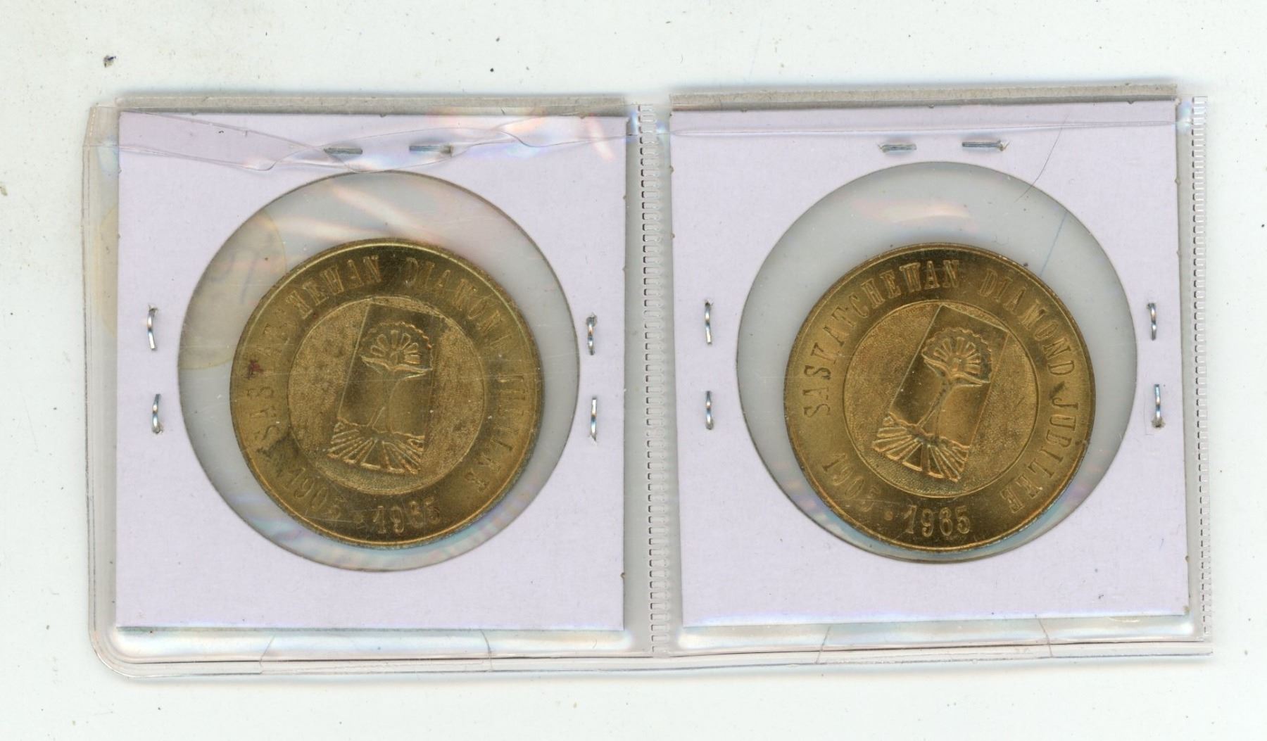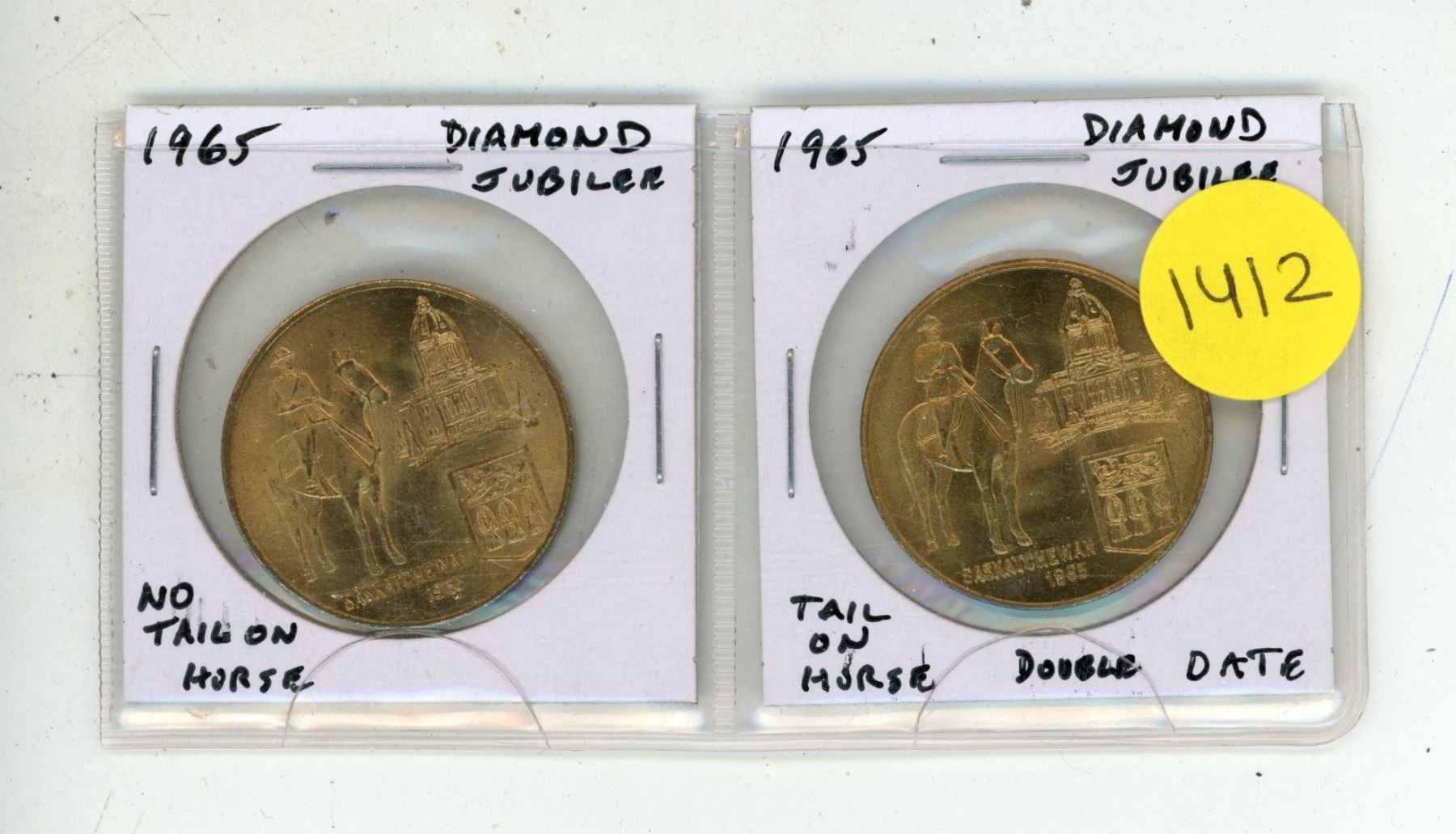 Complete set of 1965 Saskatchewan Diamond Jubilee medals including No Tail on Horse and Scarce Tail on Horse and Doubled Date and SASKATCHEWAN. Unc.