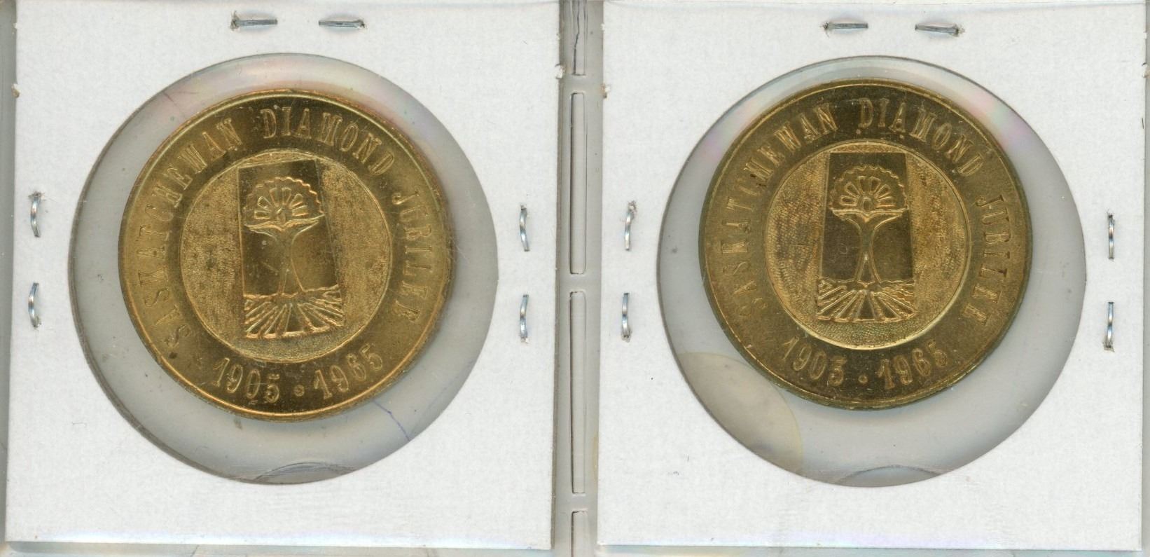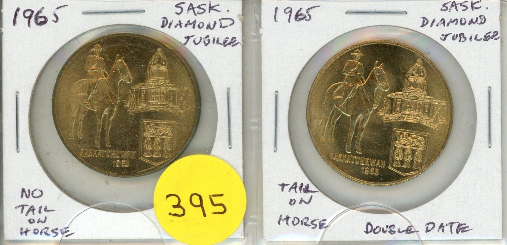 Complete set of 2 1965 Saskatchewan Diamond Jubilee medal varieties. Includes No Tail on Horse and Scarce Tail on Horse, with Doubled Date and Saskatchewan.