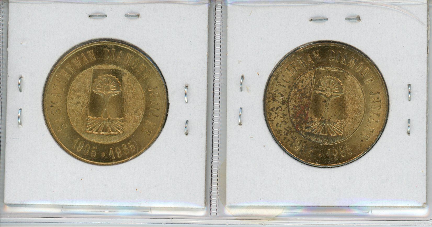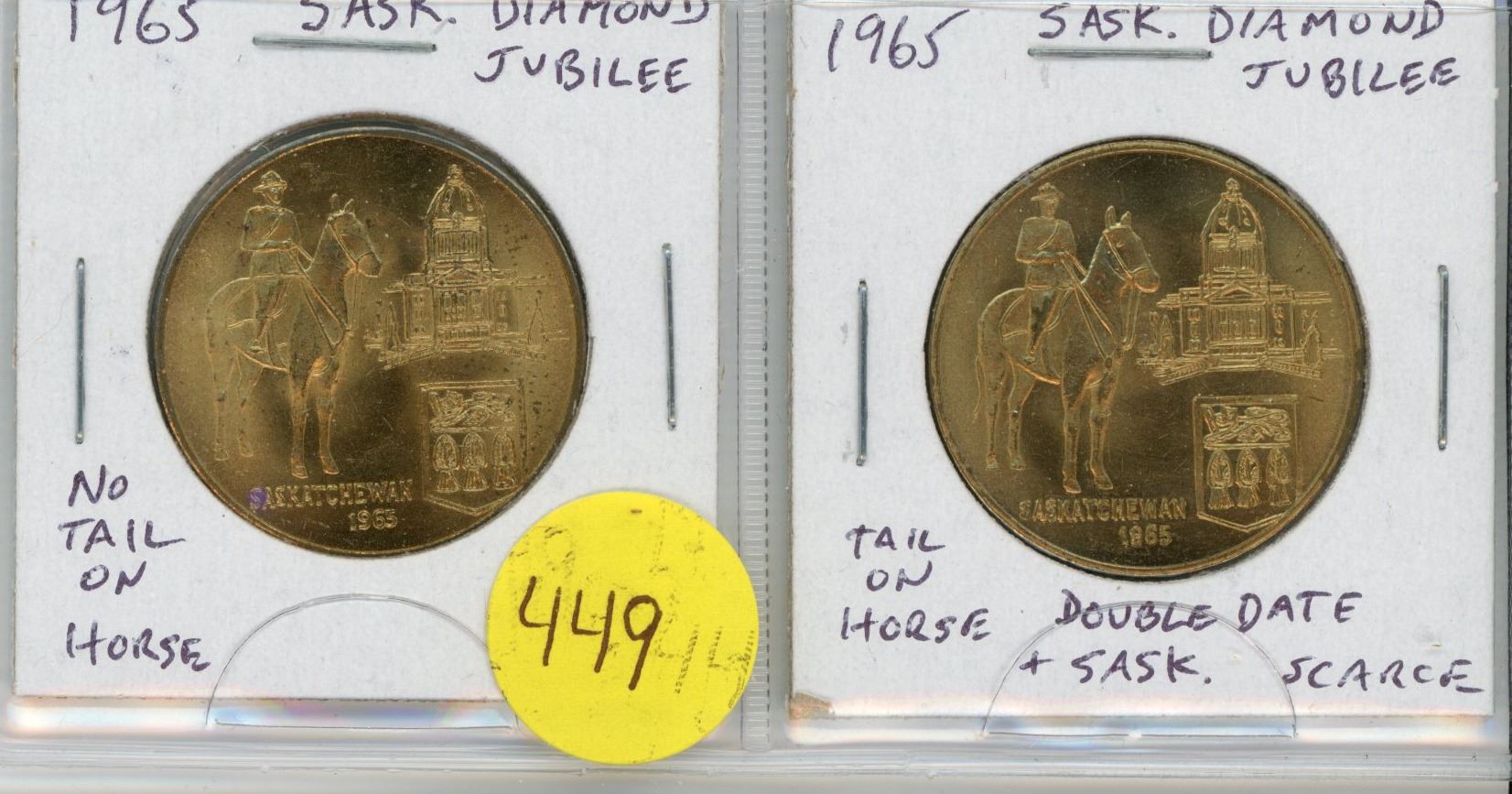 Complete set of 2 1965 Saskatchewan Diamond Jubilee medals. Includes No Tail on Horse & Scarce Tail on Horse with Doubled Date & Doubled SASKATCHEWAN. BU.