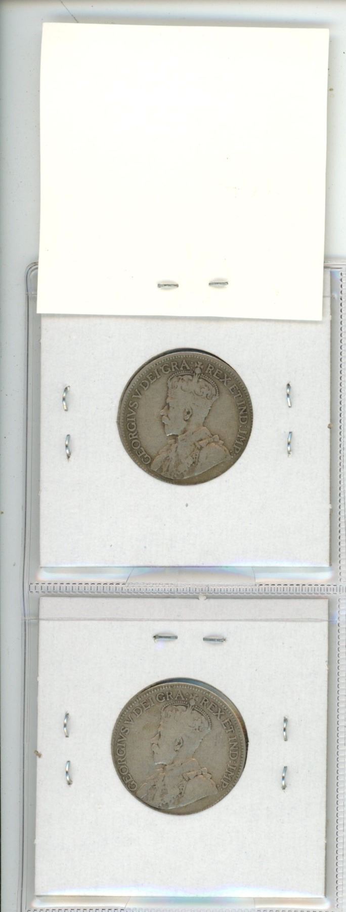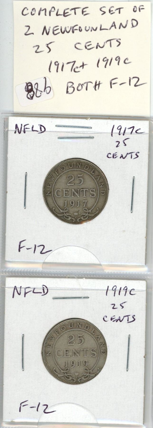 Complete set of 2 Newfoundland Silver 25 Cents. 1917c and 1919c. Both minted in Ottawa. Both F-12.