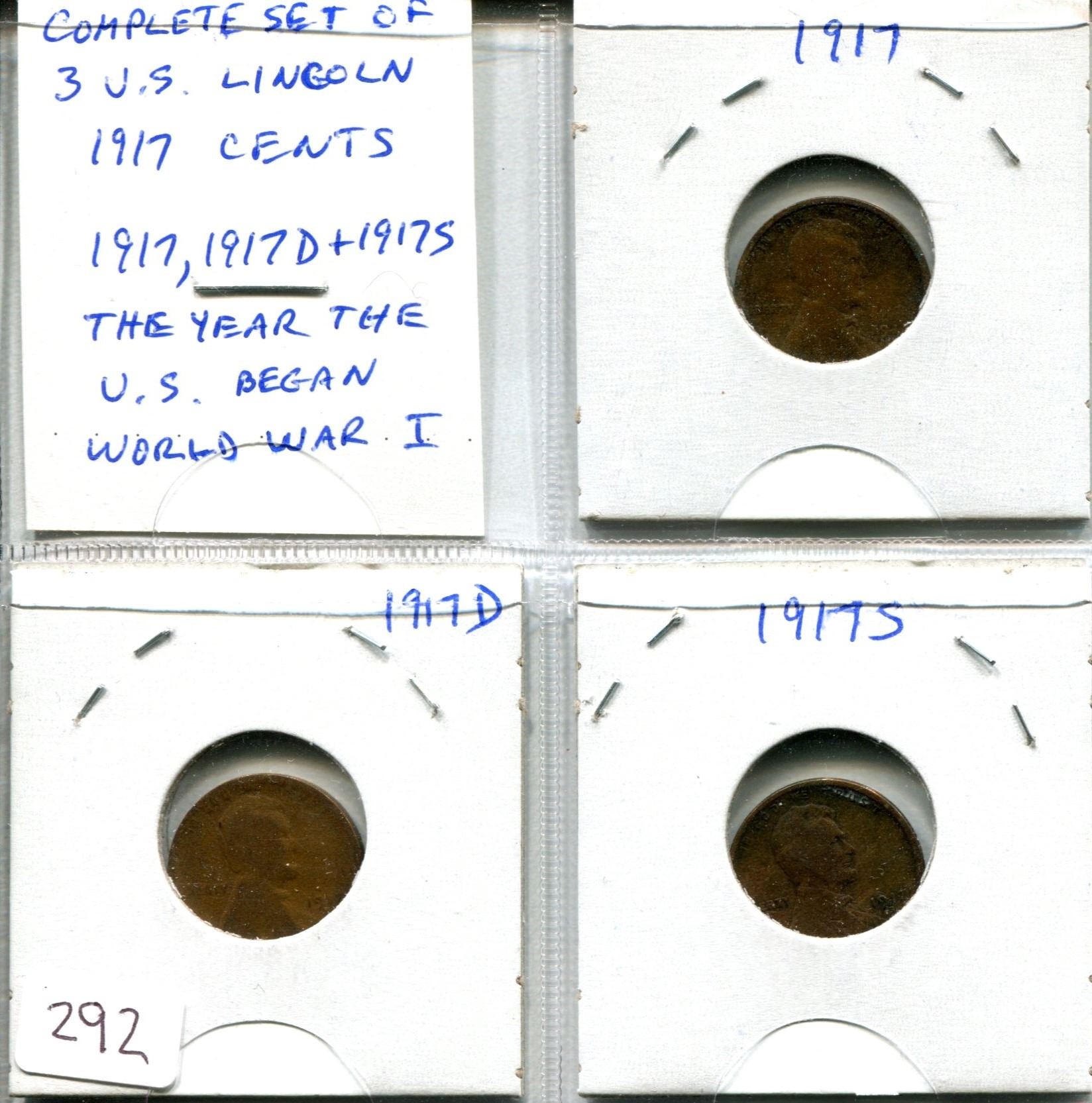 Complete set of 3 U.S. Lincoln cents issued in 1917, the year the U.S. joined World War I. Includes 1917, 1917D and 1917S.