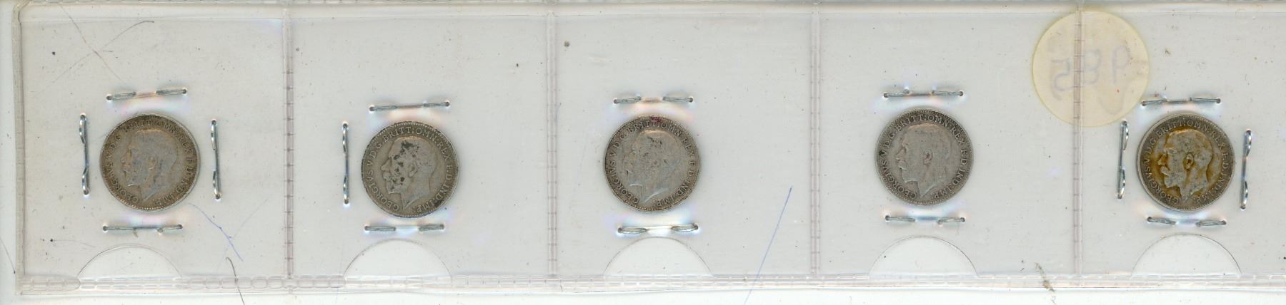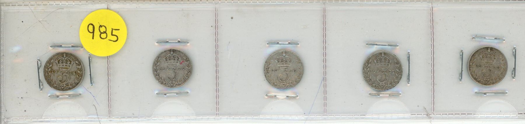 Complete set of 5 British Silver 3 Pence issued during World War I. Includes 1914, 1915, 1916, 1917