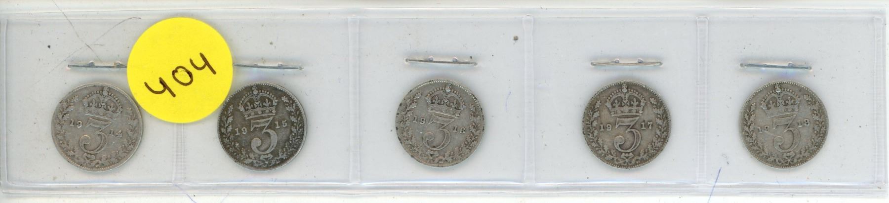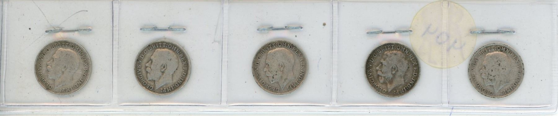 Complete set of 5 British World War I Silver 3 Pence 1914 – 1918. Sterling Silver.