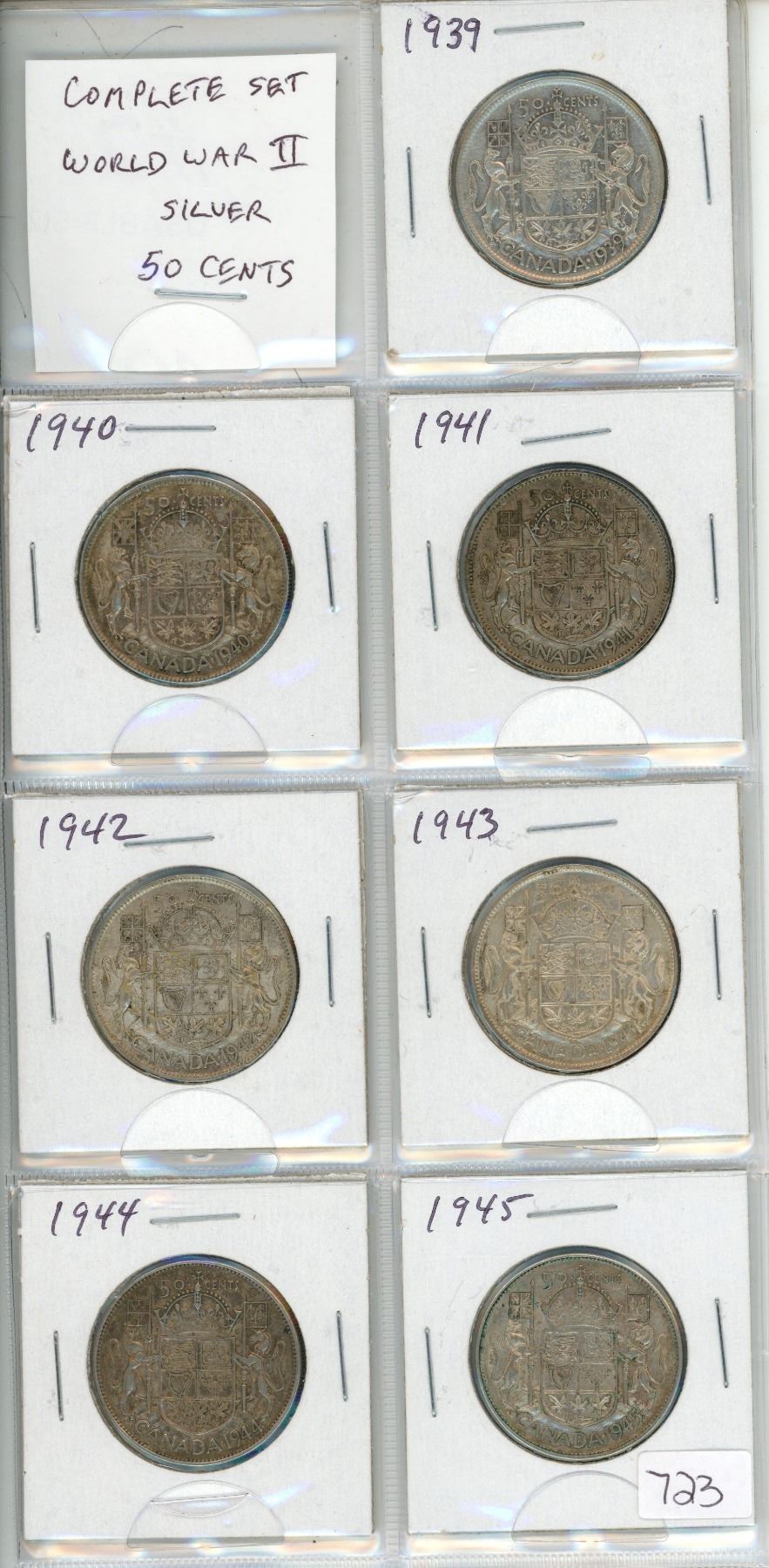 Complete set of 7 Canadian World War II Silver 50 Cents. Includes 1939, 1940, 1941, 1942, 1943, 1944 & 1945.