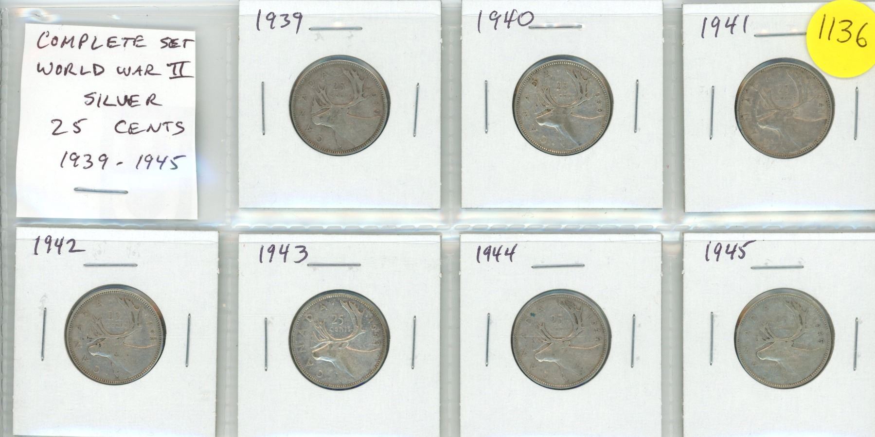 Complete set of World War II Silver 25 Cents 1939 – 1945. Coins grade Fine or better.