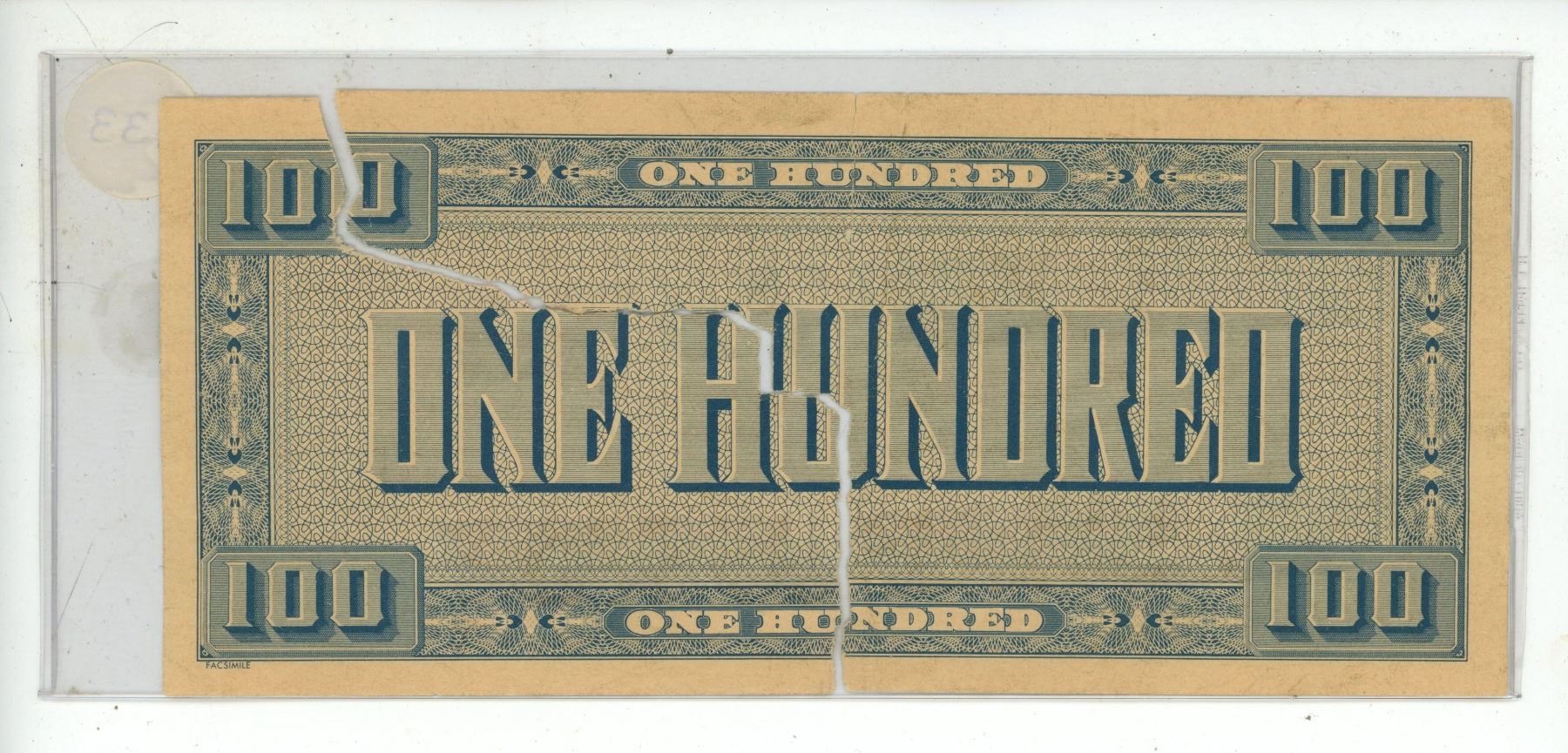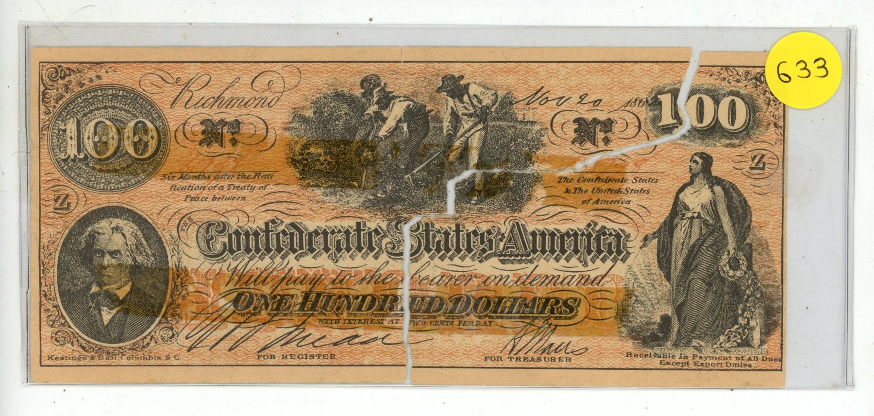 Confederate States of America $100 banknote from 1862 or 1864. (Teared from center)