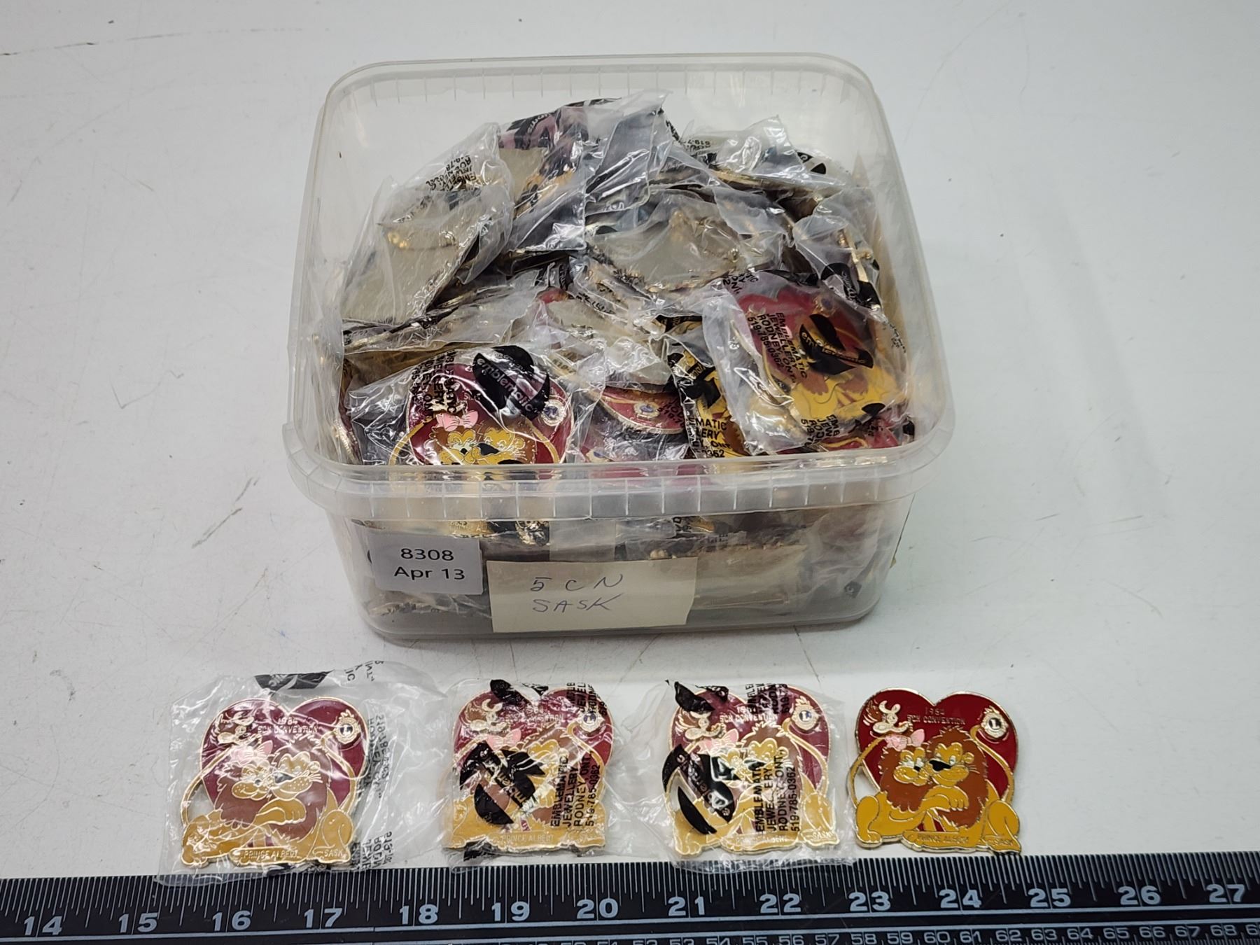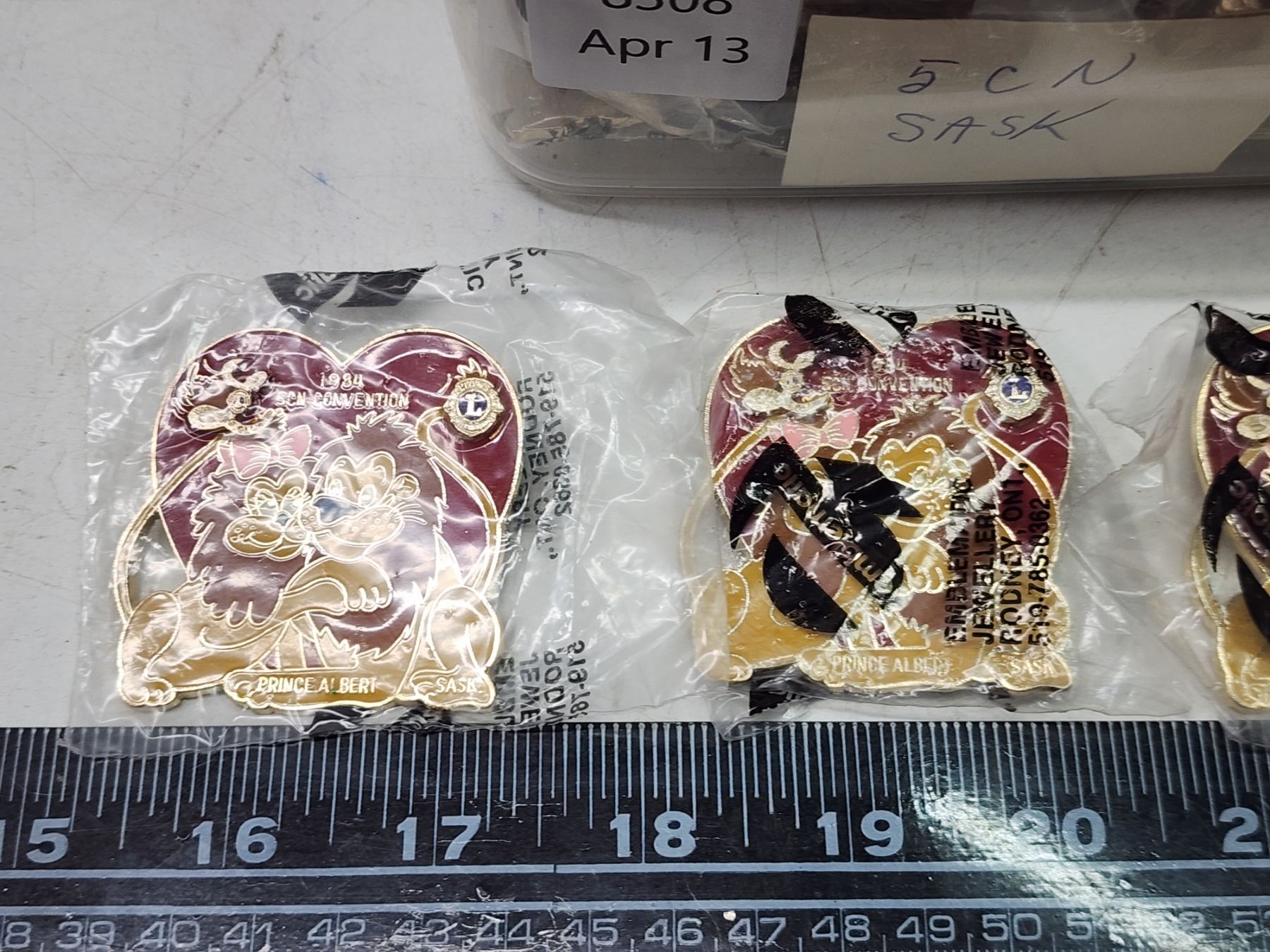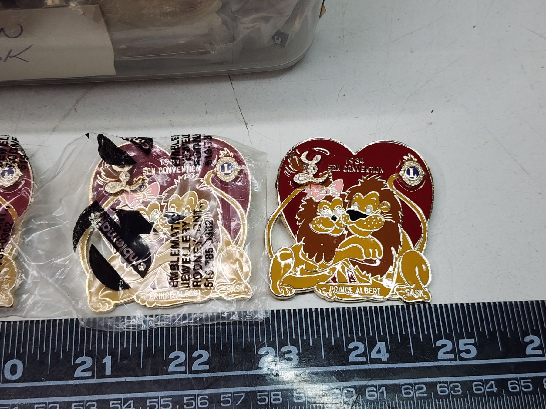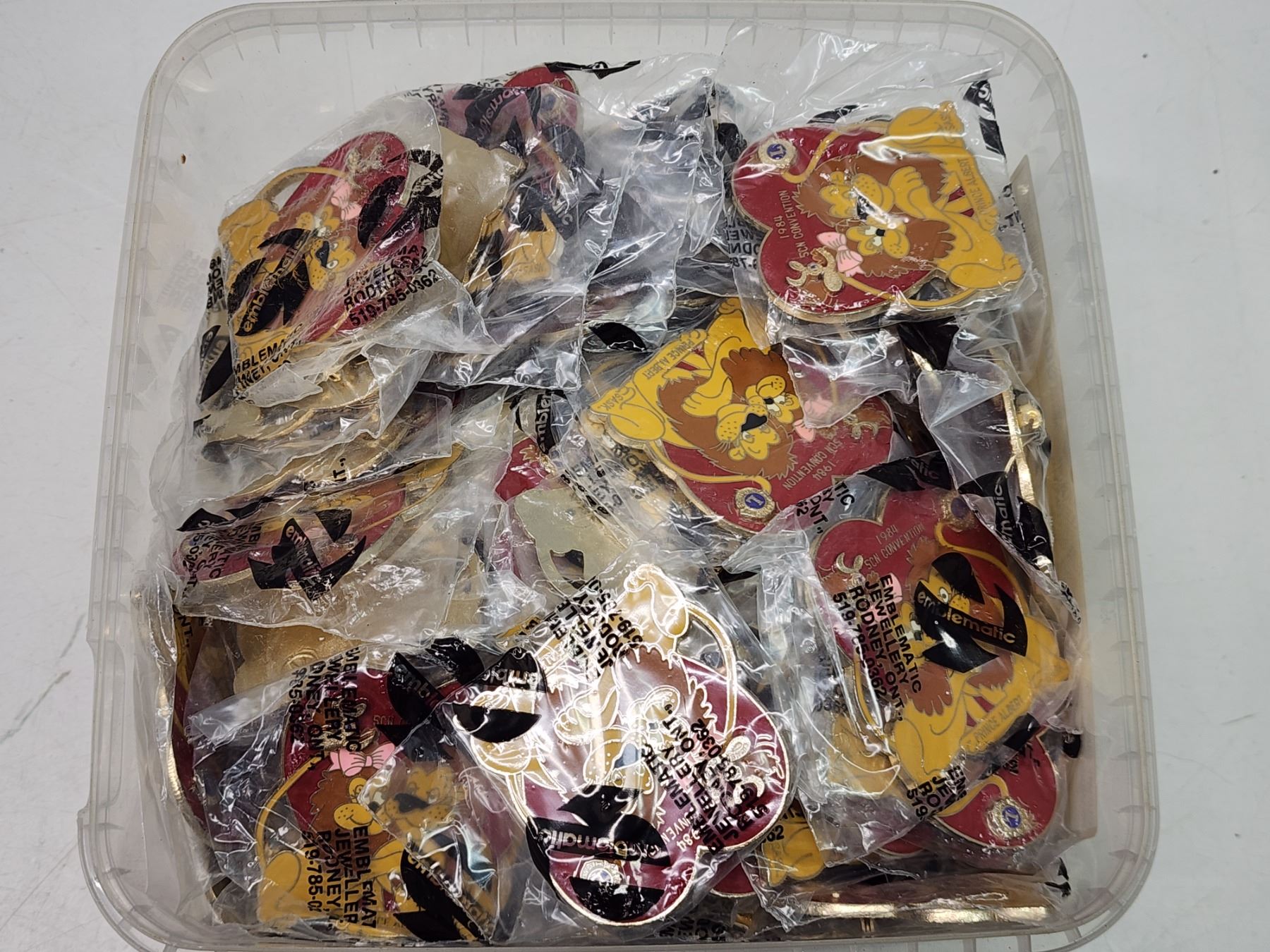 Container of Lions Club collector's pins - 1984 Prince Albert