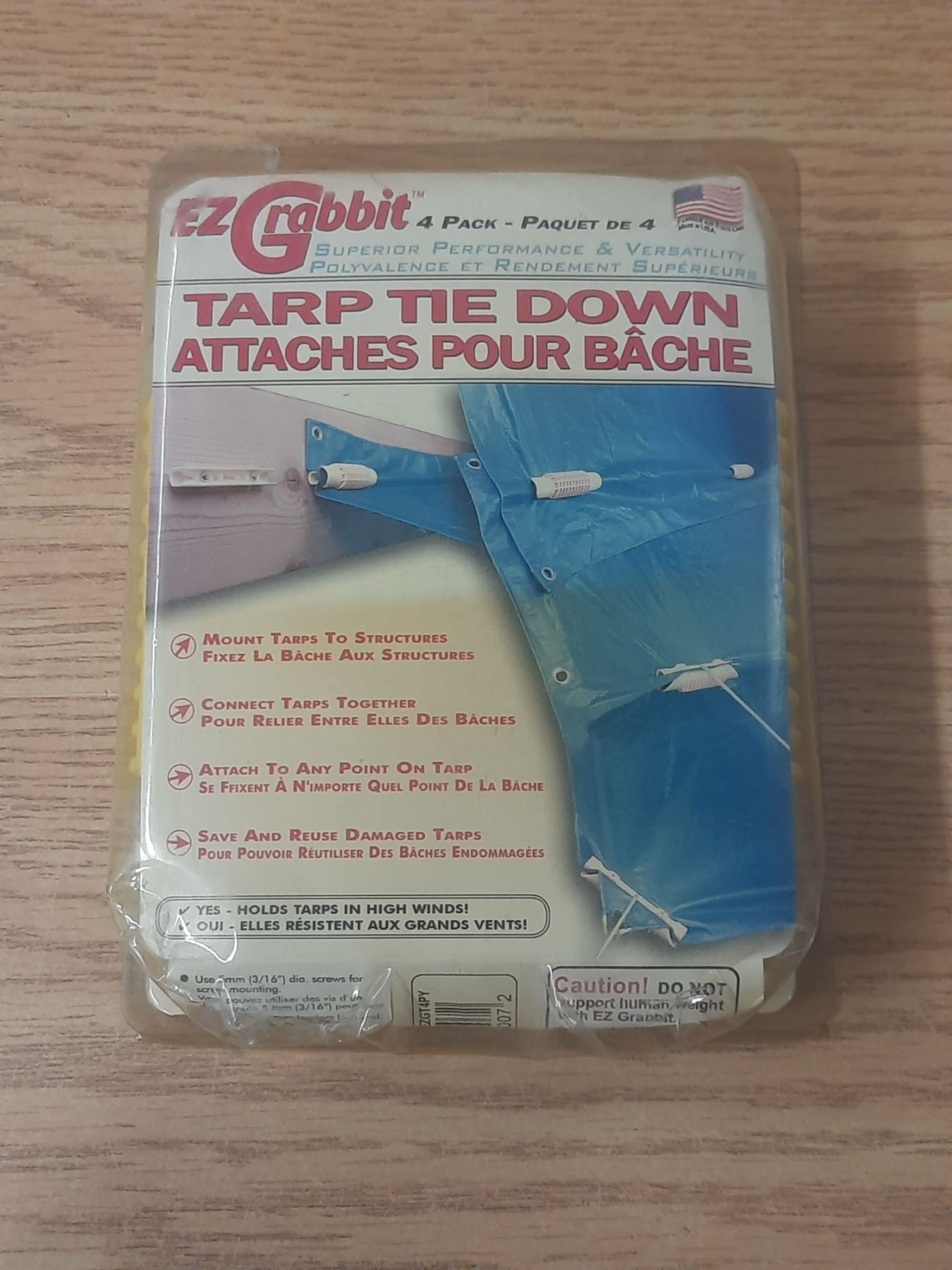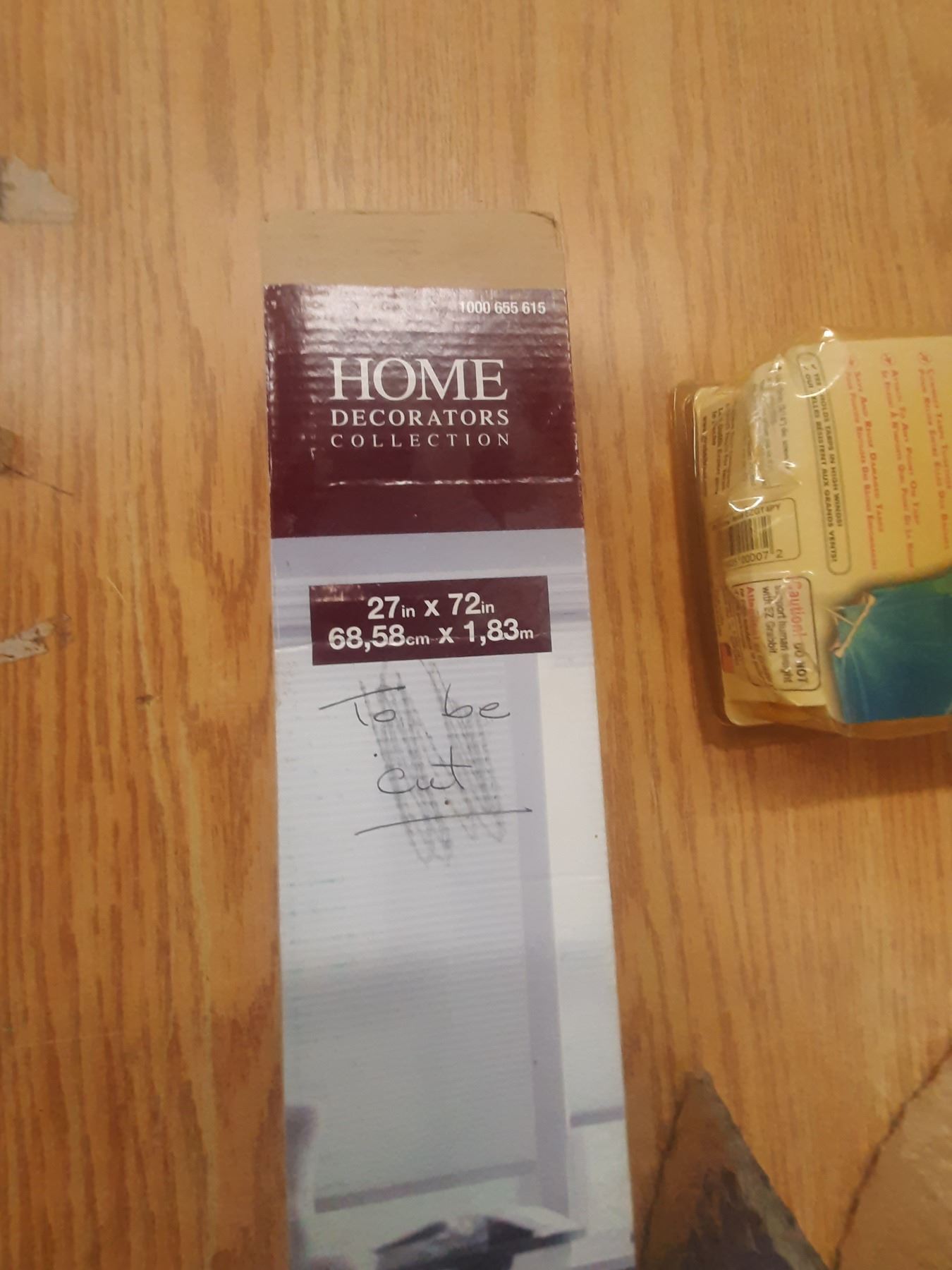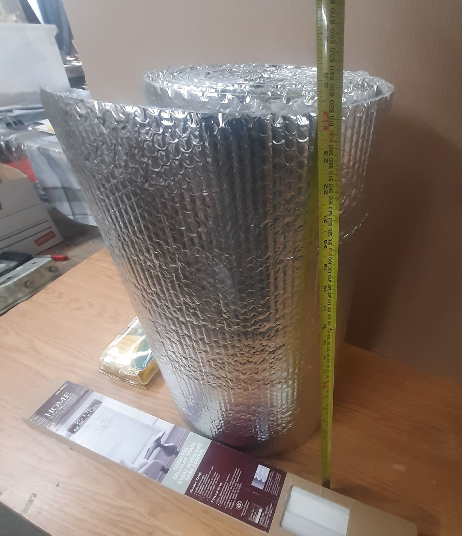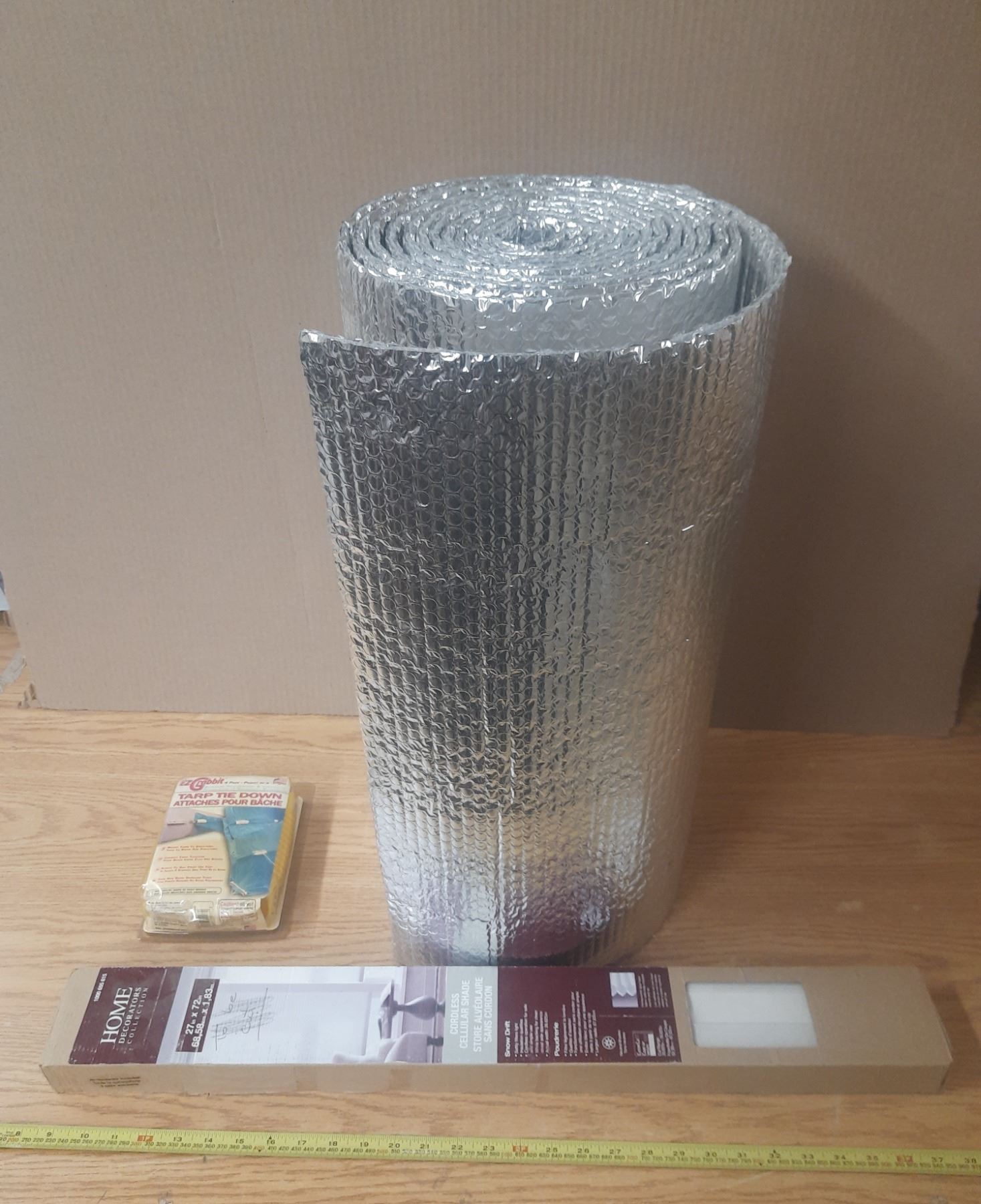 Cordless Cellular Shade 27 in X 72 in, Tarp Tie Down and Roll of Bubble Insulation.