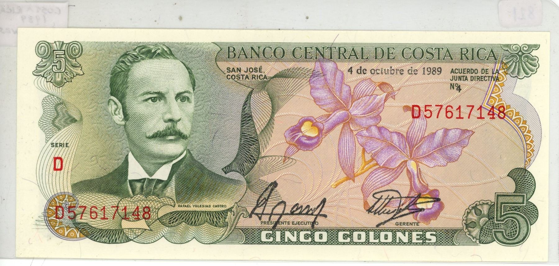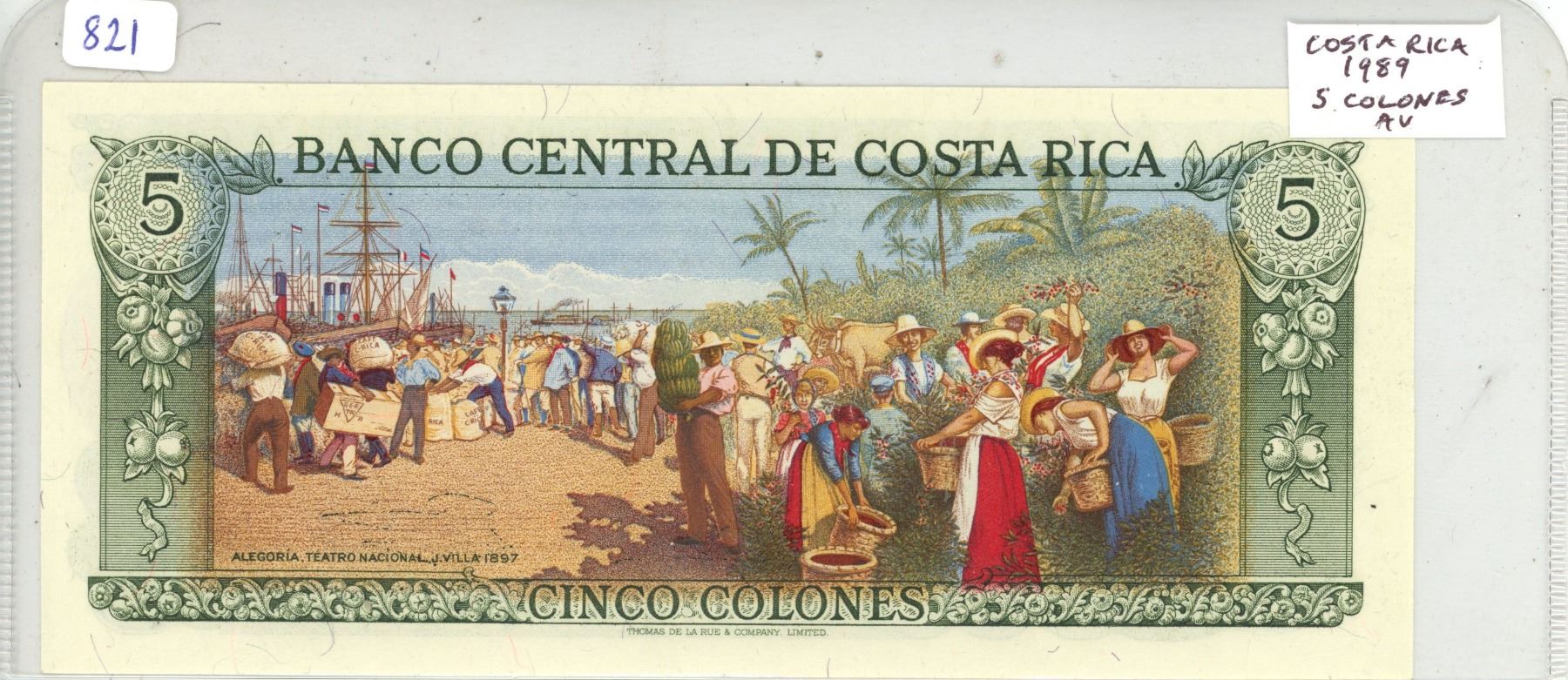 Costa Rica. 1989 5 Colones. Castro/market scene. An attractive note. AU.