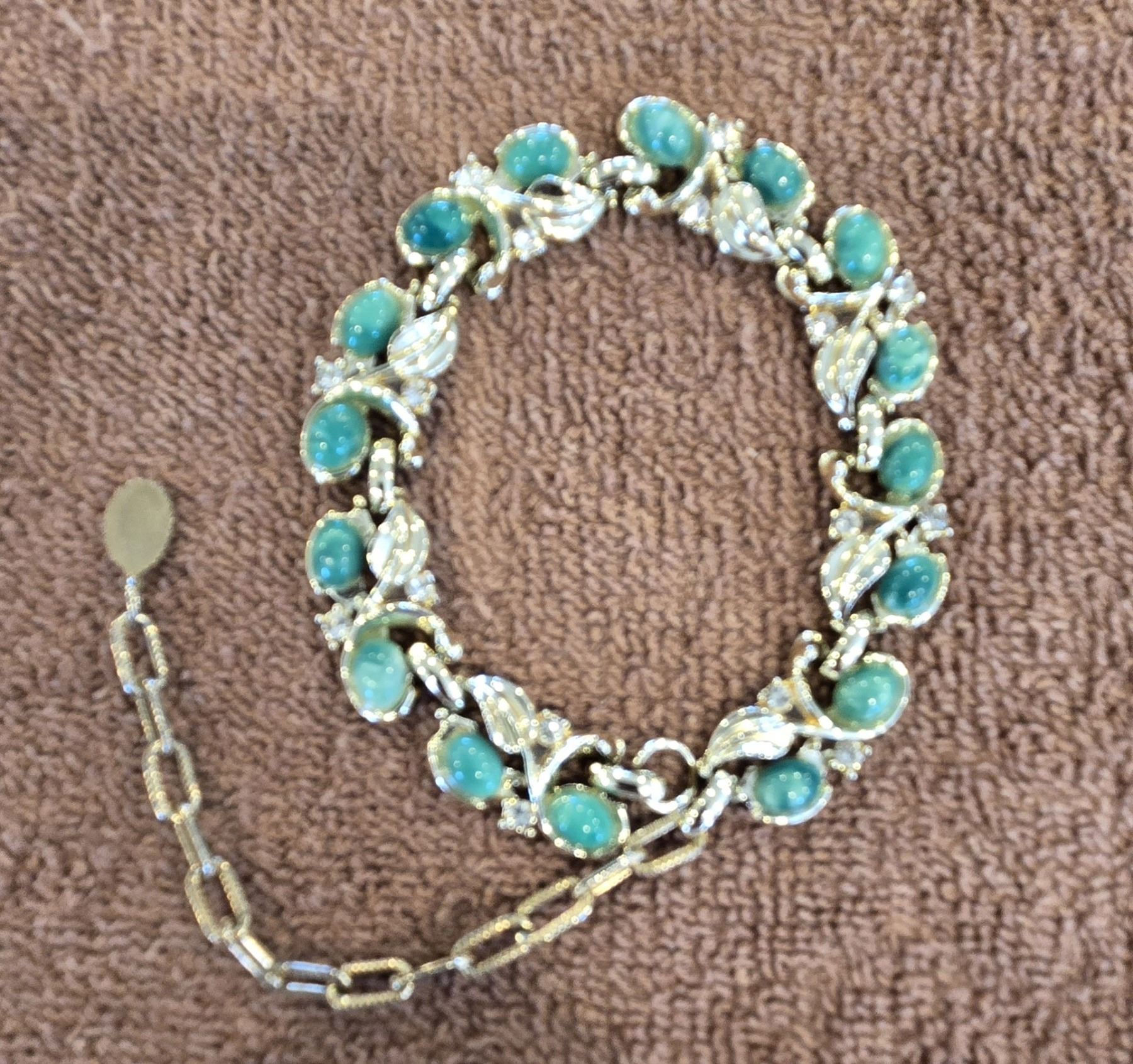 Costume jewellery - vintage gold tone metal bracelet with jade green stones and rhinestones. No missing stones. Very pretty.