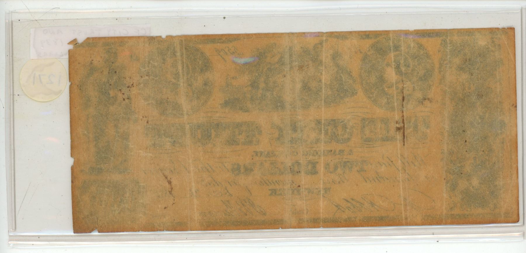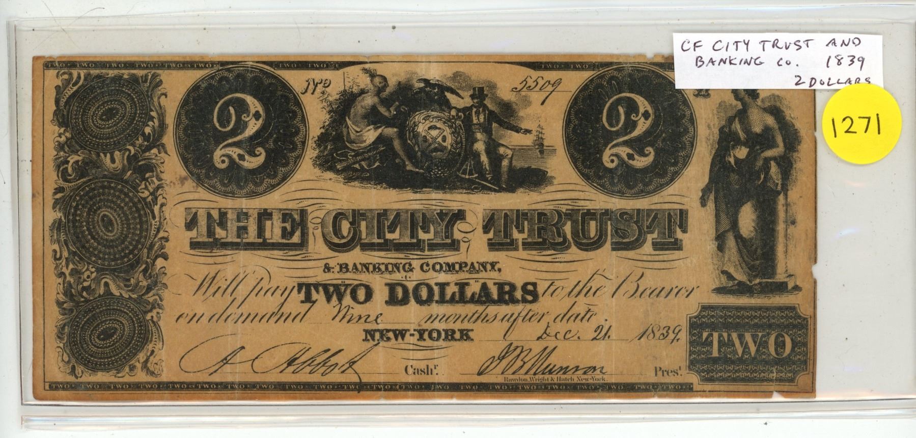 Counterfeit City Trust & Banking Company 1839 $2. This is not a real note.