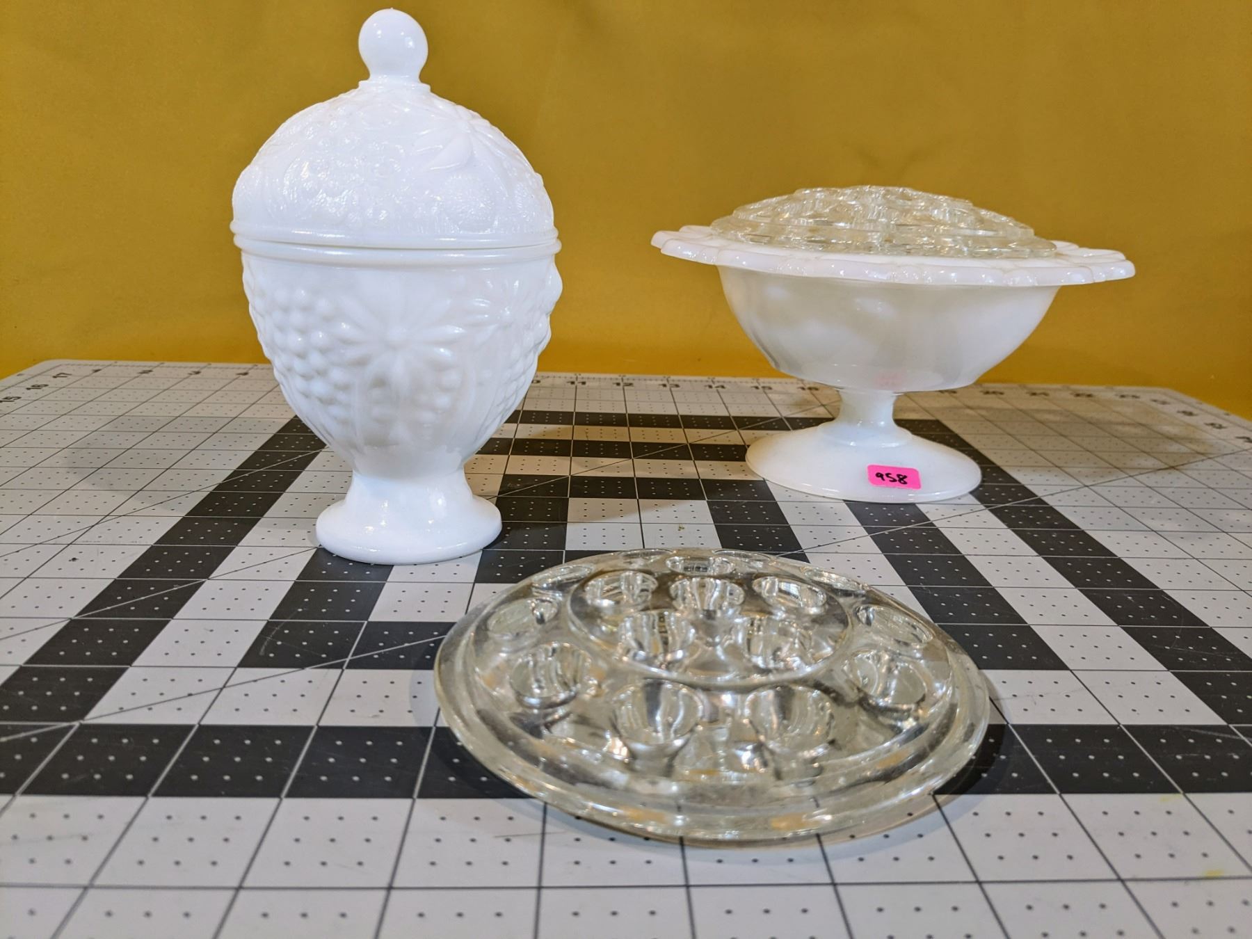 Covered, antique milk-glass candy dish egg (6"x 3"); lace edge milk-glass Anchor Hocking compote pedestal dish (5.25" x 3.25"); plus 2 flower frogs.