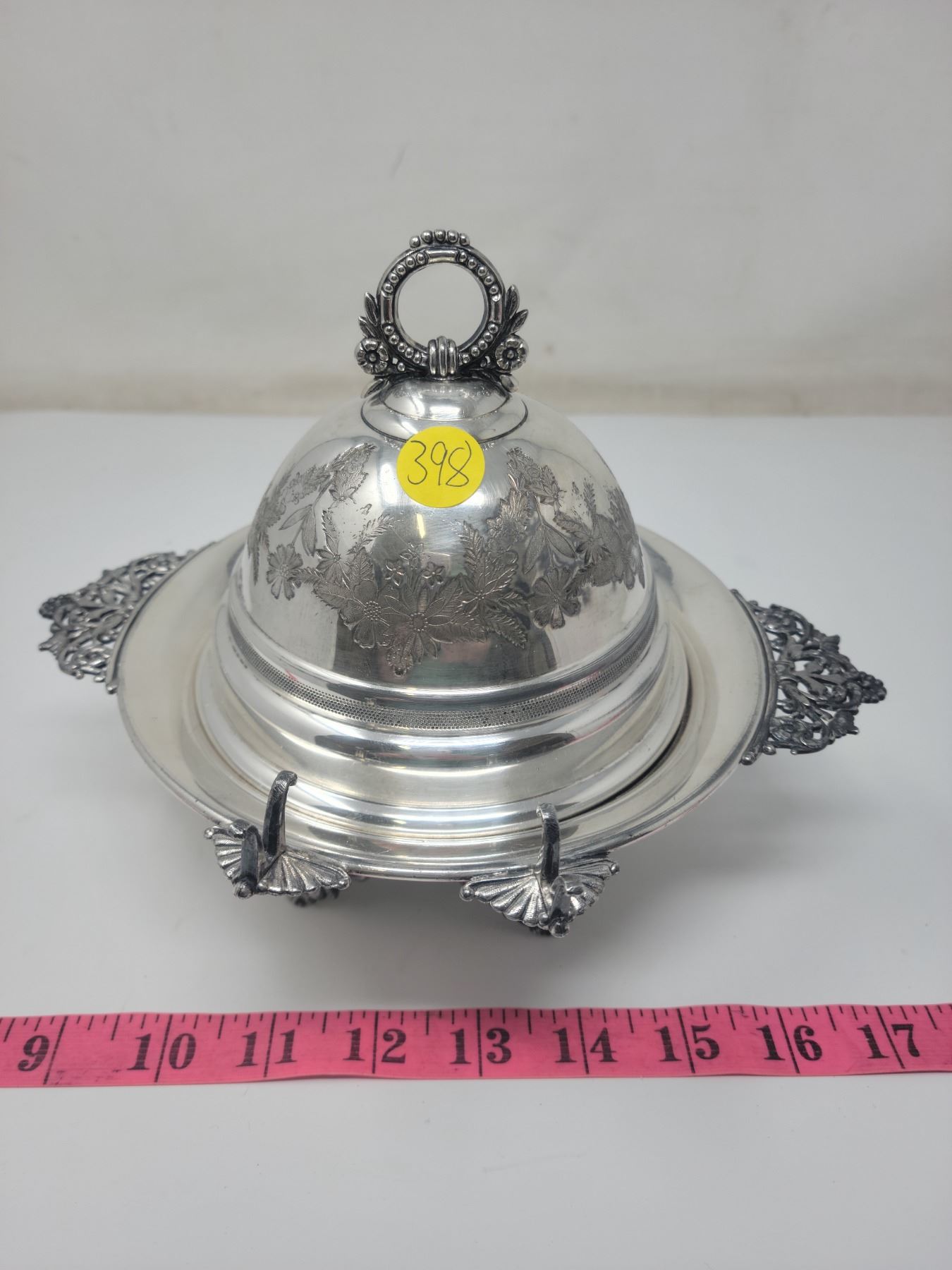 Covered butter dish, some discolorations, no butter knife. E.P.W.M. fine silverplate, extra finish