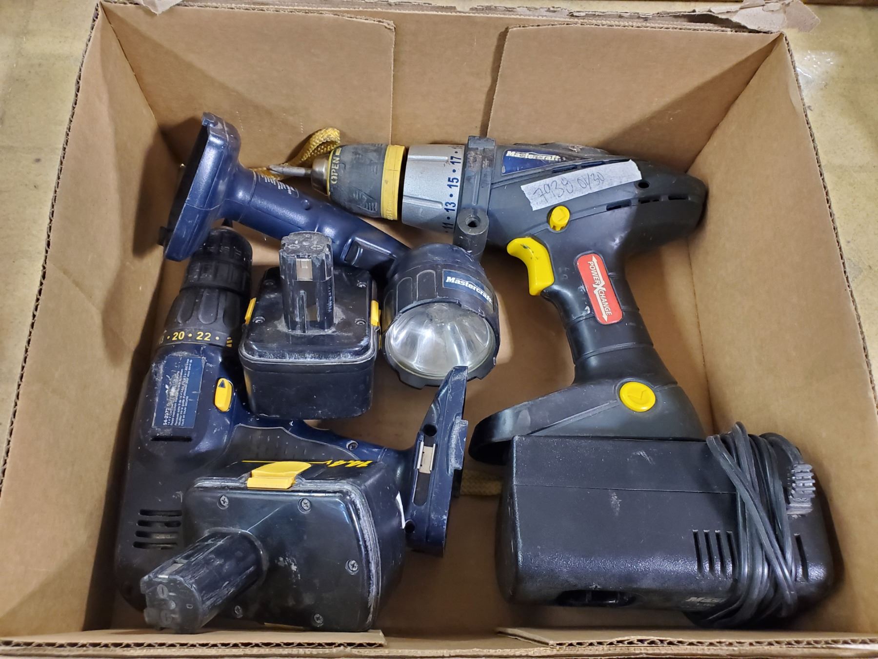 Craftsman 14.4 V drill, flashlight, charger (batteries dead) & 18 volt drill (no battery)