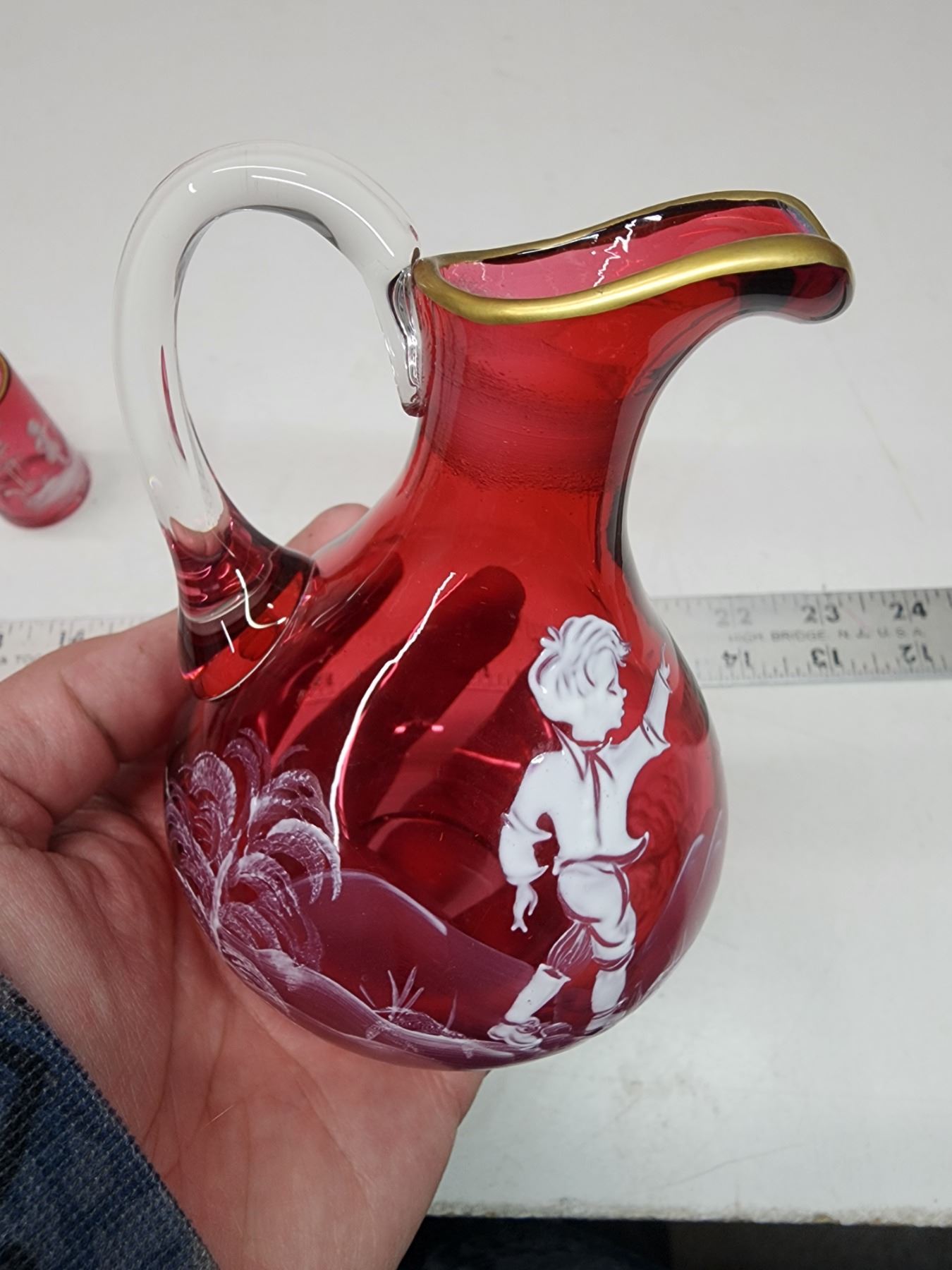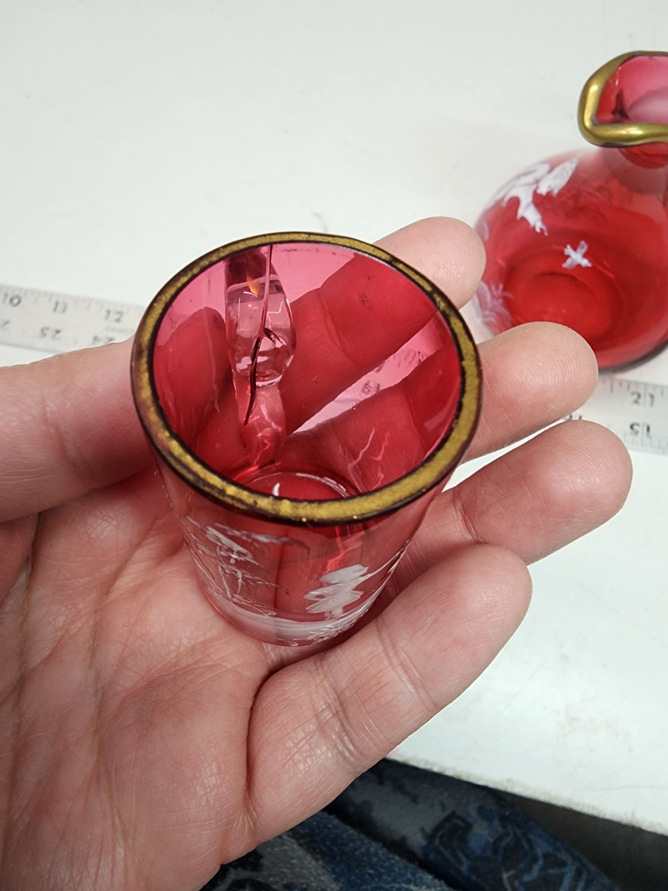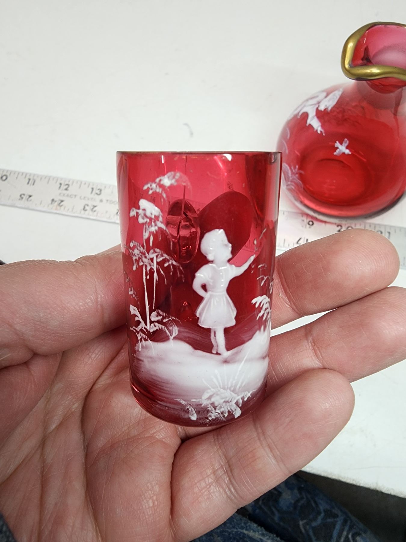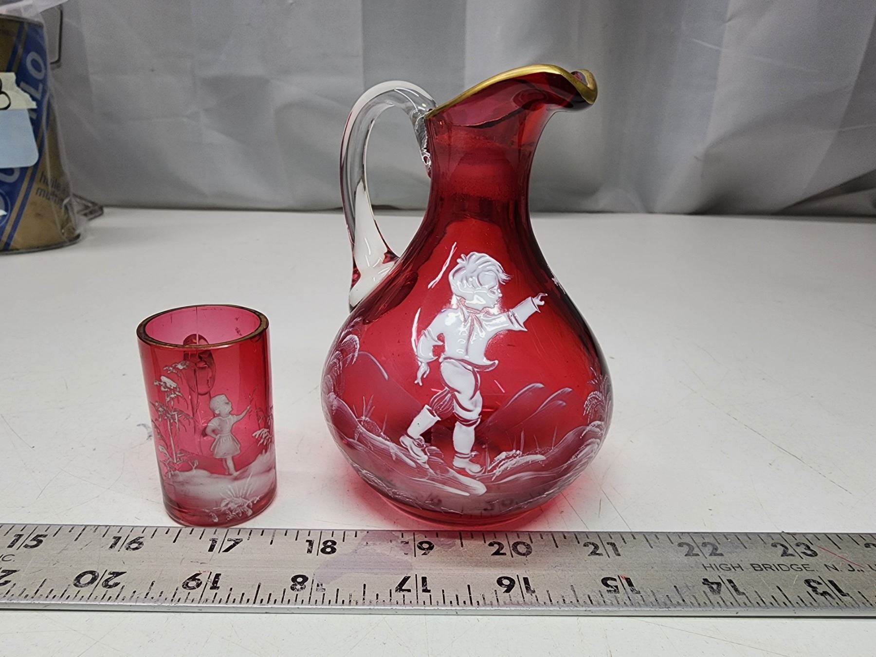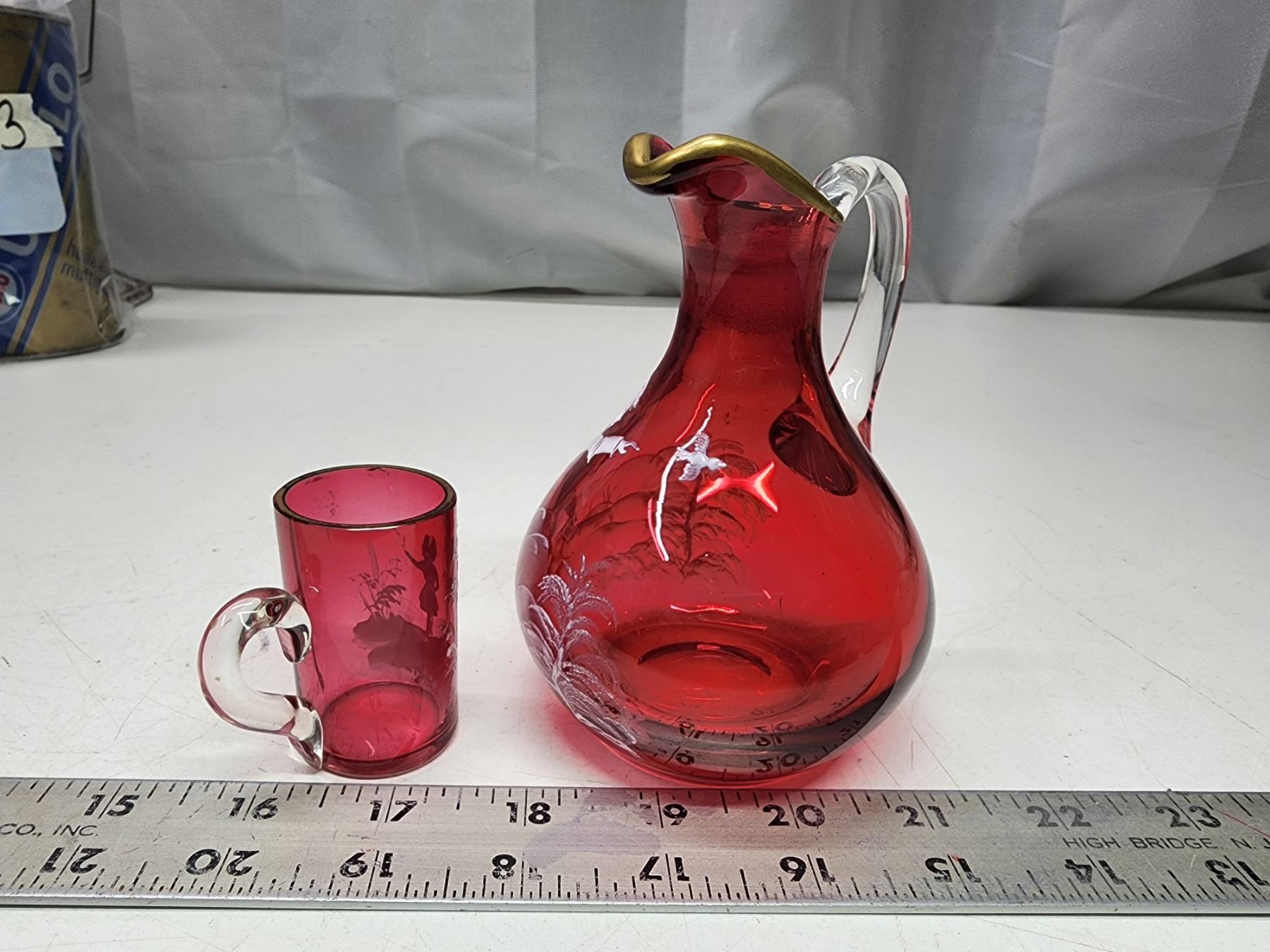 Cranberry colored glass, Mary Gregory pitcher and small cup