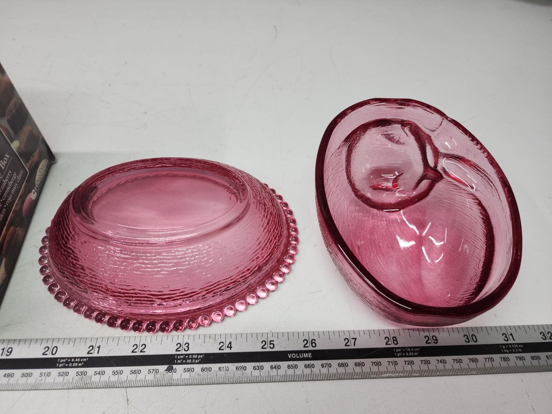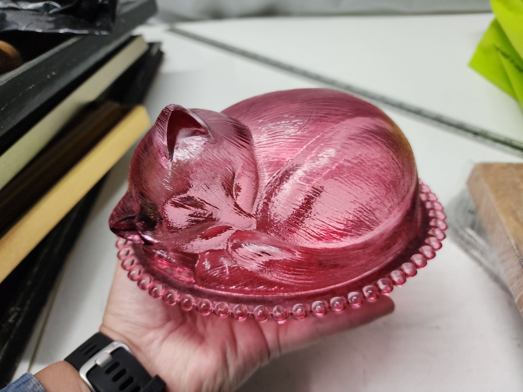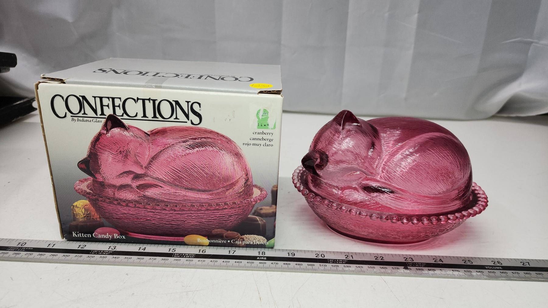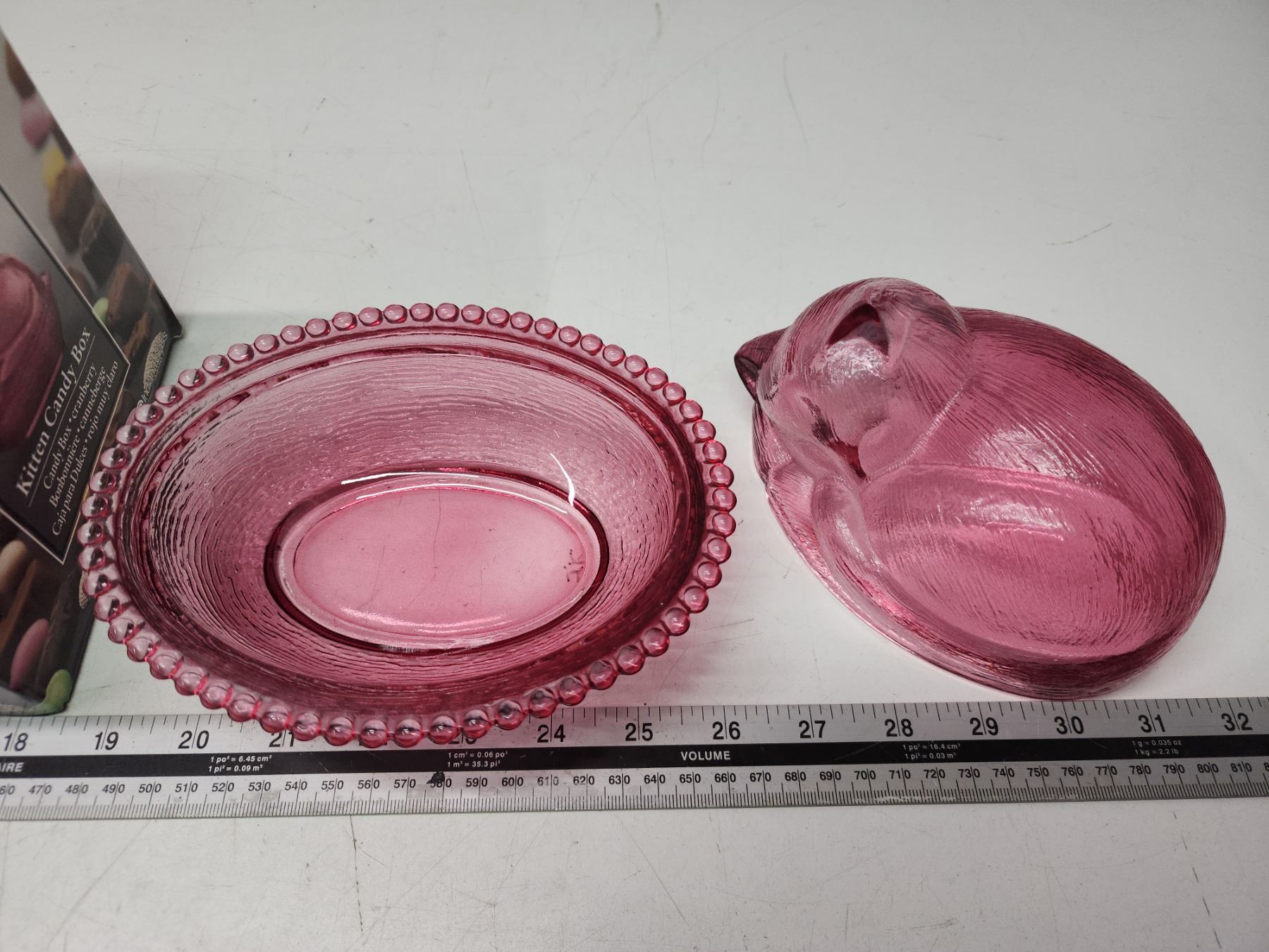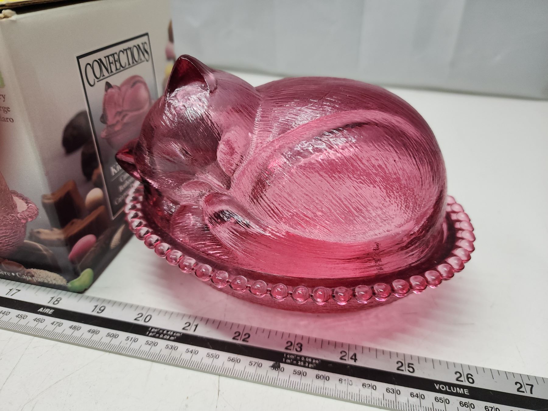 Cranberry glass kitten on basket, candy dish - in original box