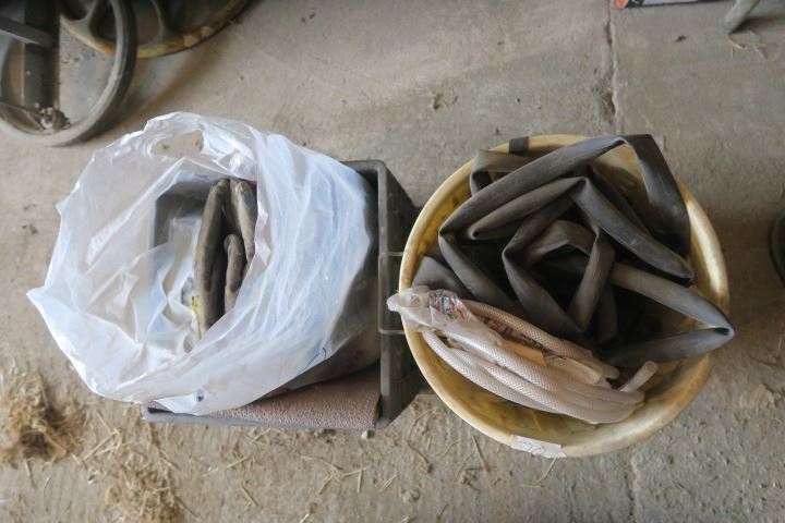 Crate of Gloves and Garbage Can of Bike Tire Tubes