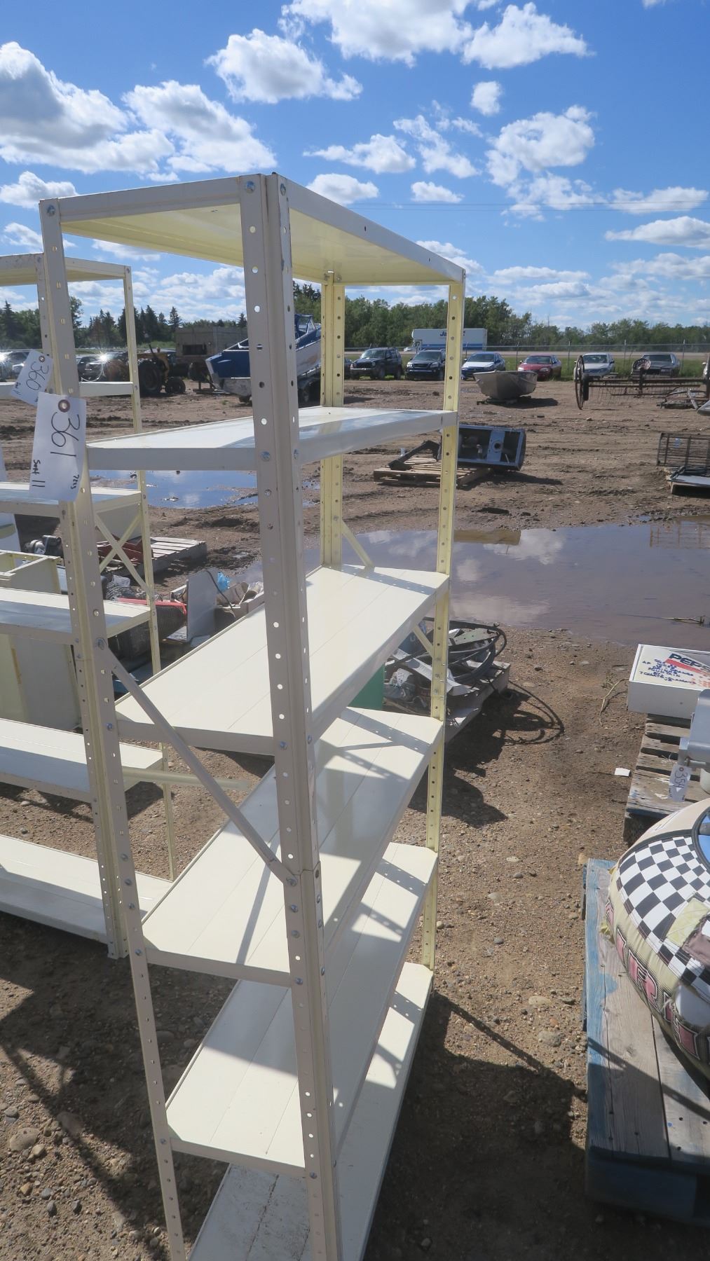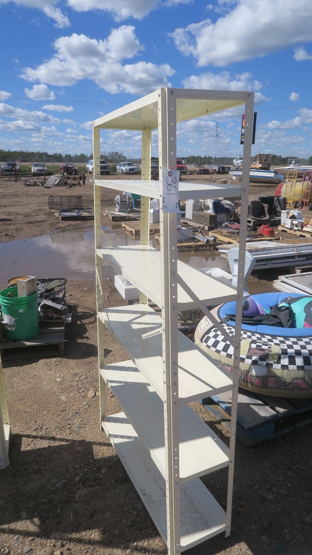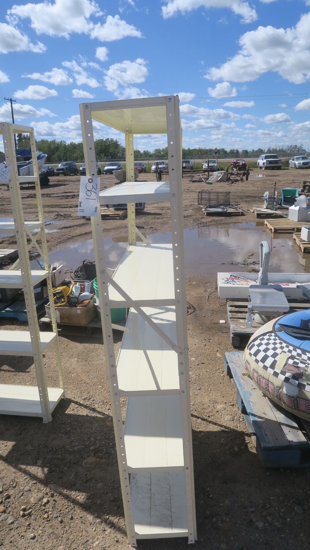 Cream color metal shelf, 6 shelves, 36"w x 68 -1/2" h x 11 -1/2" d