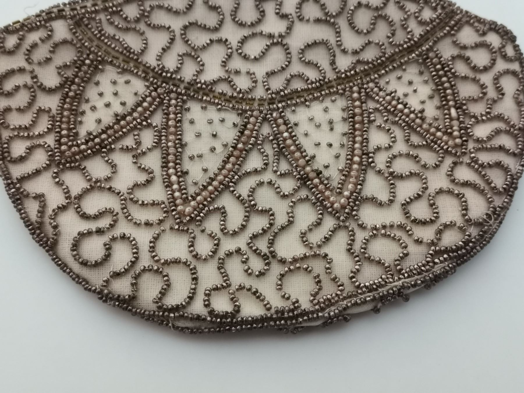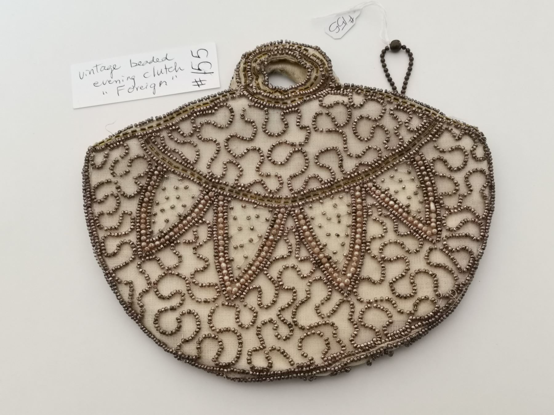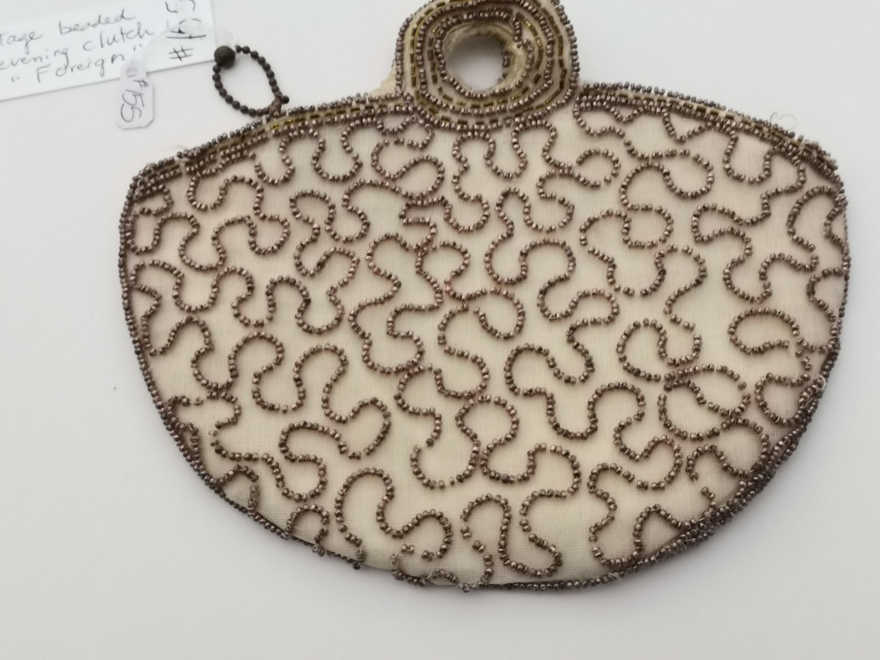 Cream coloured beaded evening bag, marked “Foreign”