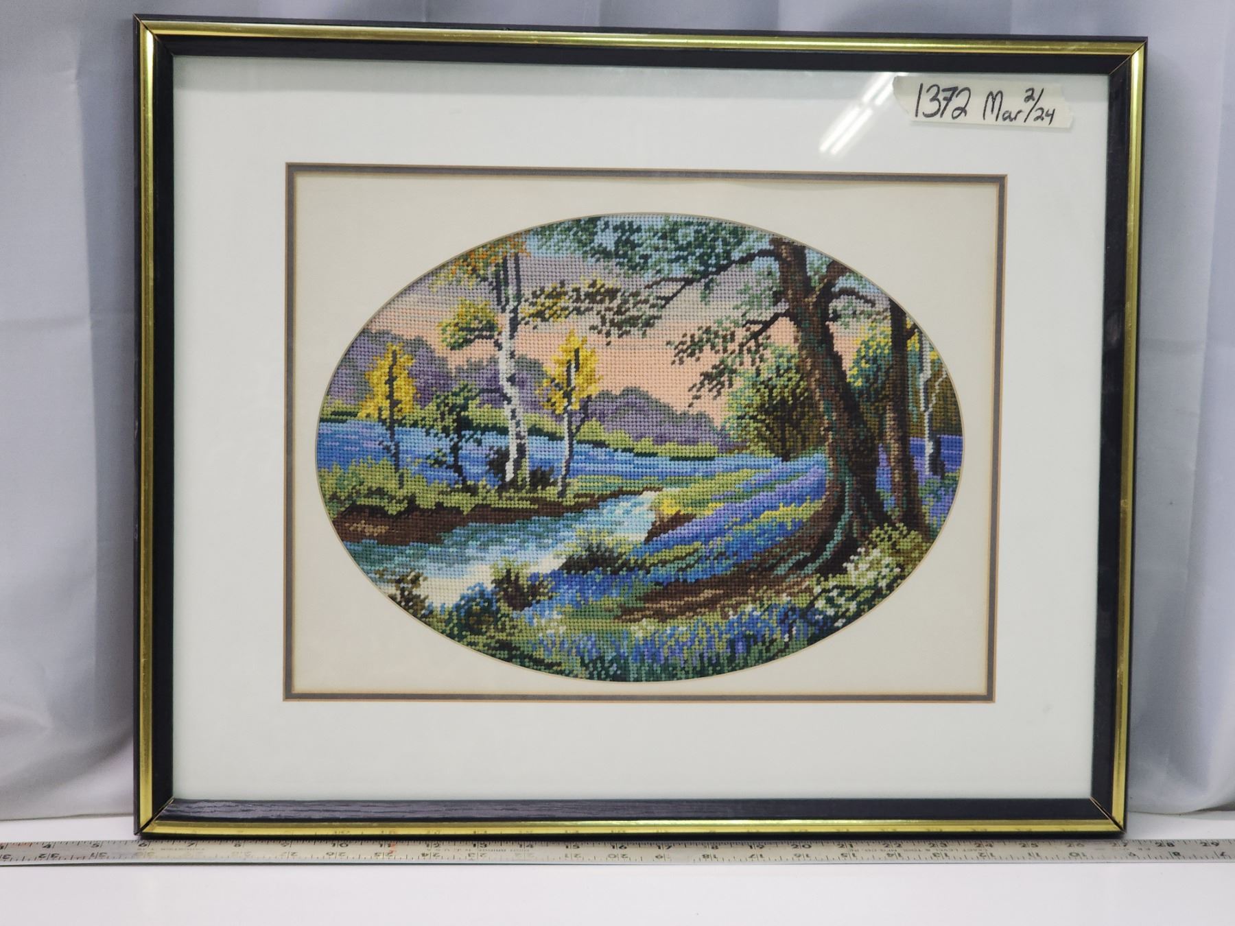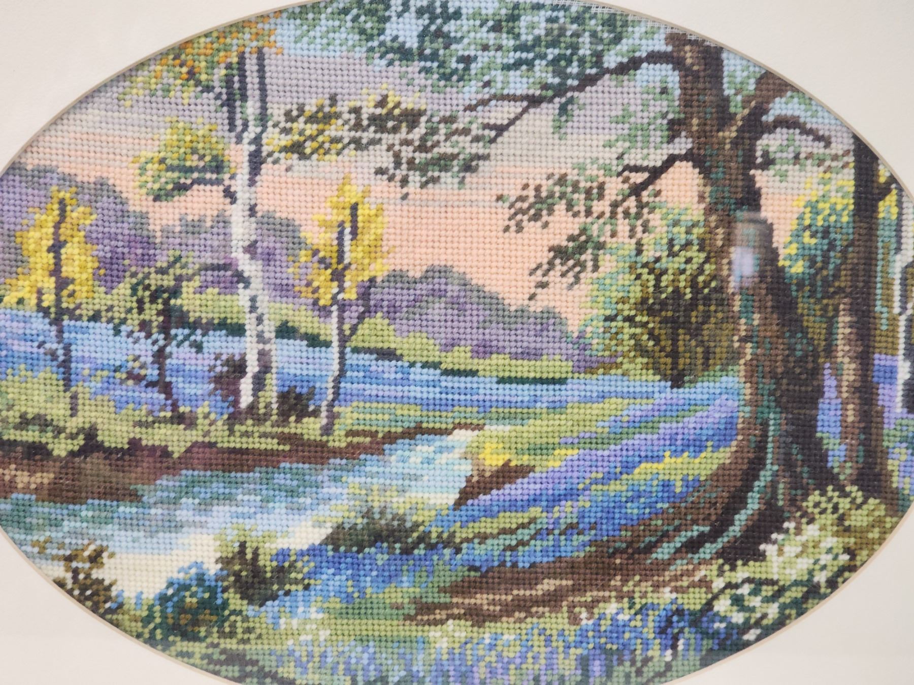 Cross Stitched landscape framed glass picture - 22"W x 17.5"H