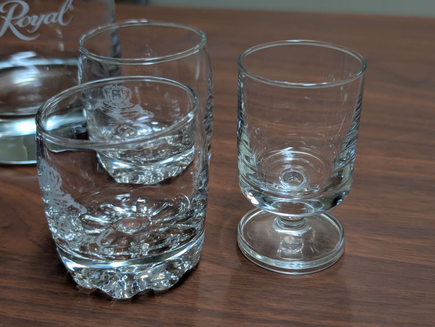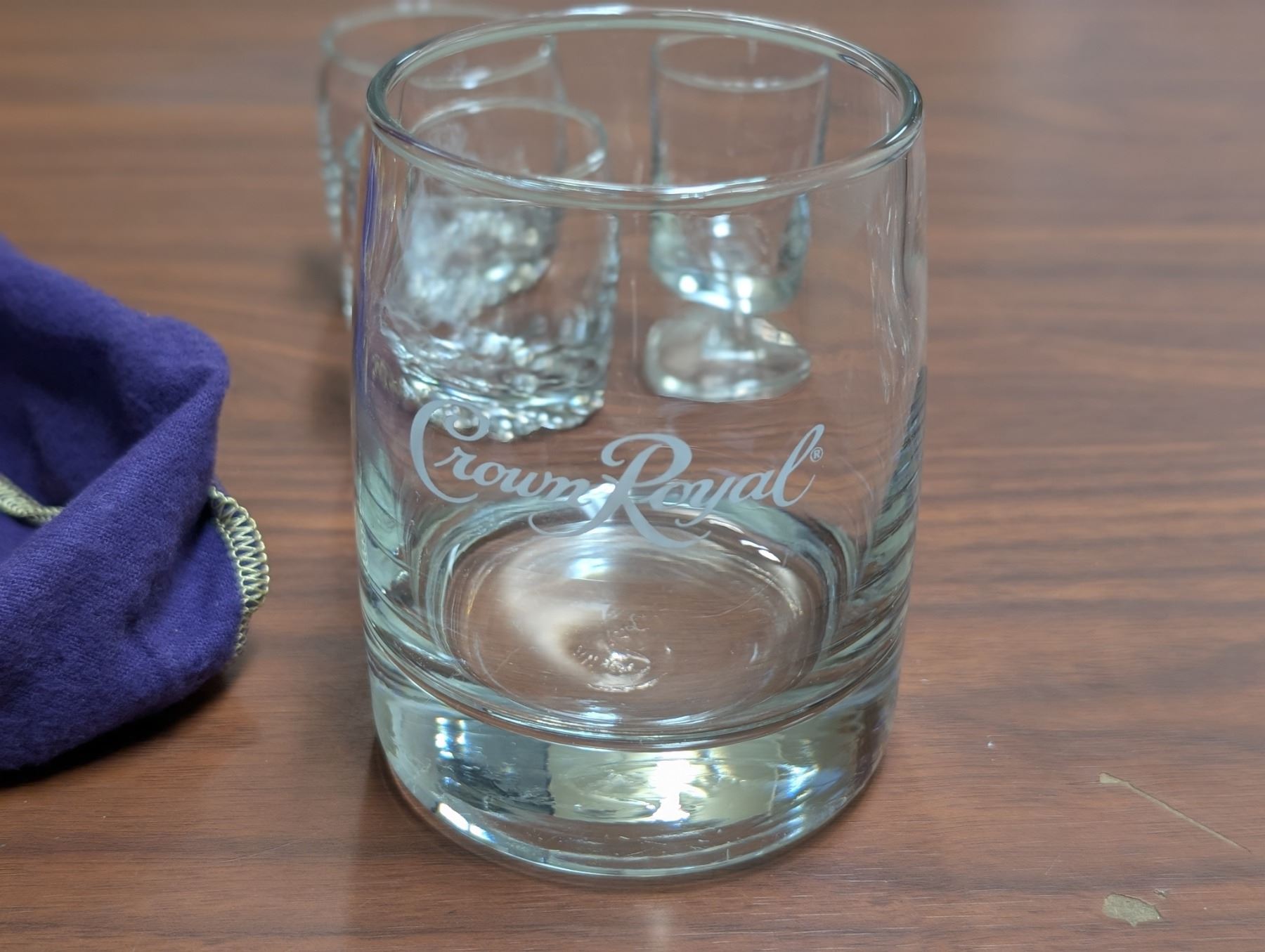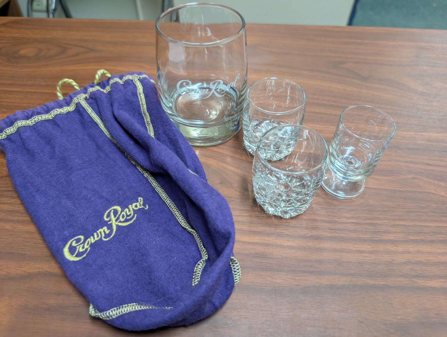 Crown Royal Set (3) Shot Glasses (1) Whisky Glass and Bag