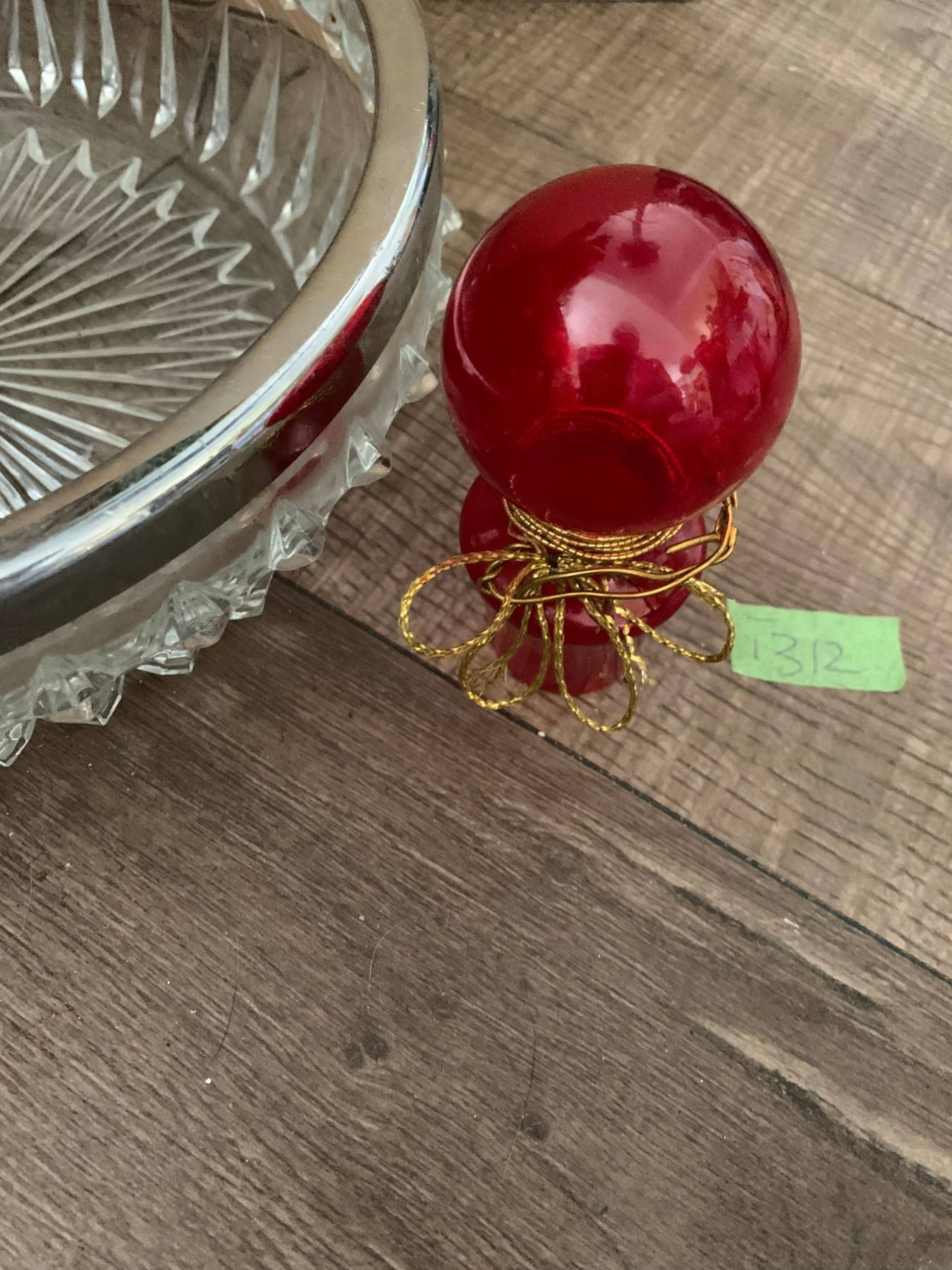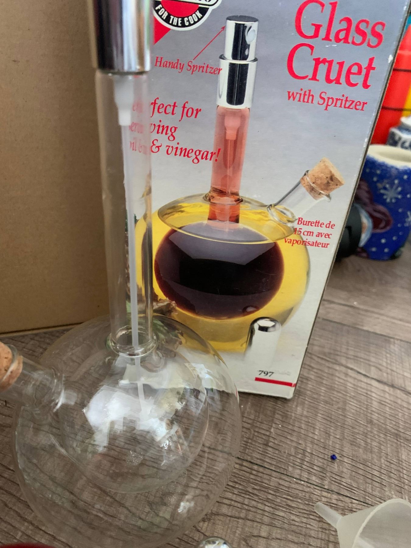 Crystal bowl , red glass bottle topper, a very unique oil and vinegar dispenser - new in box from 1980's