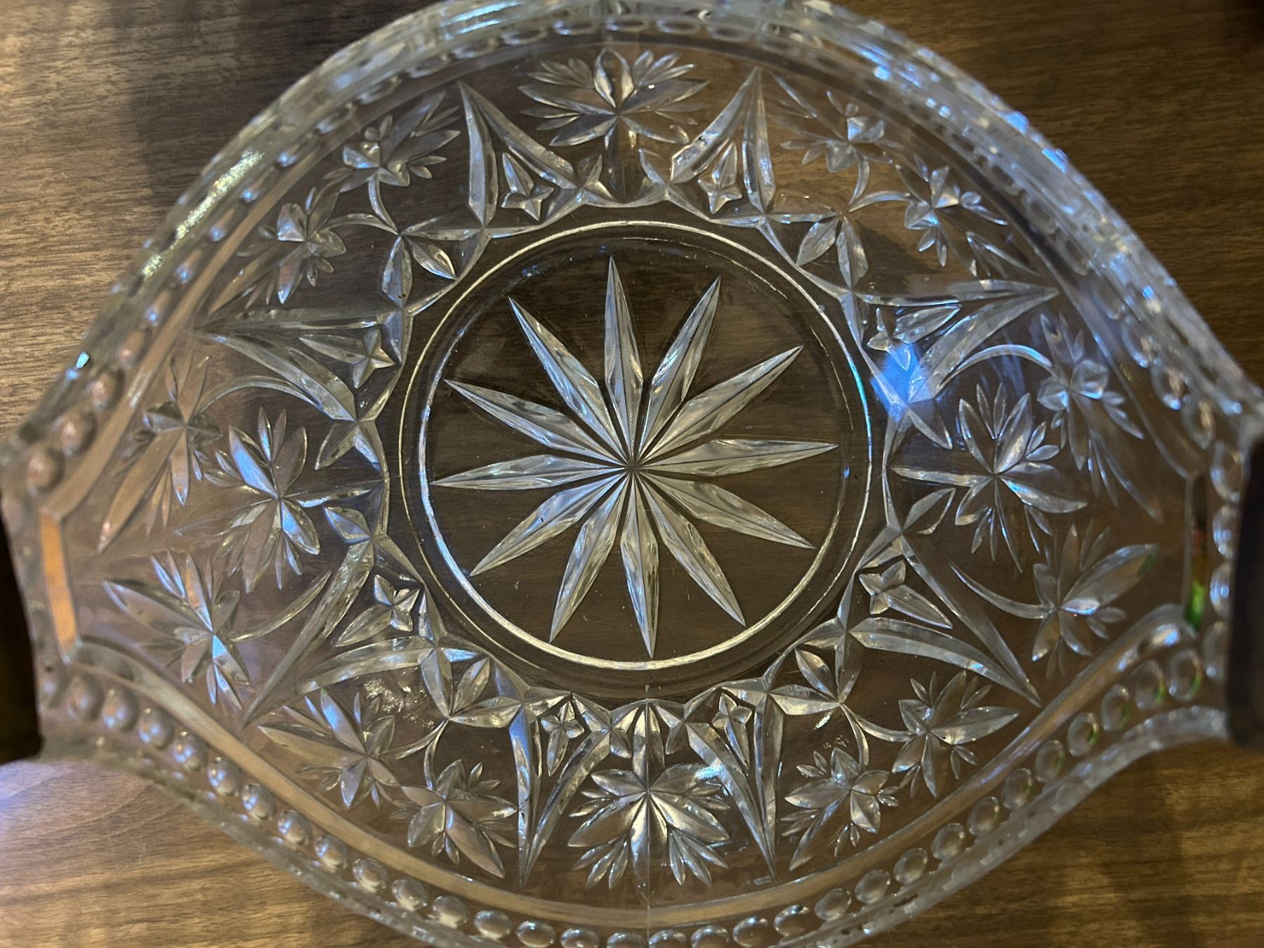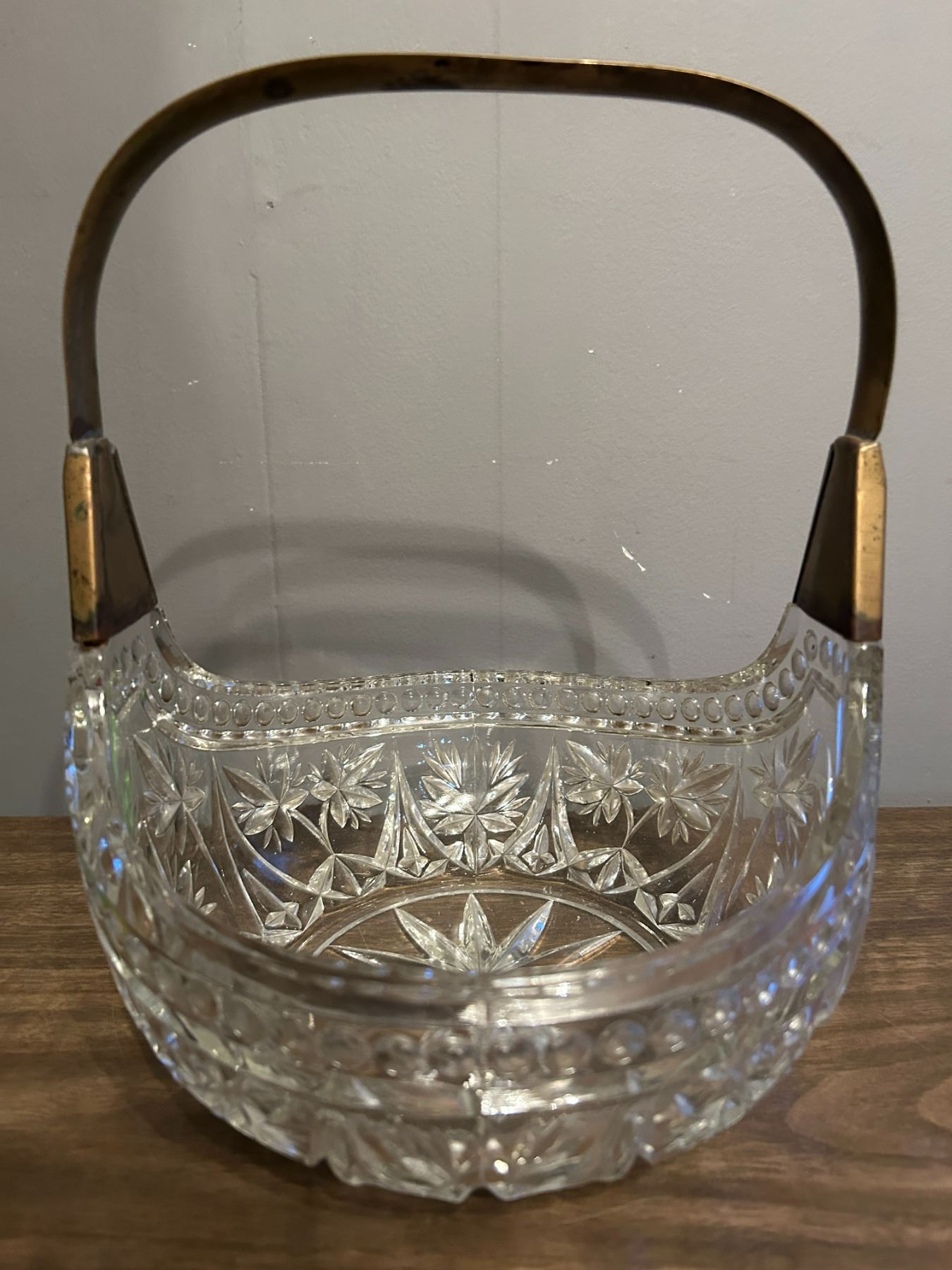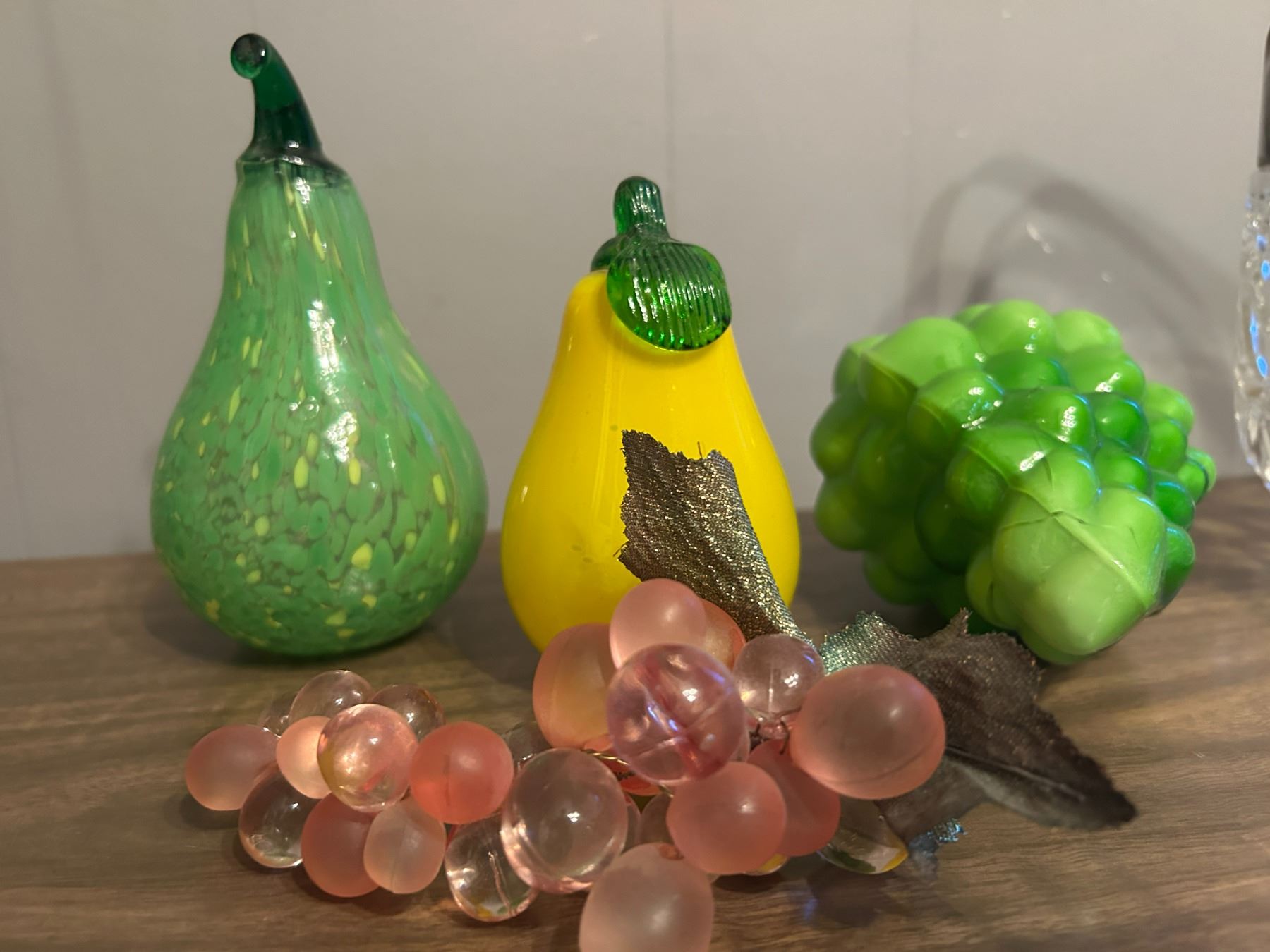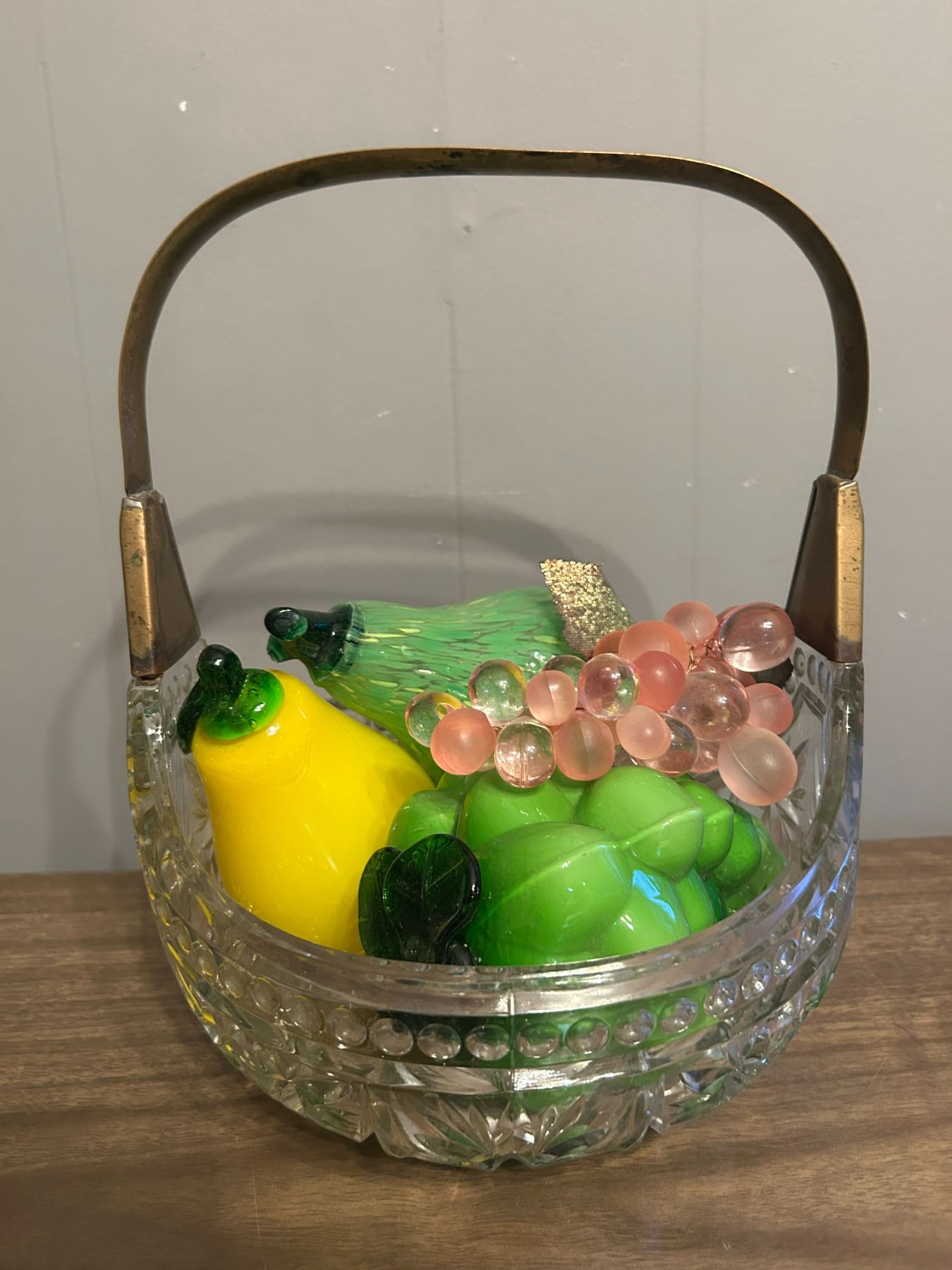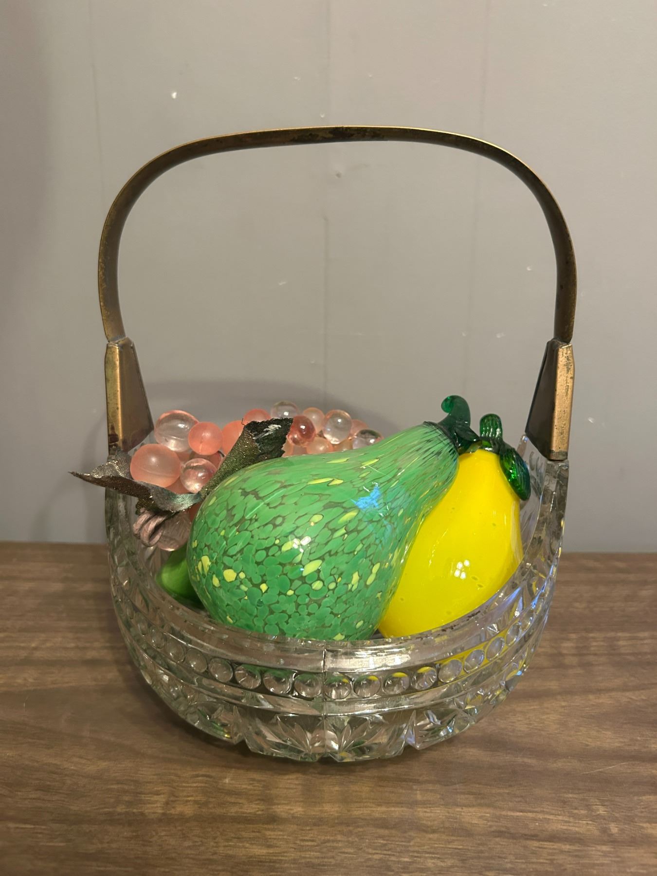 Crystal glass Basket with brass handle, blown heavy glass fruit ( pears and grapes)