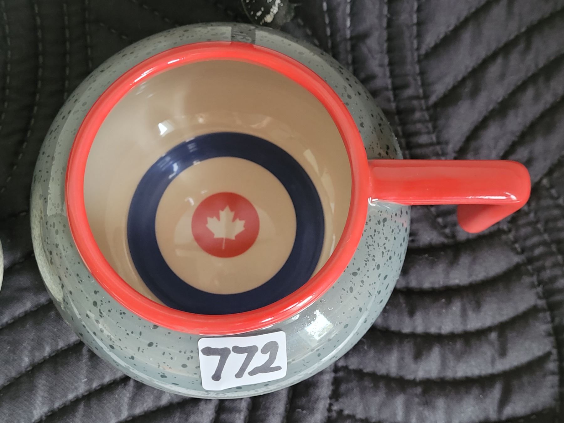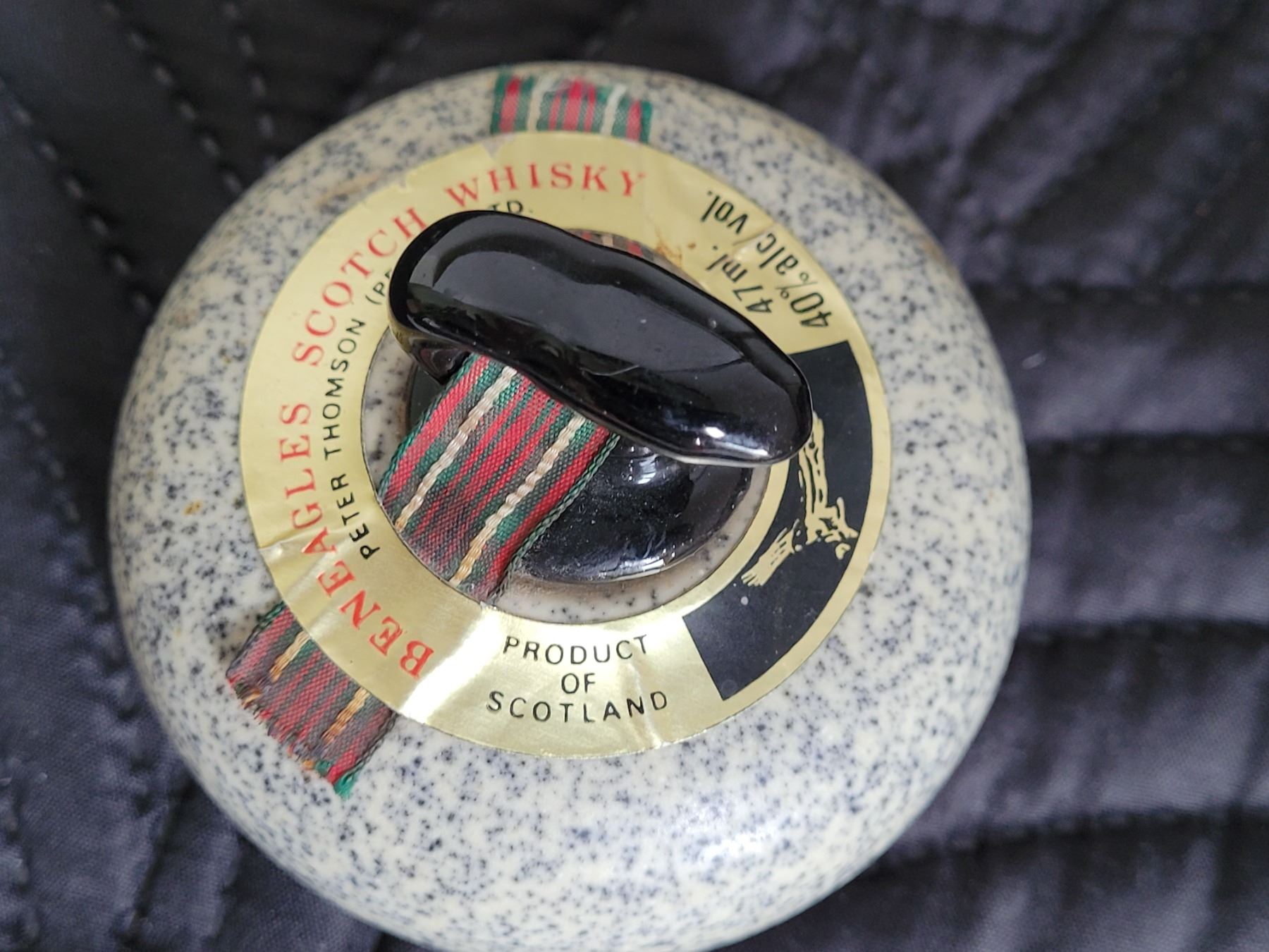 Curling coffee mug & Beneagles Scotch Whisky curling rock decanter.
