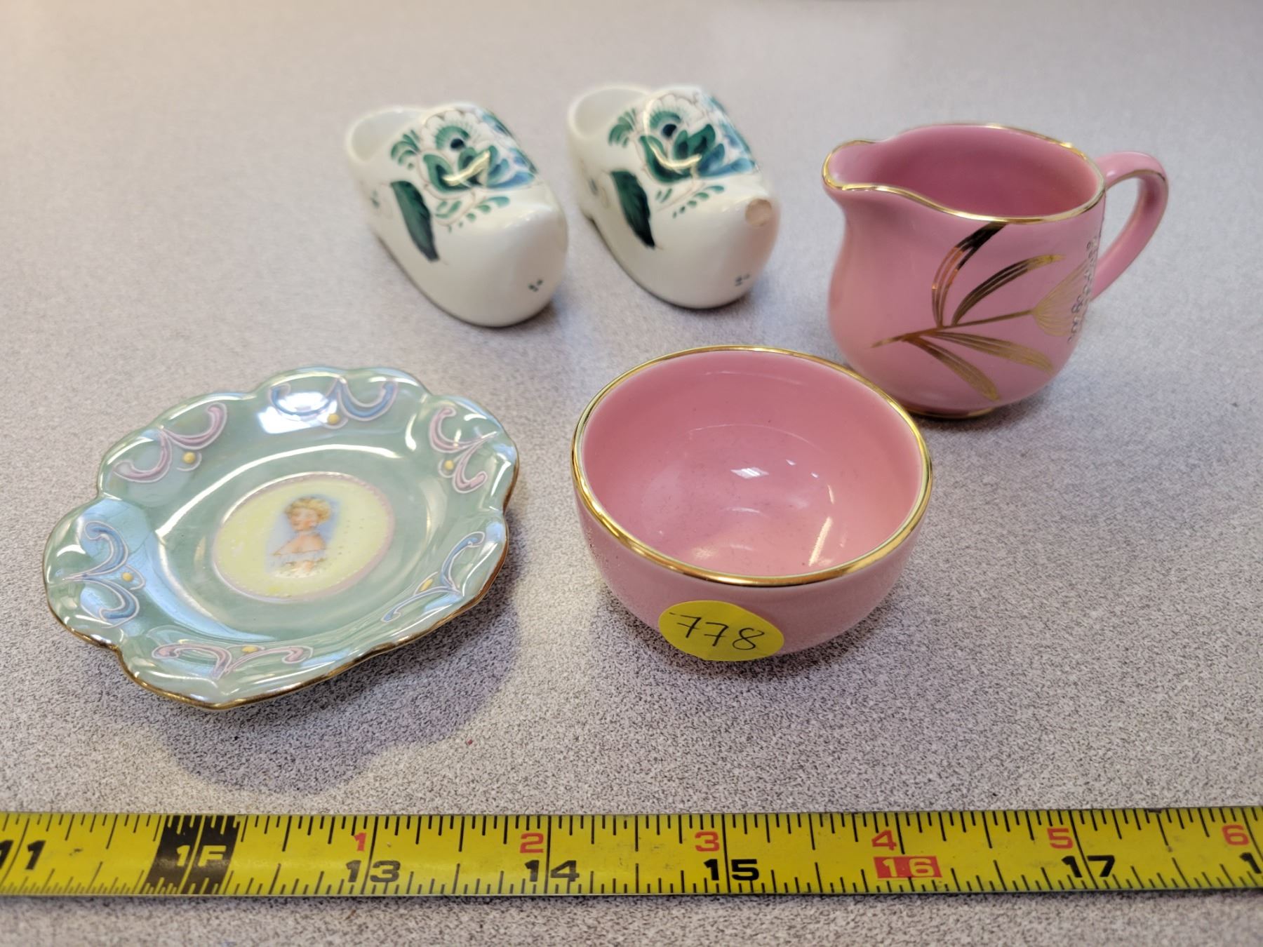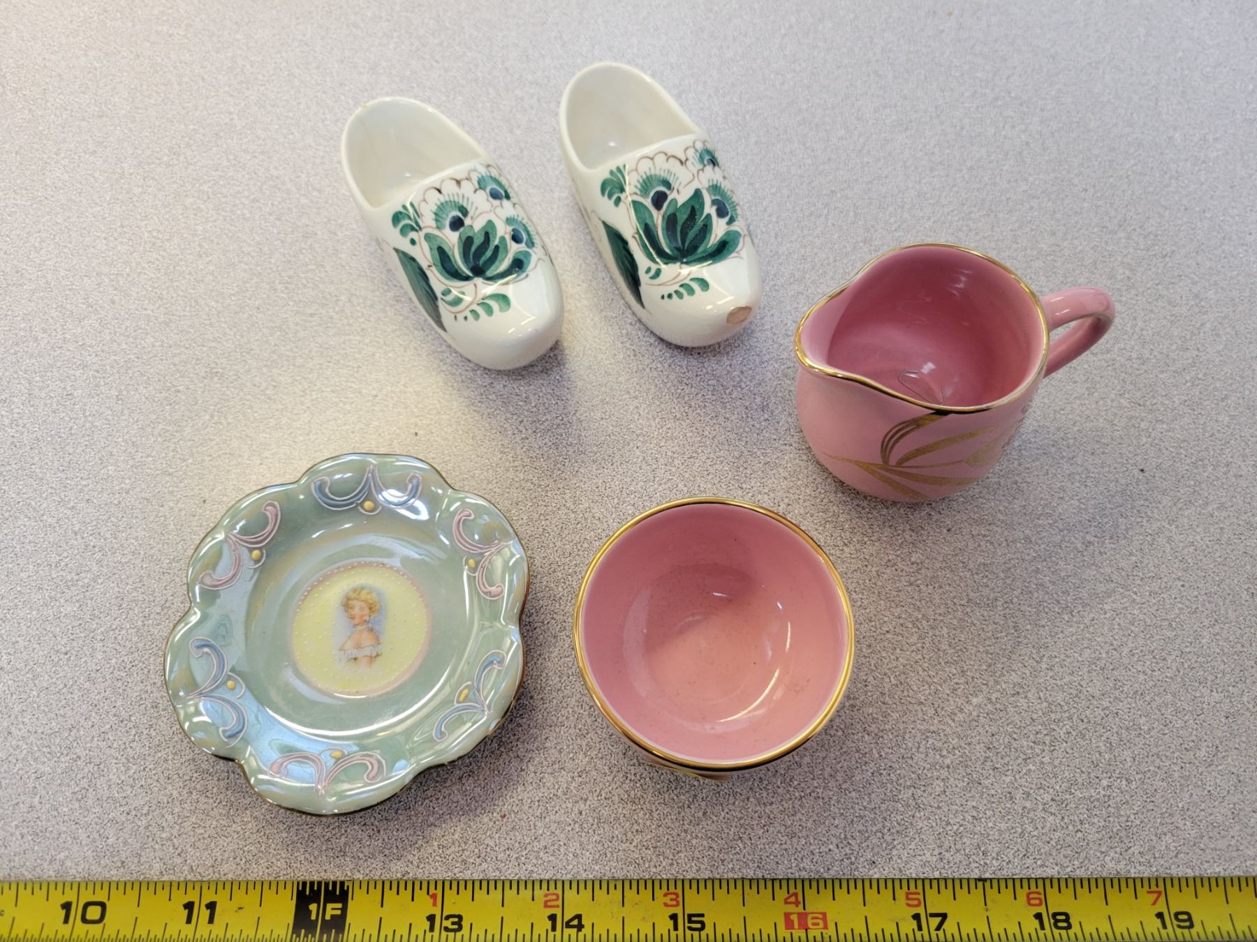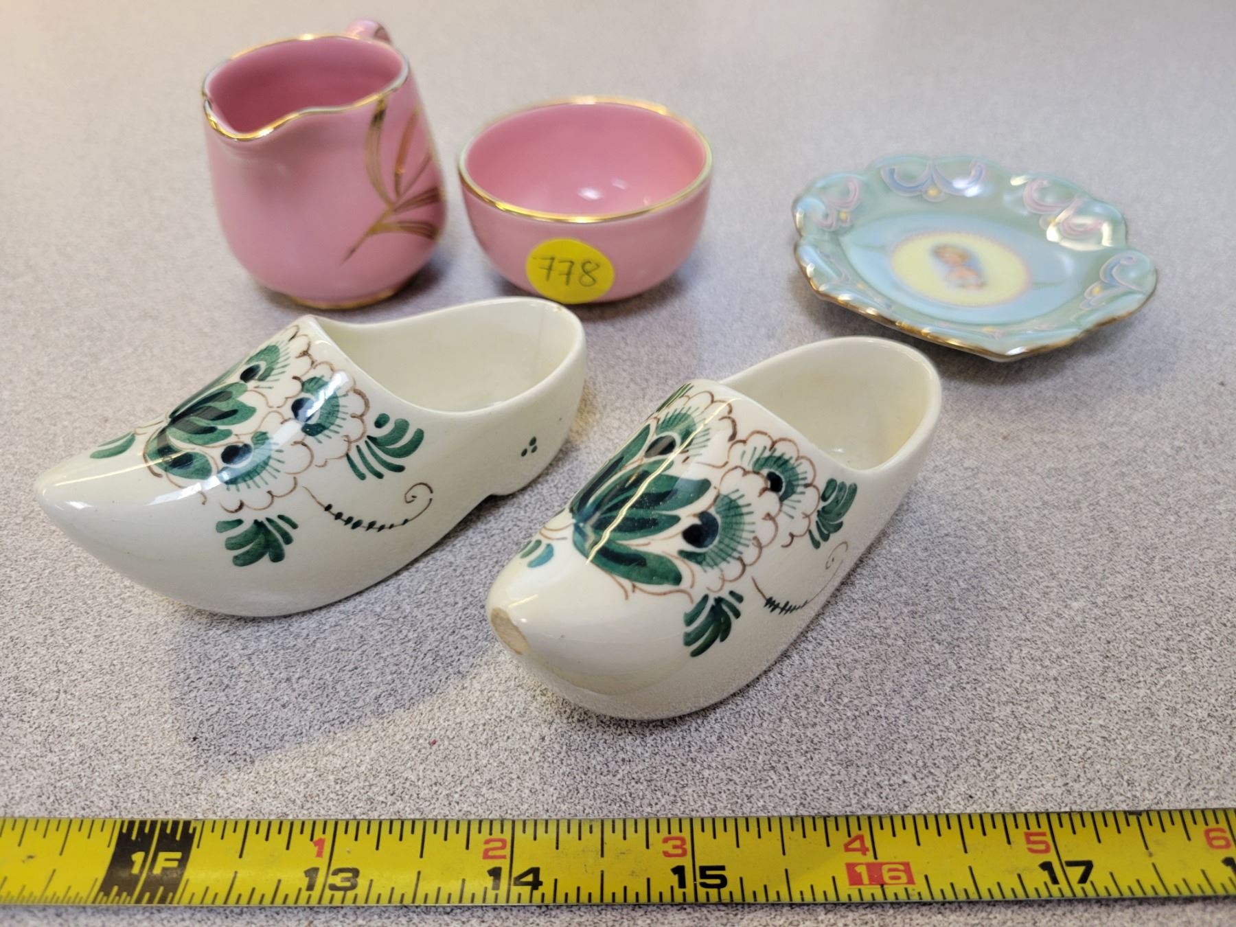 Cute trinket lot - Delft porcelain shoes, Old Foley cream & sugar, Hinode Japan miniplate