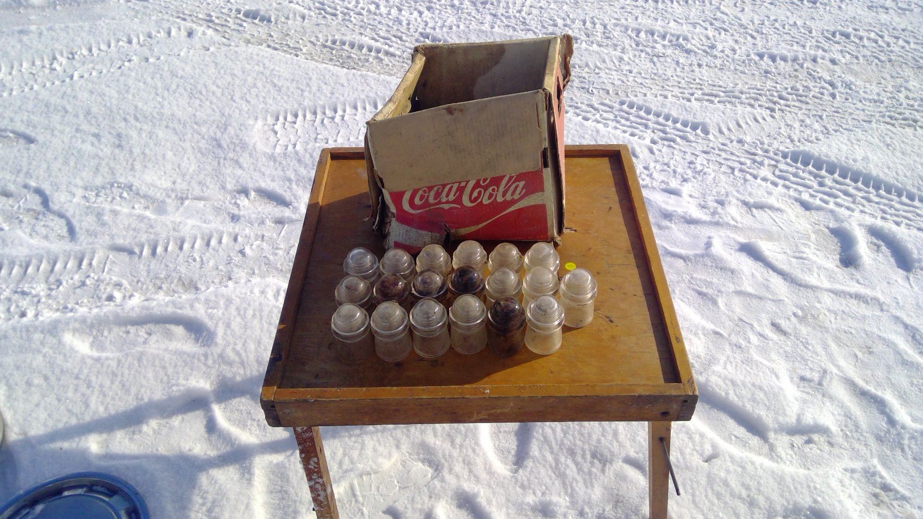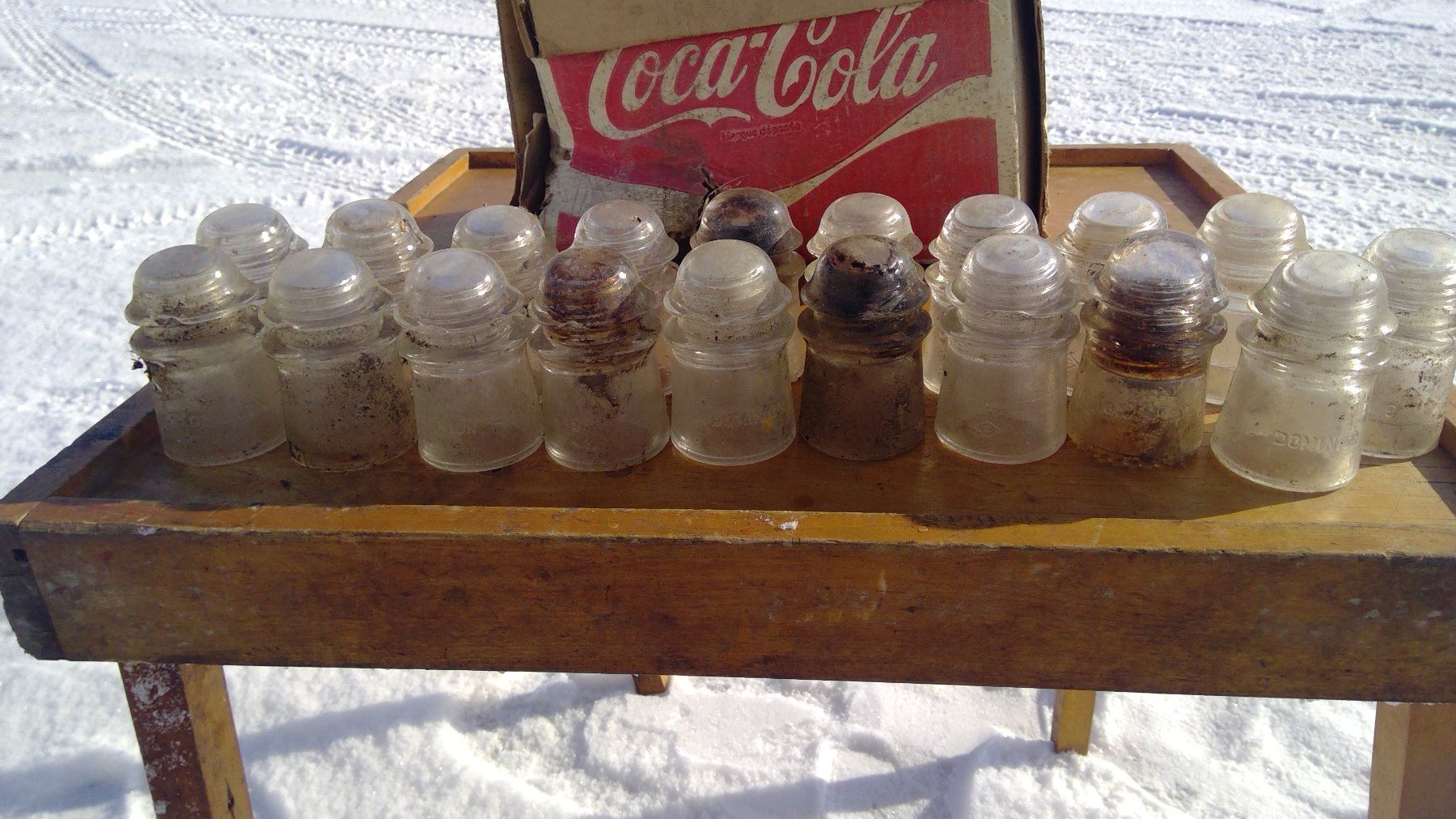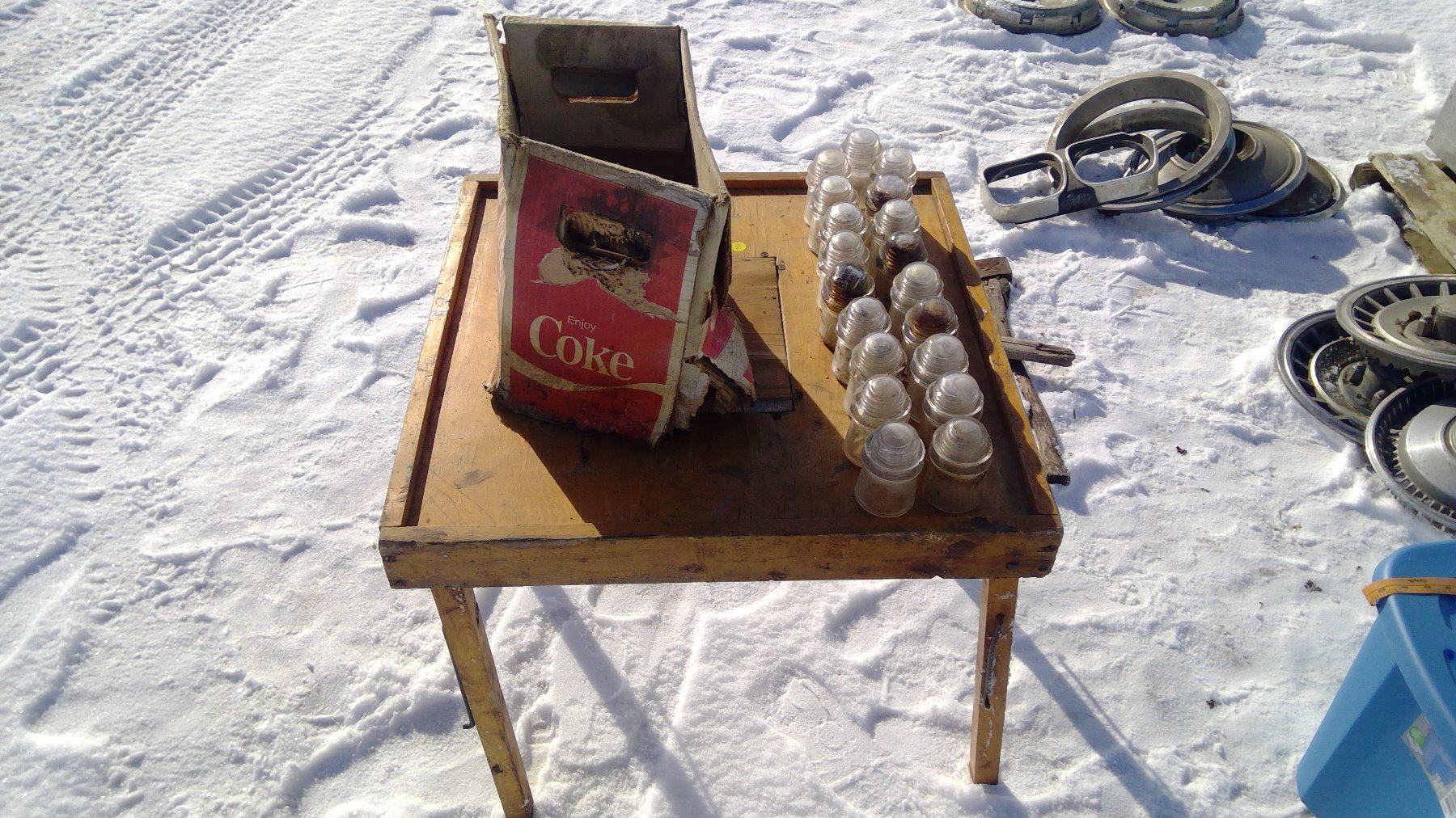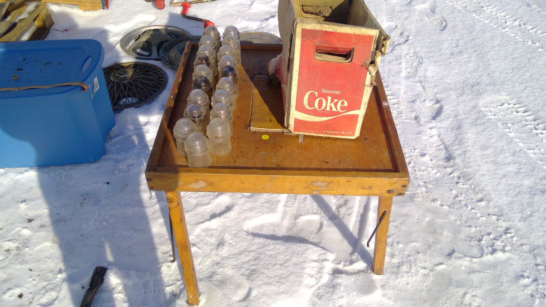 DAMAGED COKE BOX, 19- INSULATERS 9 HAVE CHIPS, & WOODEN FOLDING TABLE